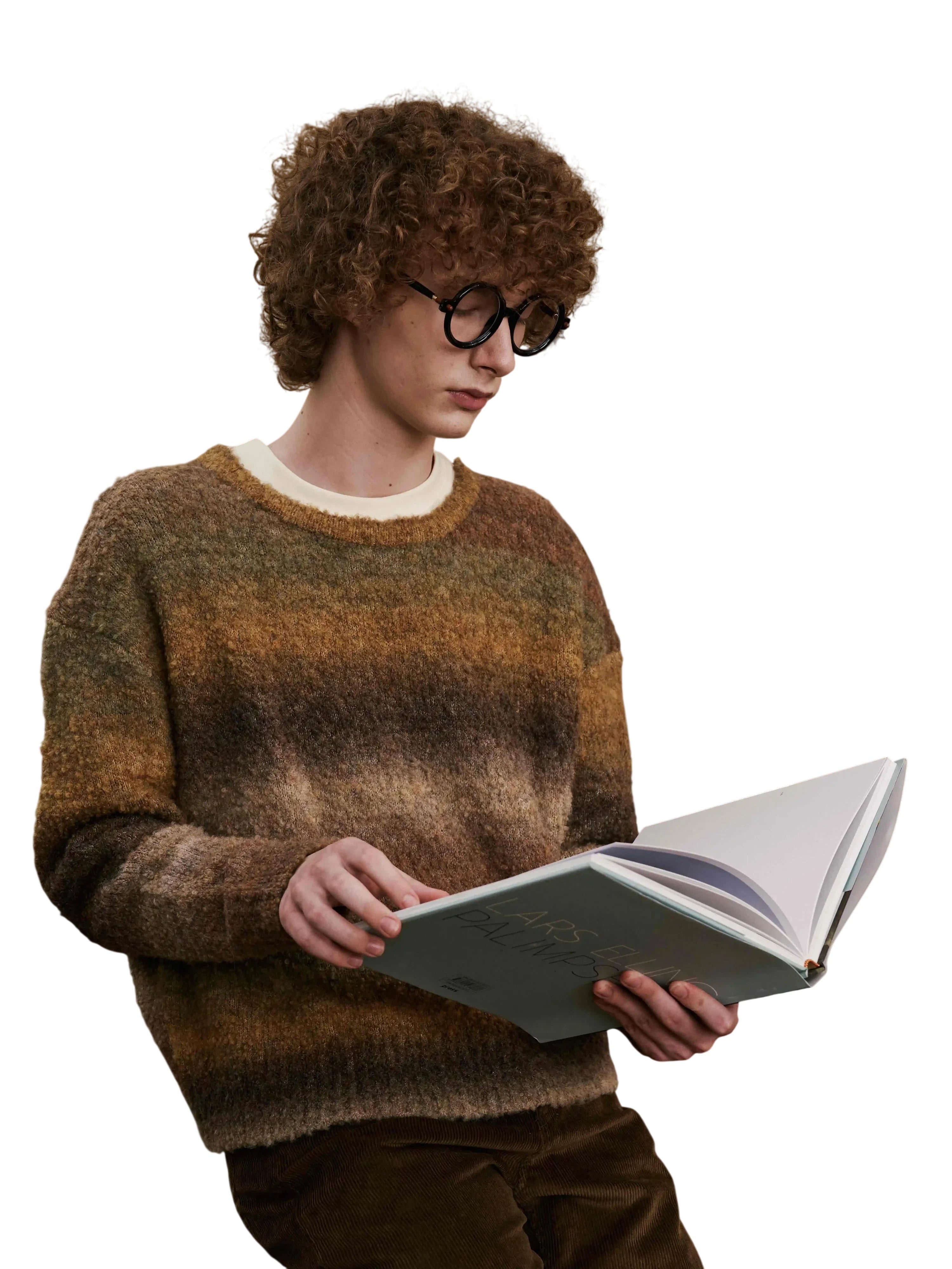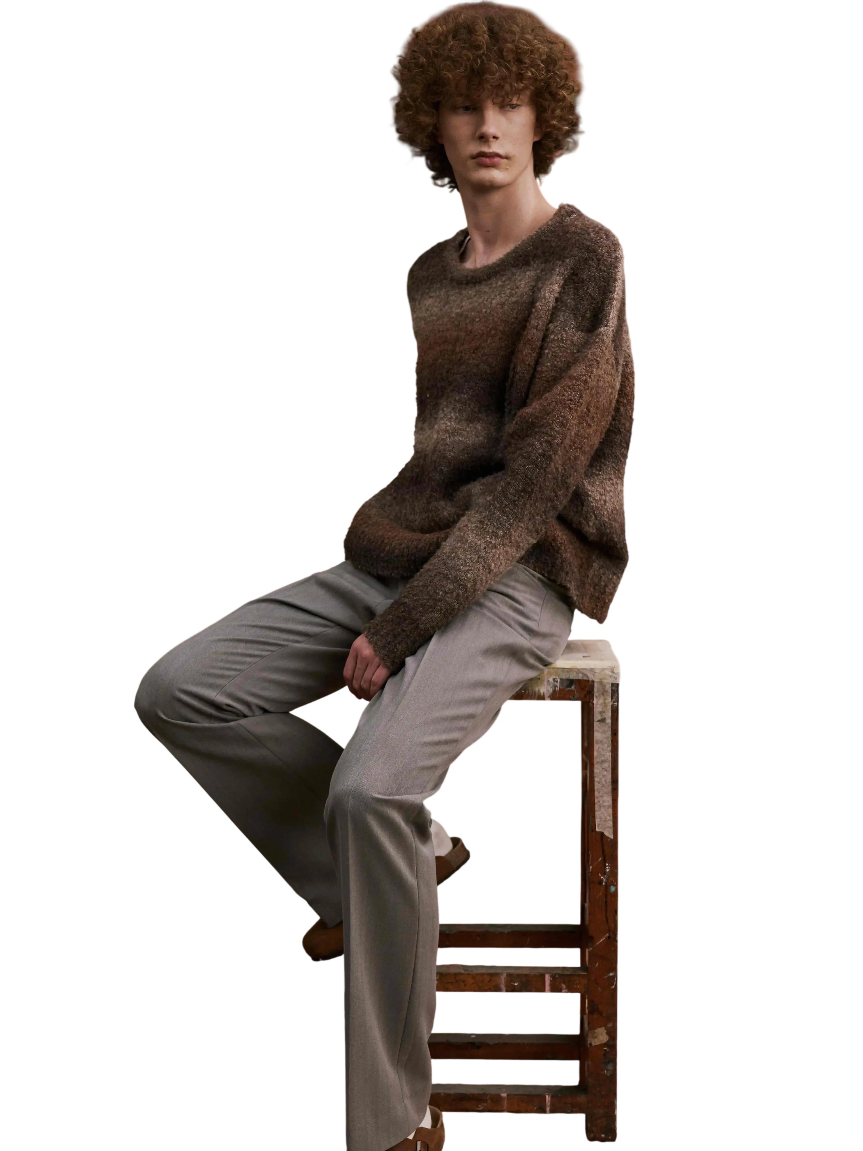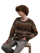 This men's gradient wool knit sweater features a loose, boxy silhouette ideal for autumn and winter wear. Designed with comfortable warmth in mind, the piece showcases a harmonious blend of earthy tones—brown, olive, and rust—arranged in horizontal stripes. Crafted for versatility, it pairs well with casual or semi-formal outfits, offering a stylish touch of seasonal color. Perfect for adding both comfort and visual interest to your cold-weather wardrobe.