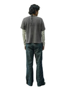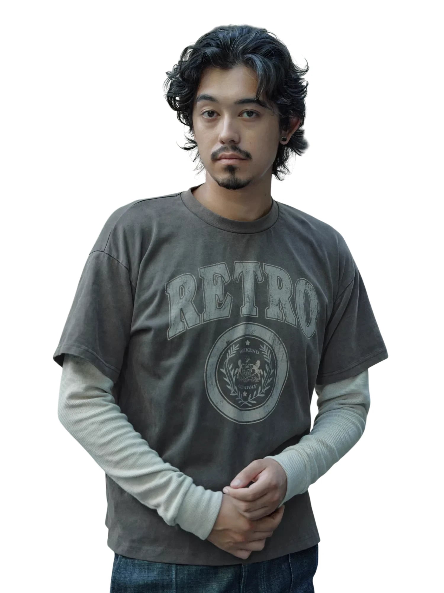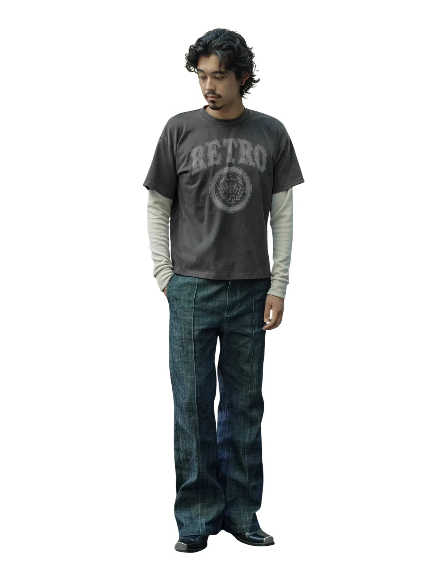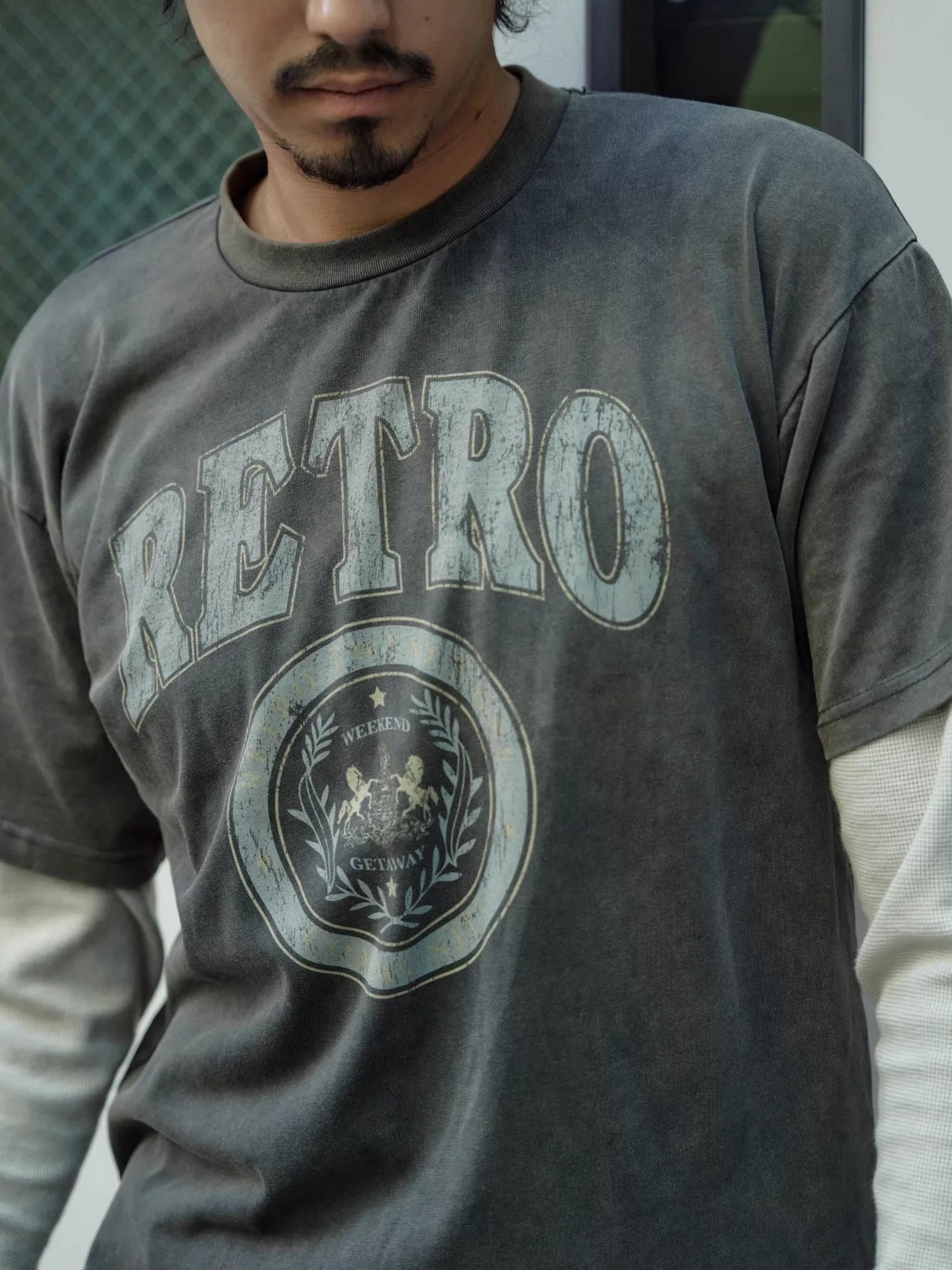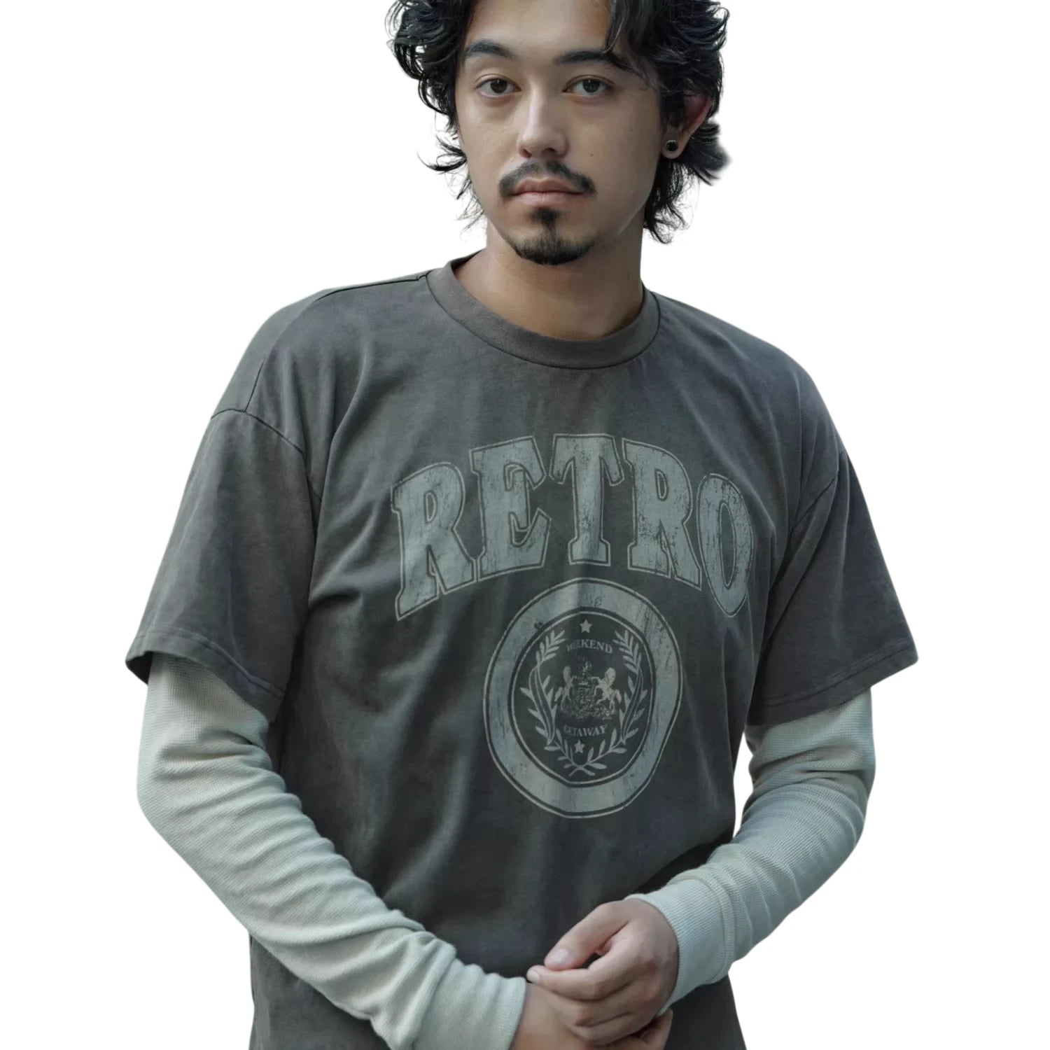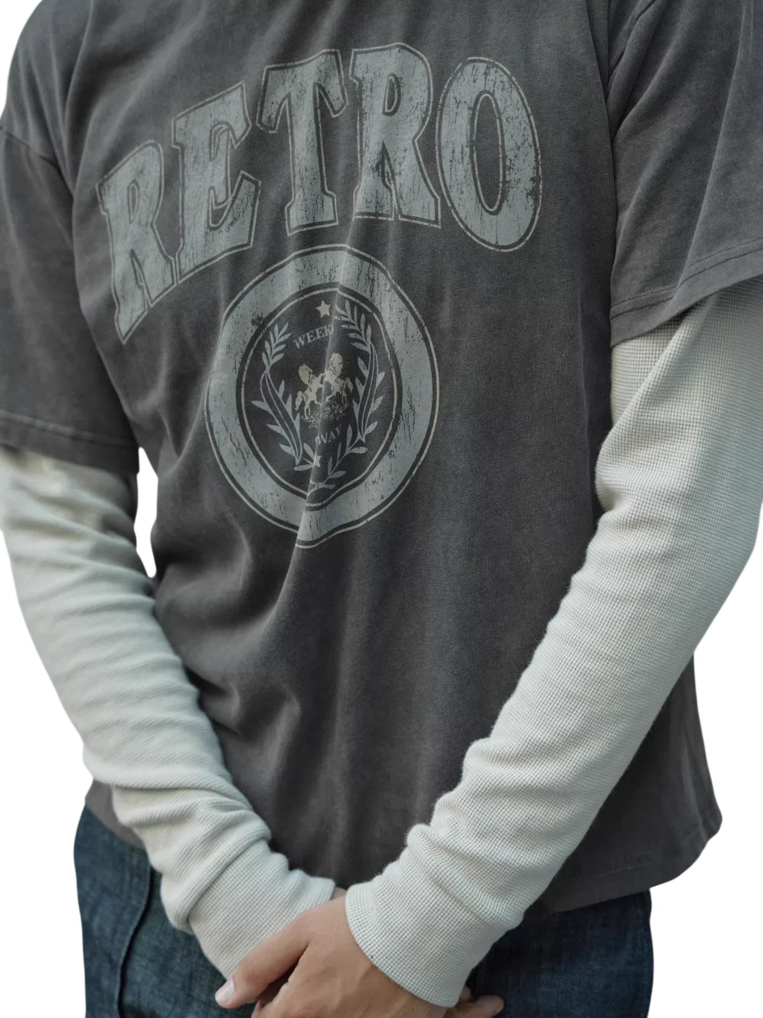 This men's long sleeve tee features a layered design with a light grey waffle-textured base under a dark grey short-sleeve top. The upper layer is printed with bold, distressed-style text reading 'RETRO' and a circular crest graphic that includes the phrase 'Weekend Getaway,' offering a vintage-inspired streetwear aesthetic. Ideal for casual, everyday wear.