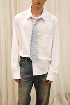 Styled with a loosely tied striped necktie and paired with medium-wash denim jeans, this shirt is ideal for achieving an effortlessly polished, yet laid-back appearance.
