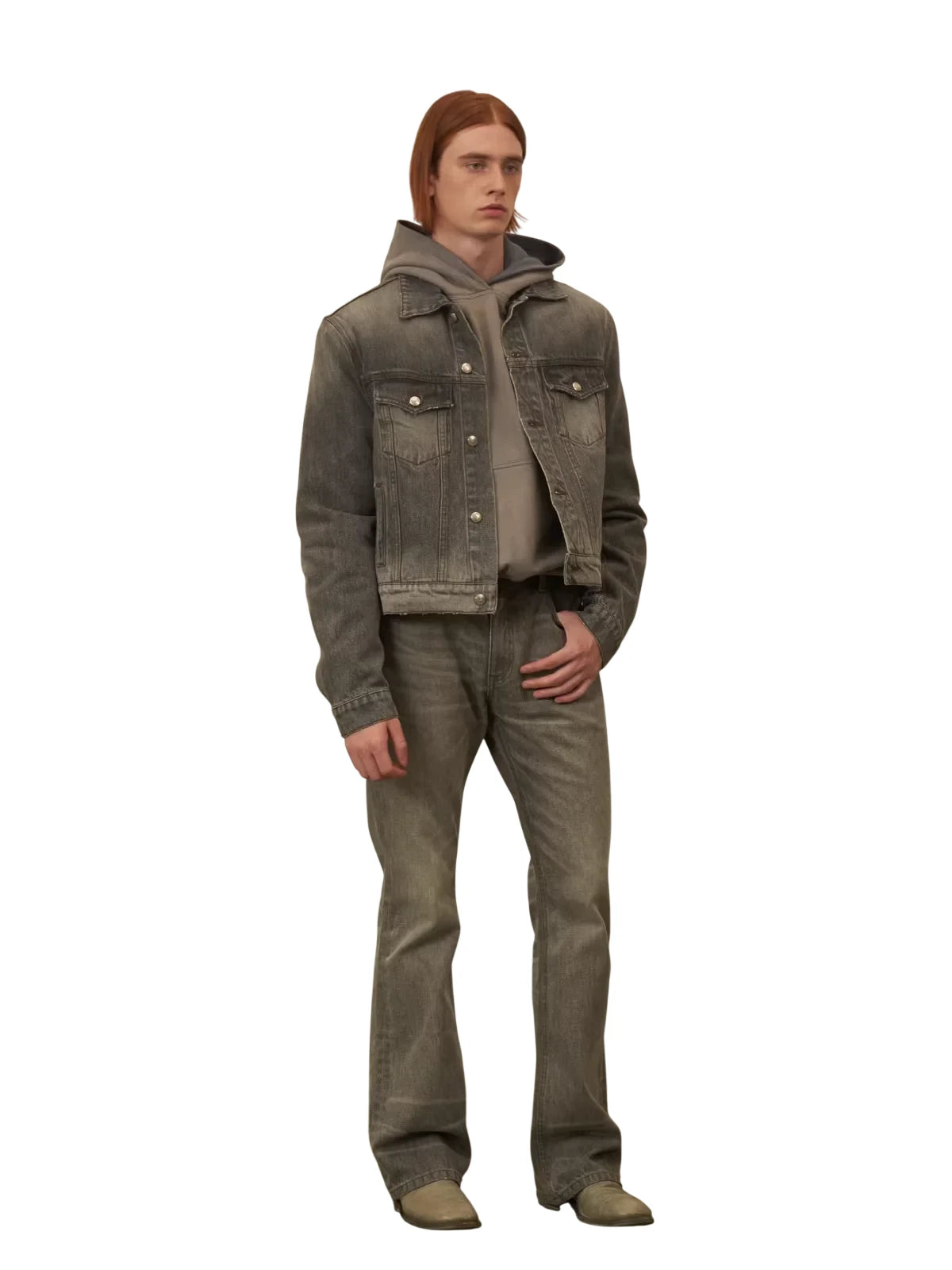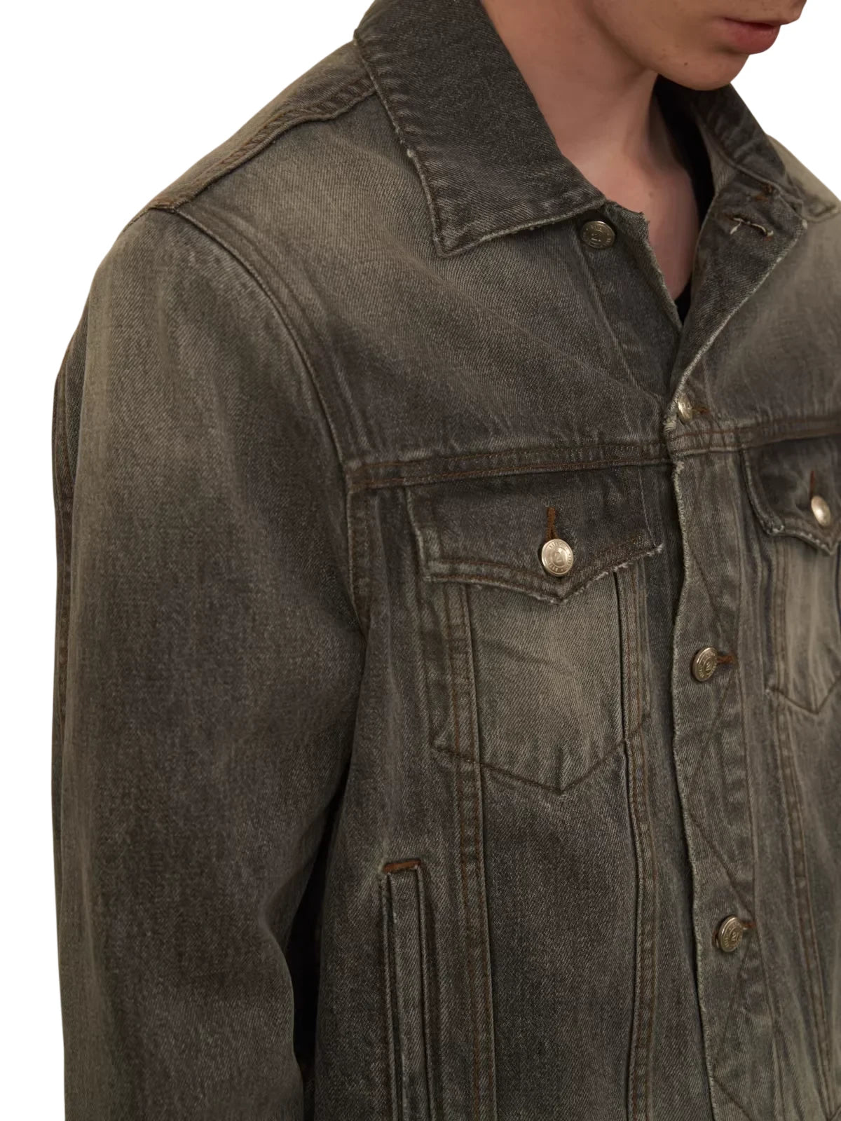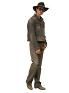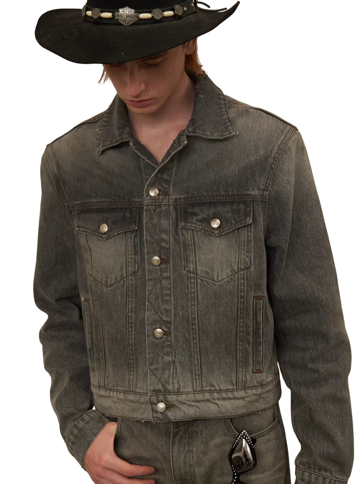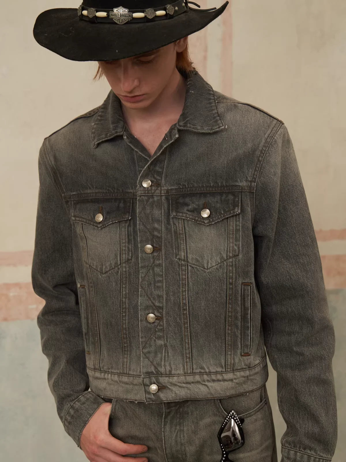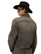 Elevate your seasonal wardrobe with this men's distressed denim jacket, designed in a classic black-gray wash. Featuring a versatile silhouette with a button-up front, chest flap pockets, and side hand pockets, this jacket combines rugged style with a modern edge. Removable shoulder pads add a customizable structure, while the vintage-inspired wash gives it a worn-in appeal perfect for autumn and winter layering.