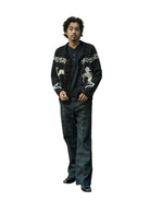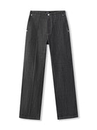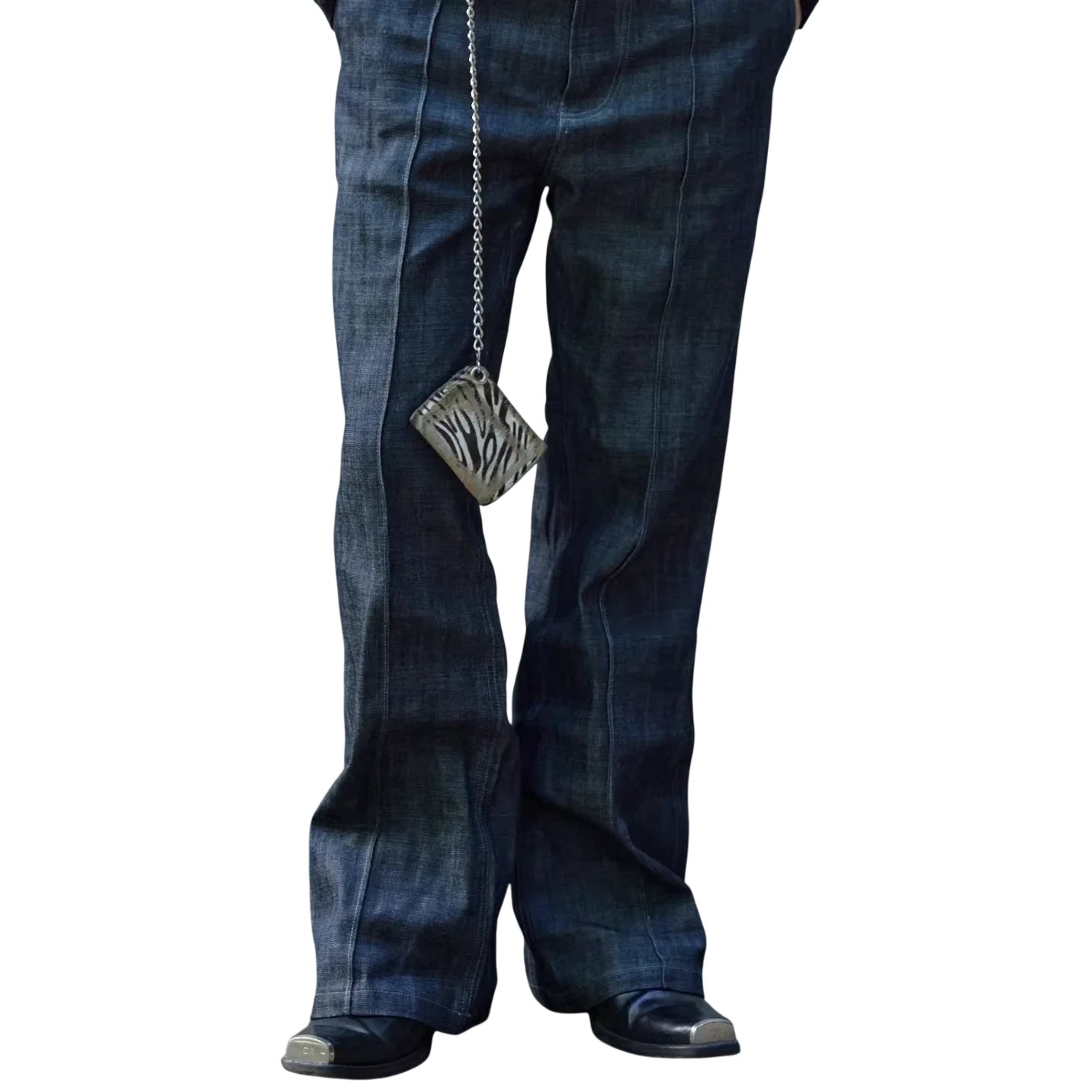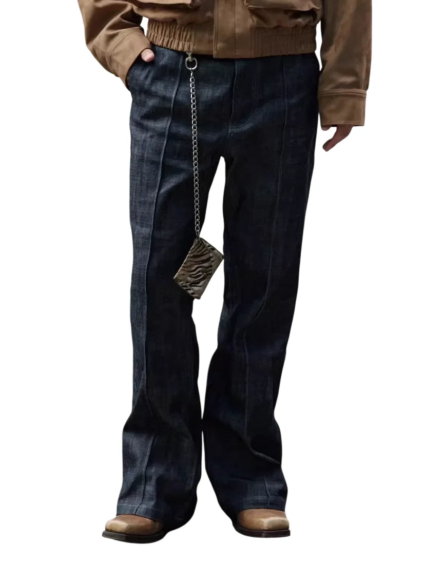 Elevate your streetwear look with these men's dark-washed raw denim jeans. Offering a slightly loose, flared silhouette, they feature clean midline seam detailing down the front for a refined, tailored appearance. Perfect for casual or edgy styling, these jeans bring together comfort and contemporary design in one essential piece.