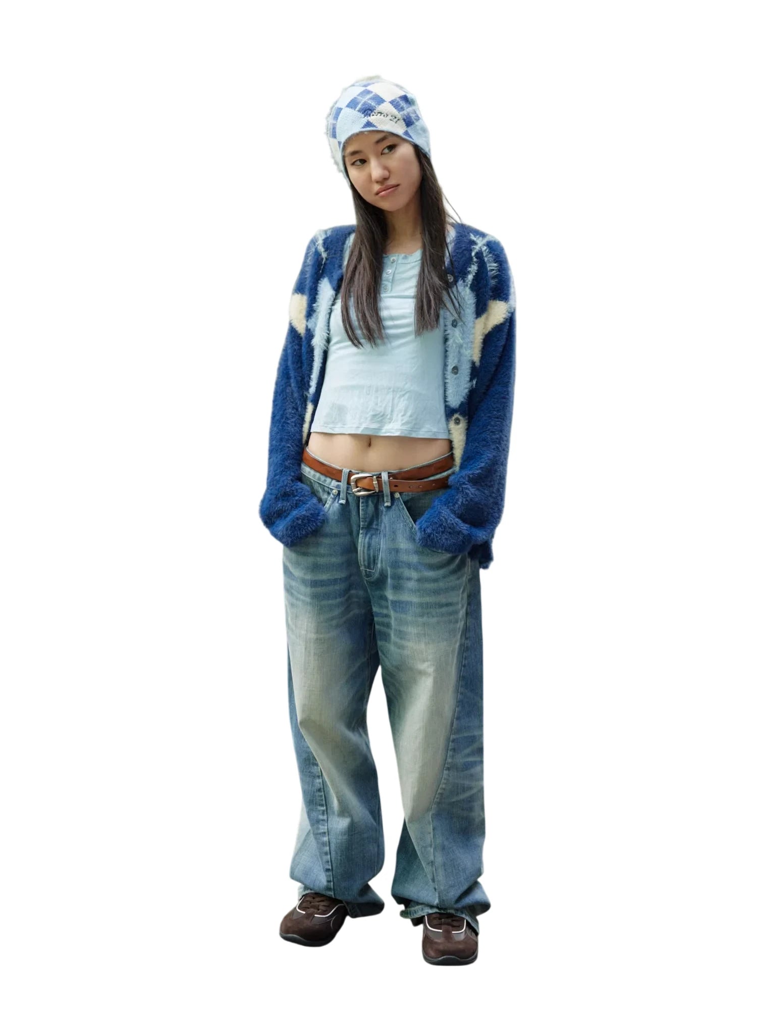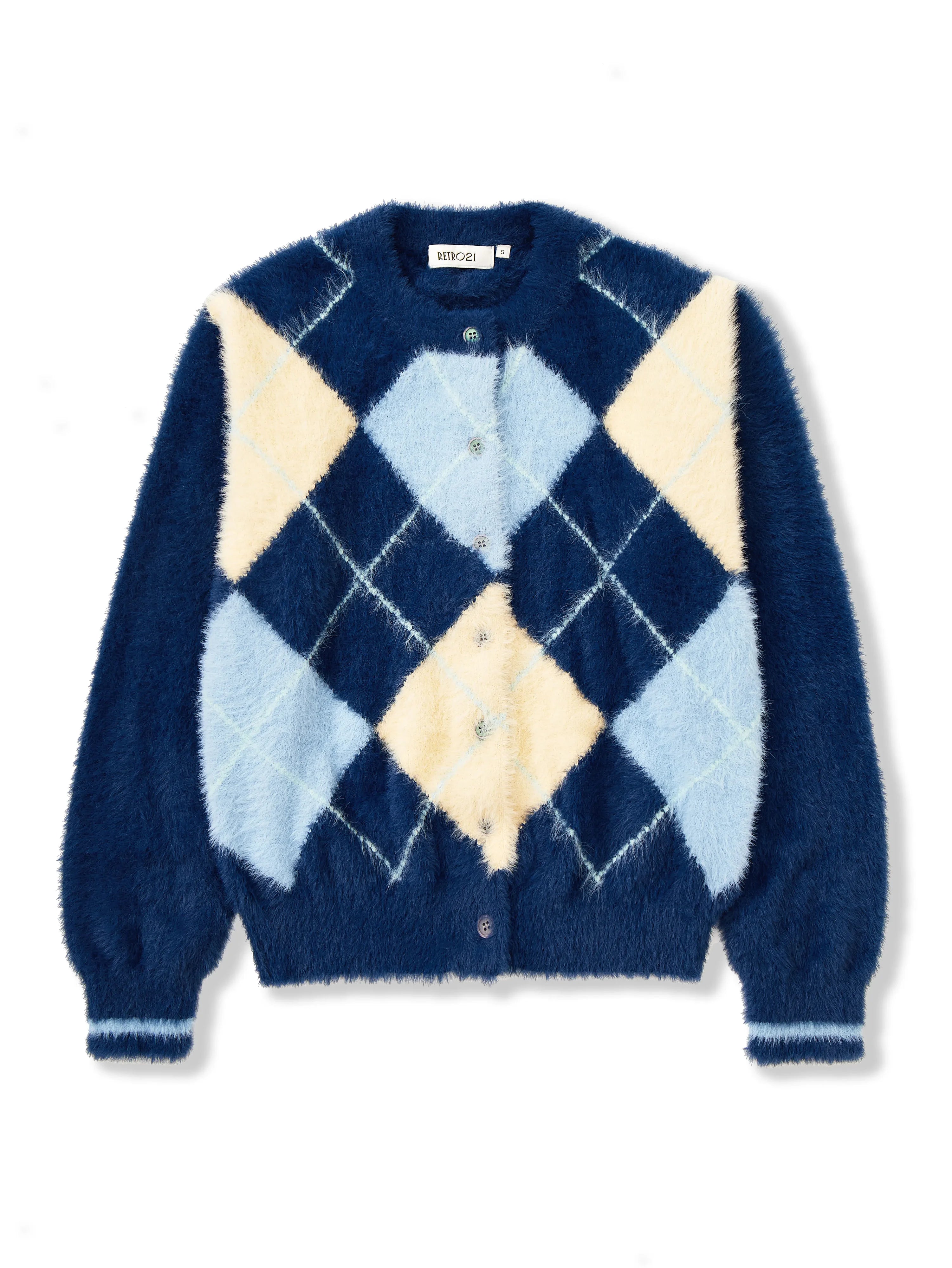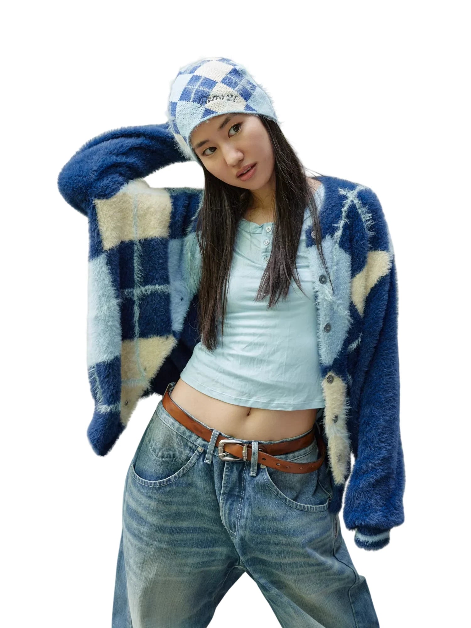 Elevate your casual style with this men's knitted cardigan featuring a bold diamond argyle pattern in light blue and cream tones. Crafted with soft faux mink for ultimate comfort, this oversized long sleeve jacket offers a relaxed fit perfect for layering. The deep blue base color adds a vintage flair, making it an ideal piece for street-style looks or everyday wear.