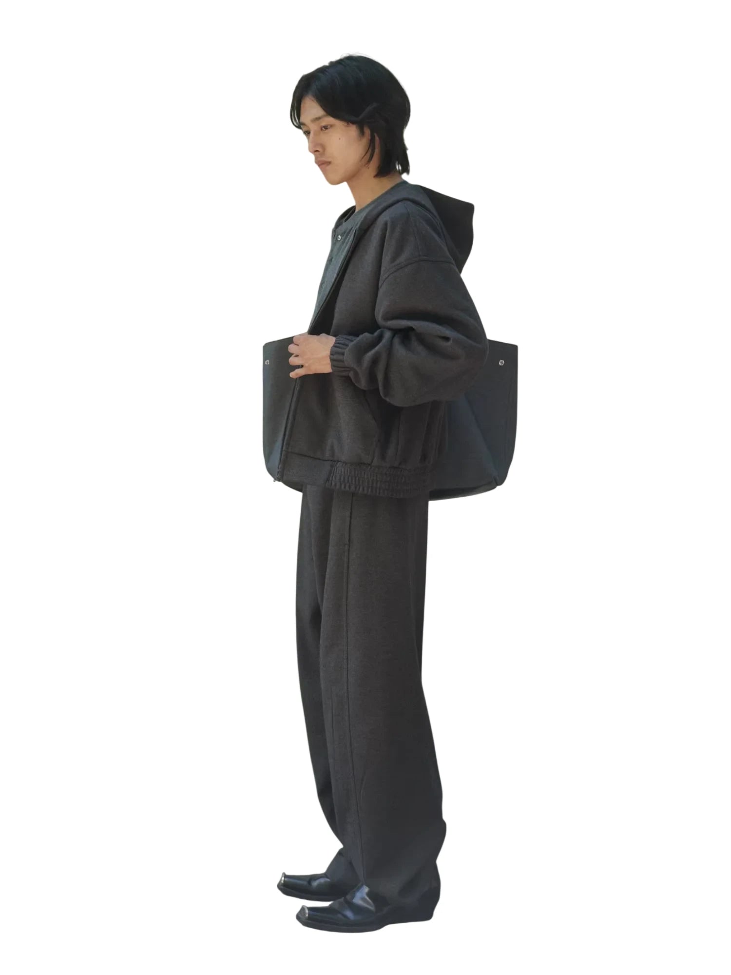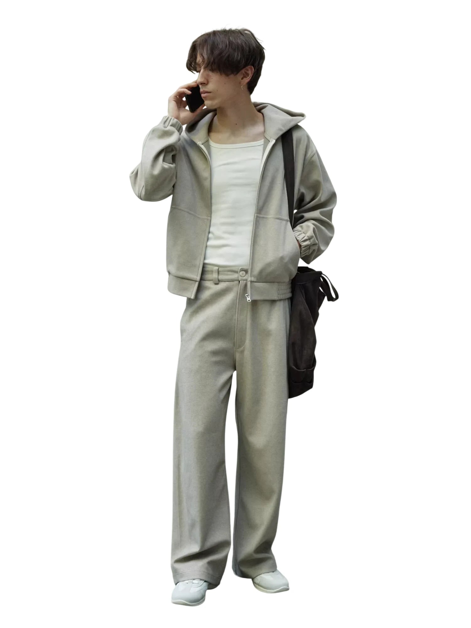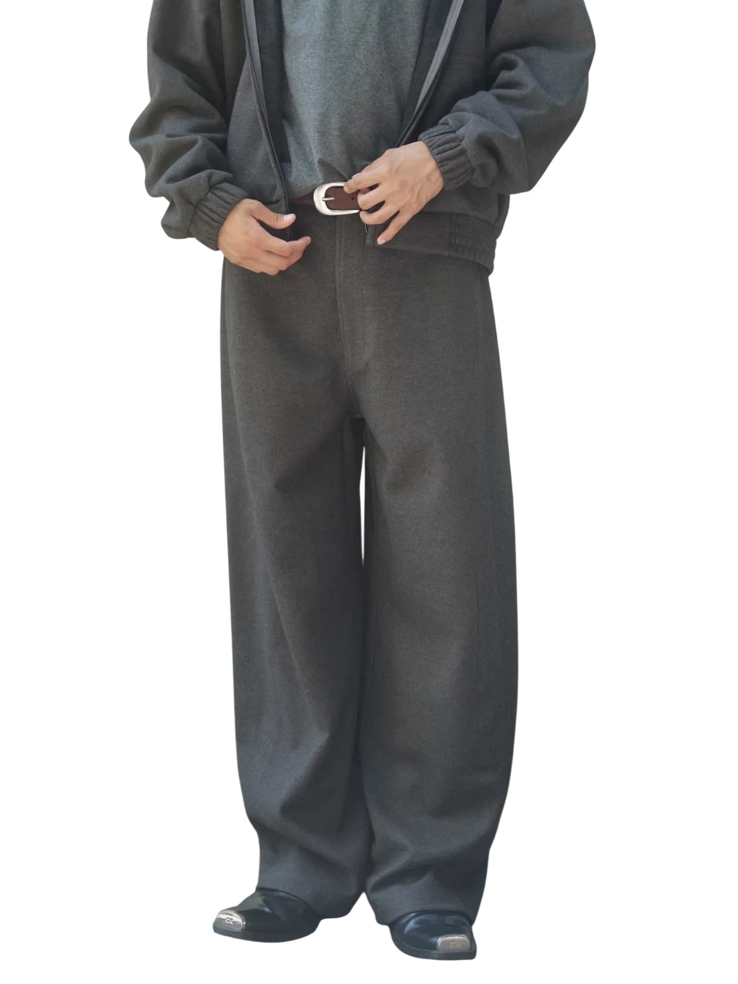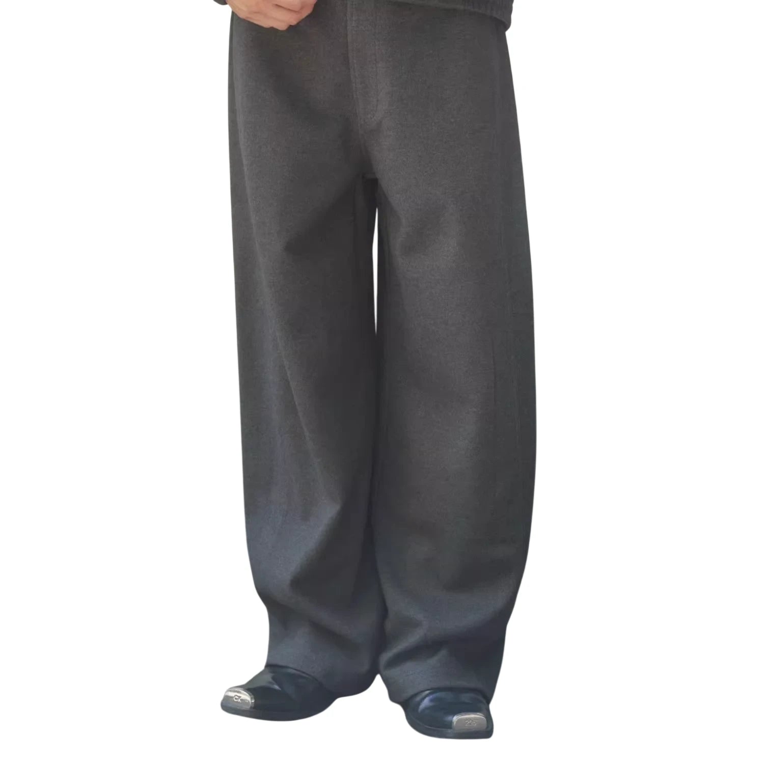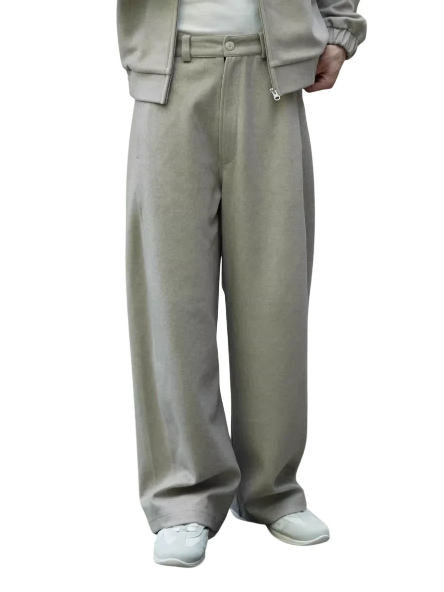 These men's sweatpants feature a comfortable and oversized fit, crafted from thick, brushed fabric for a soft and structured feel. Designed with a wide-leg silhouette and curved-cut drape, they offer a relaxed, modern style perfect for casual wear. The mid to high rise fit and minimalist design ensure versatile pairing with various outfits.