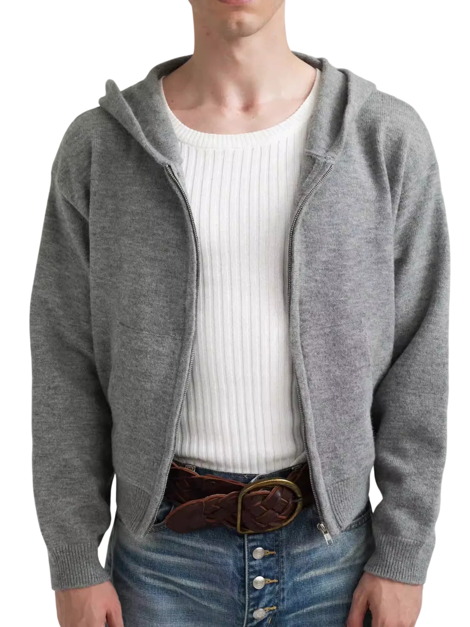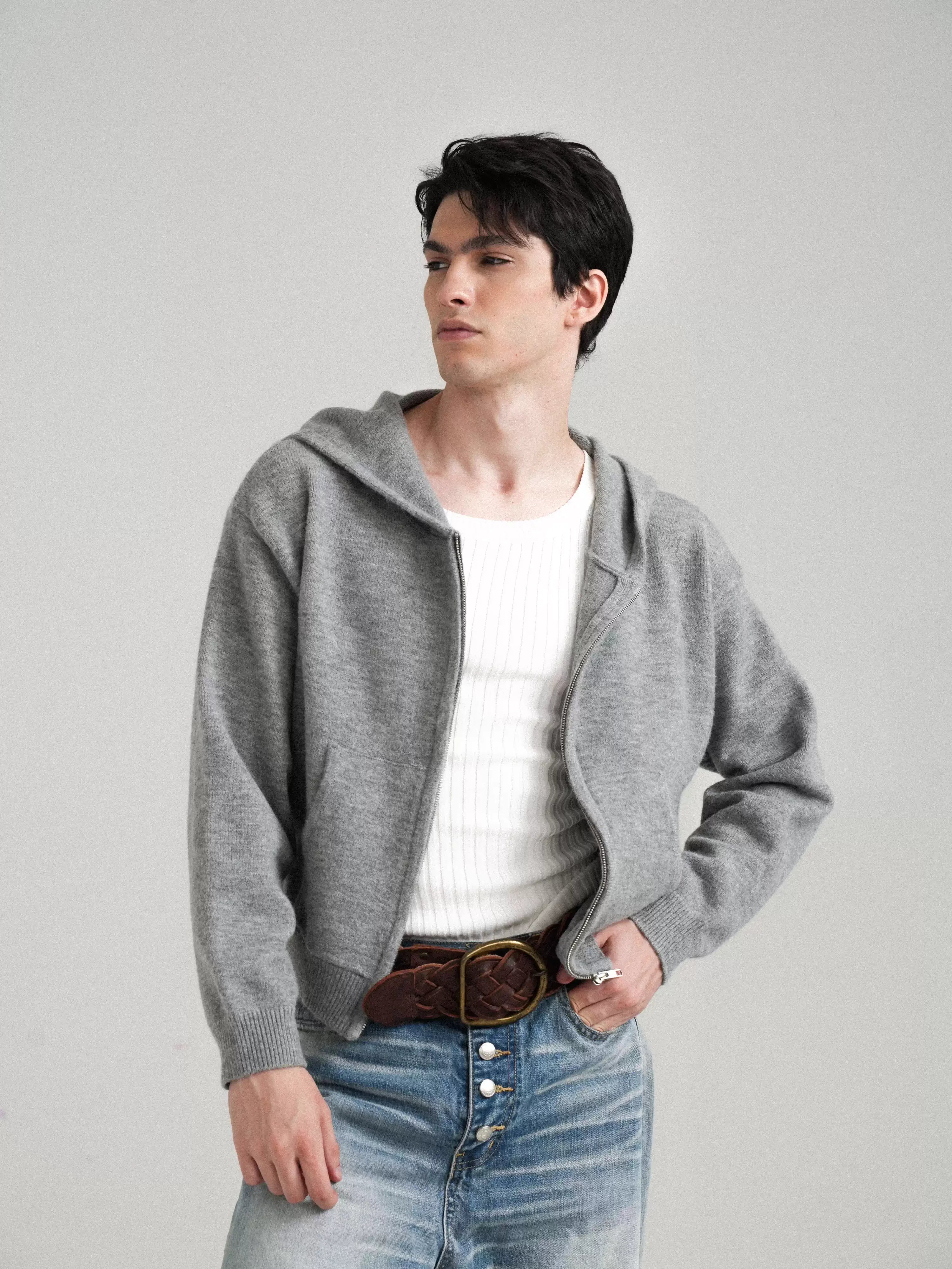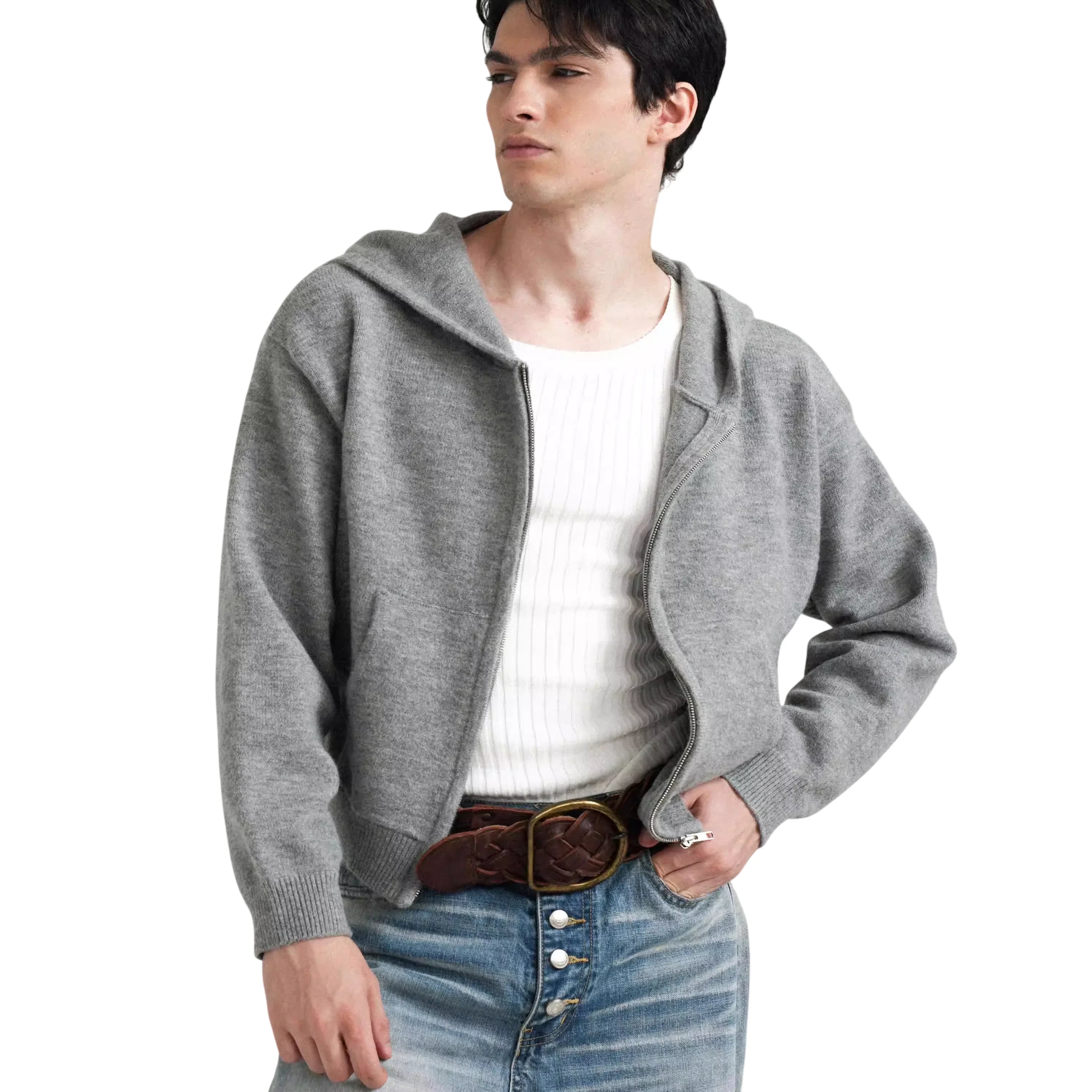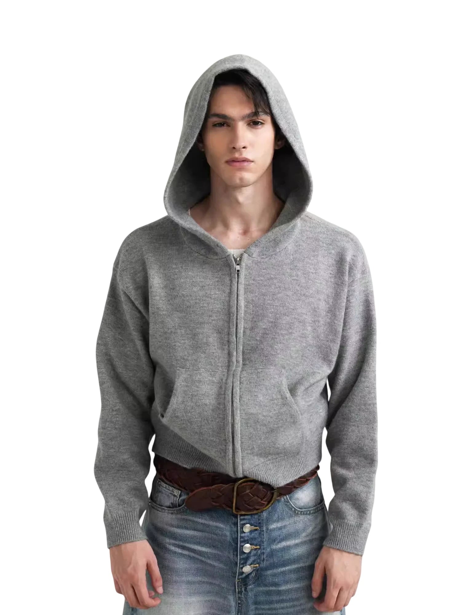 Elevate your casual wardrobe with this men's retro-inspired cropped hoodie. Crafted from a soft, light grey knit fabric, this zip-up hoodie offers a relaxed fit perfect for layering. It features a classic hood and ribbed cuffs for added comfort and style. Wear it over a tank or tee for an effortlessly cool autumn-to-winter look.