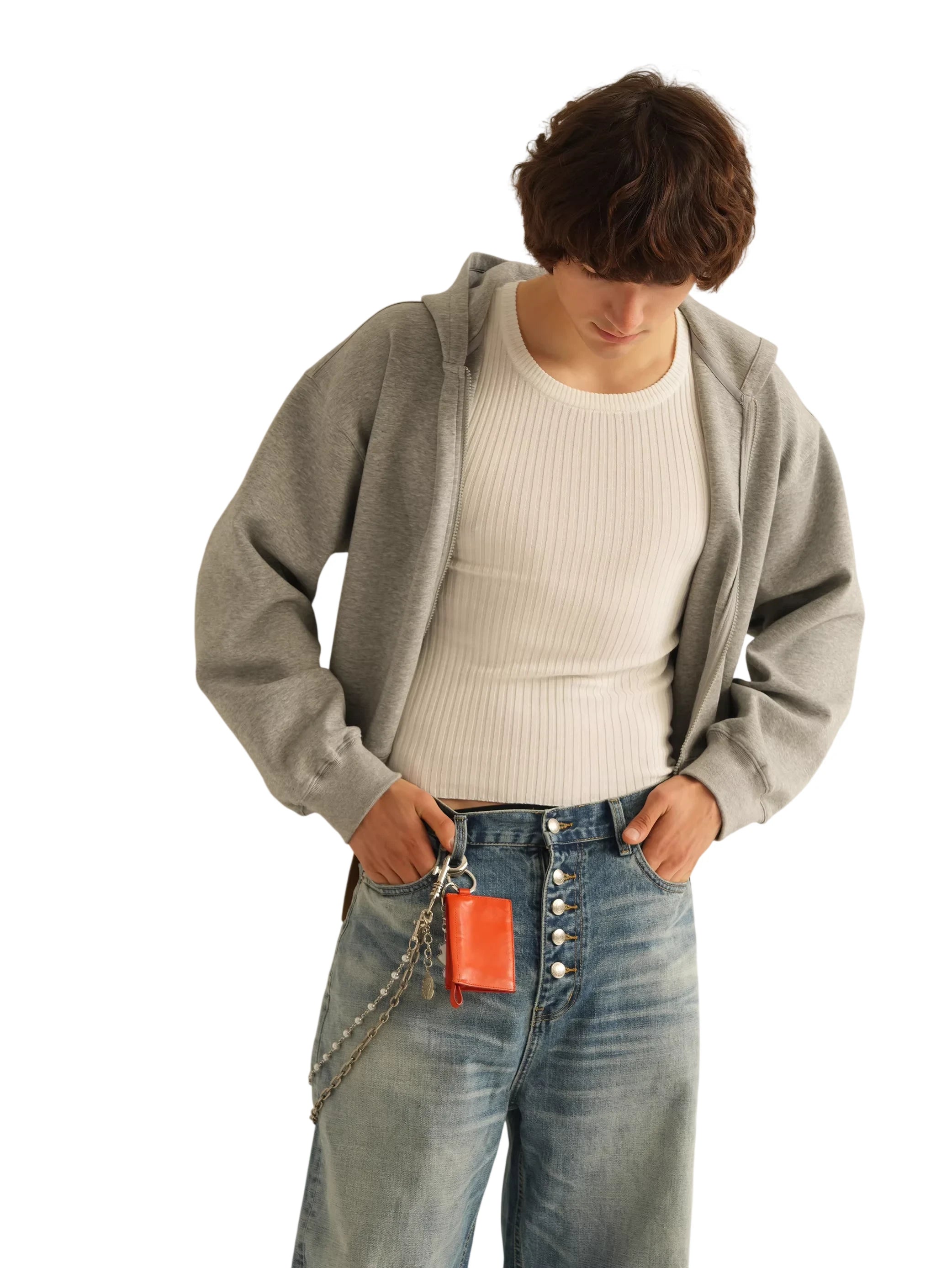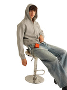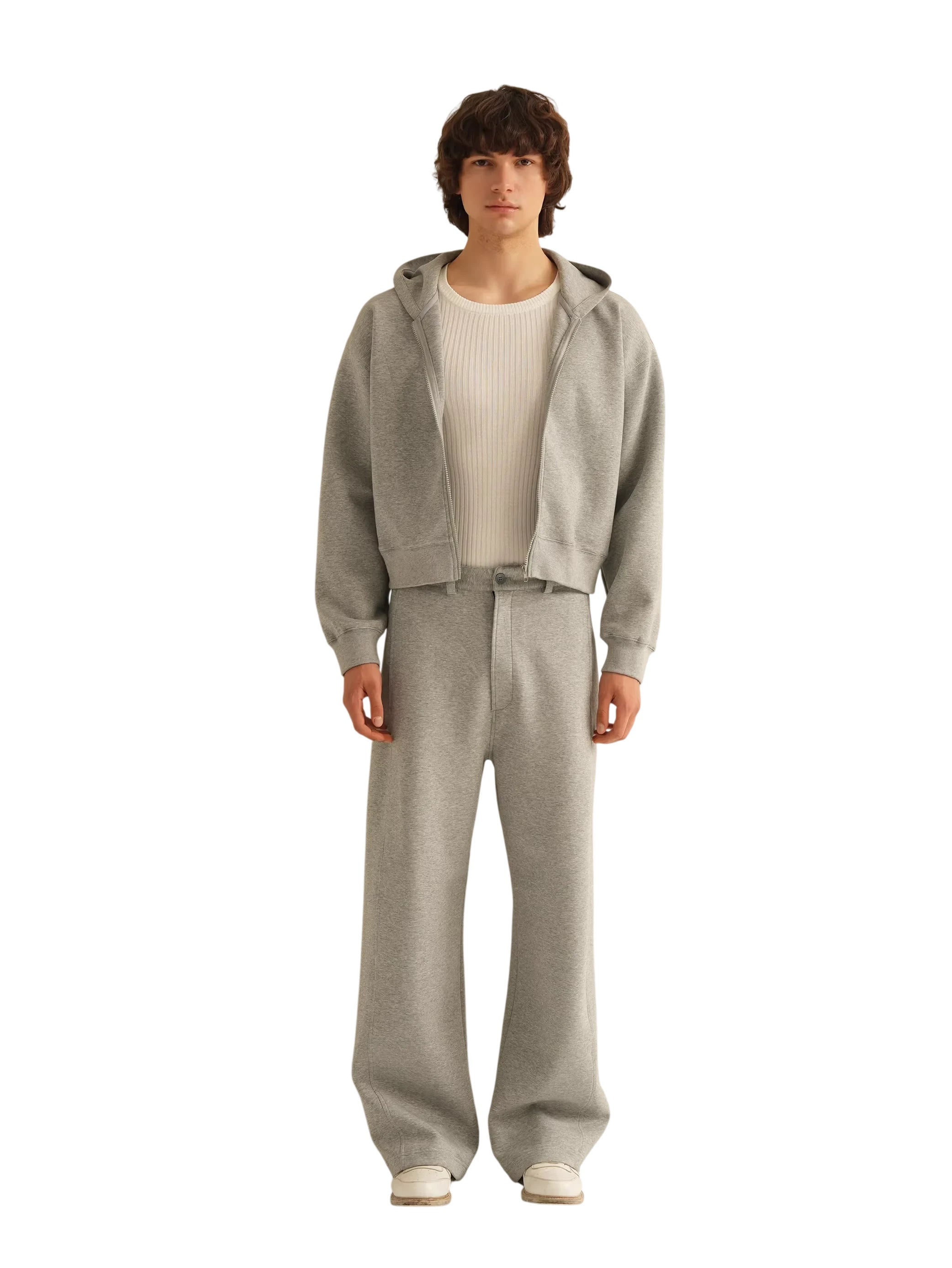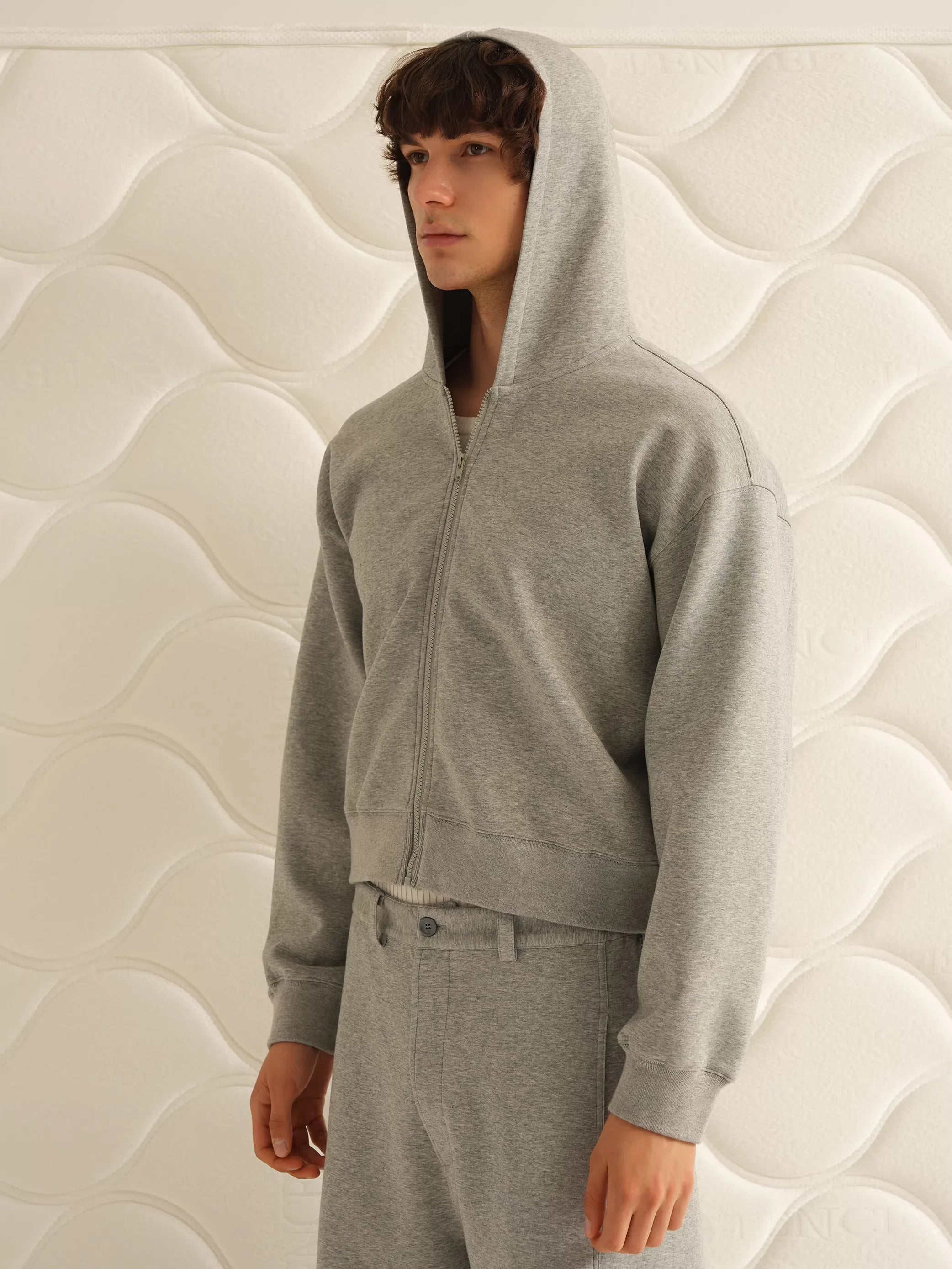 This men's zip-up hoodie features a solid light grey color with a relaxed, loose fit for all-day comfort. Designed with dropped shoulders and made from a soft air layer material, it pairs effortlessly with matching wide-leg sweatpants or casual lounge attire. The hoodie offers a comfortable, laid-back look that is perfect for lounging or everyday casual wear.