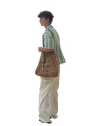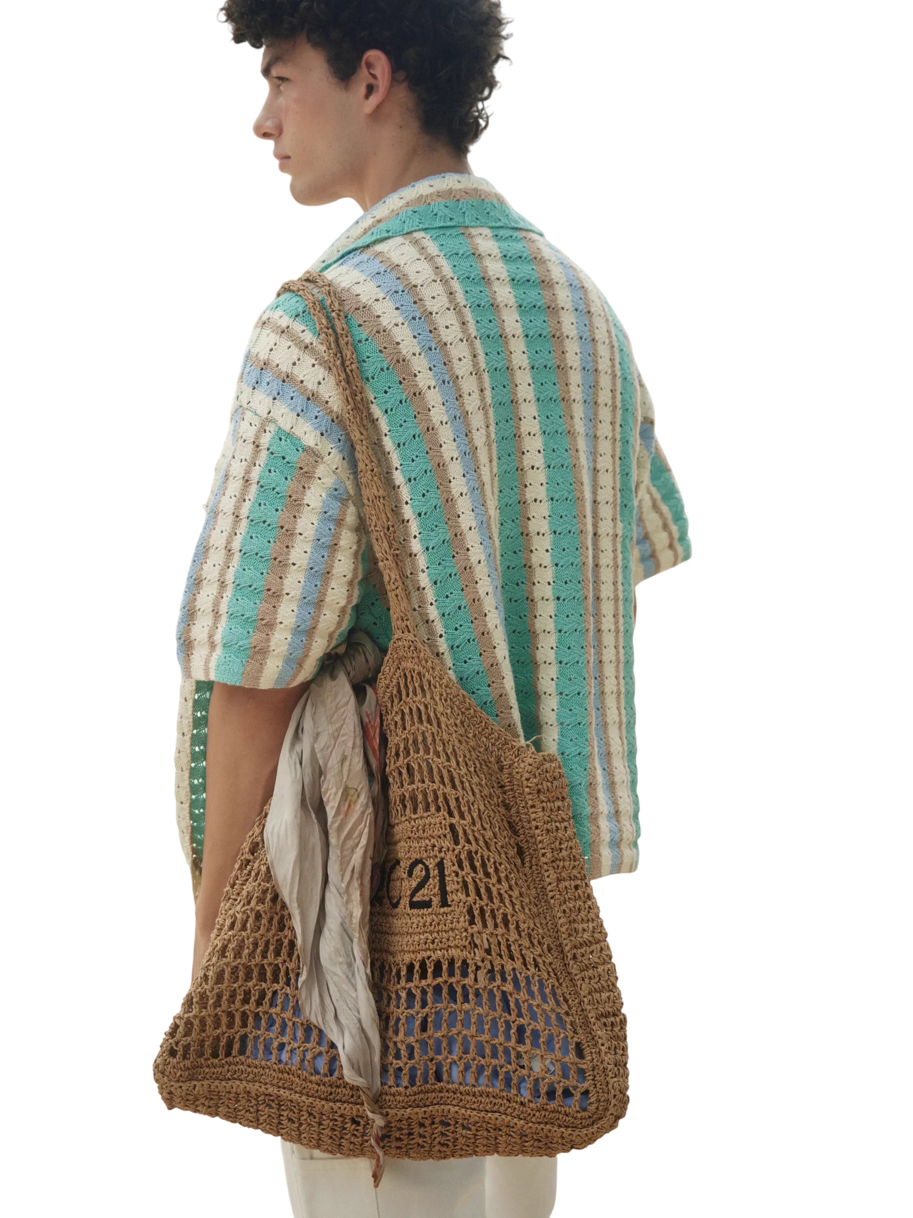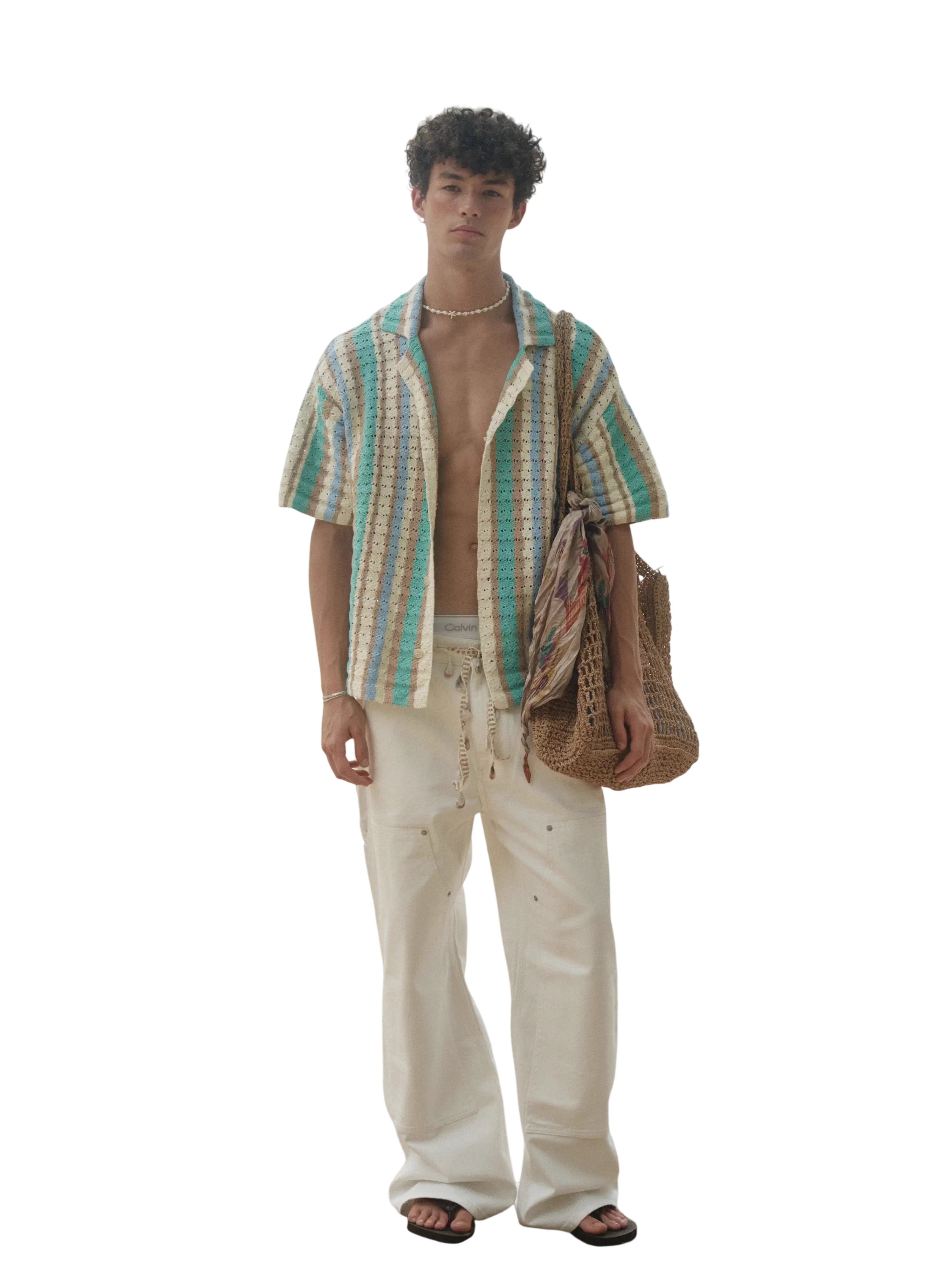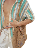 Embrace effortless beach style with this men's short sleeve crochet knit shirt, featuring vertical stripes in soothing blue, beige, brown, and white tones. Crafted with a hollow design for breathable comfort, it's ideal for warm-weather outings. Pair it with relaxed pants for a laid-back, tropical look.