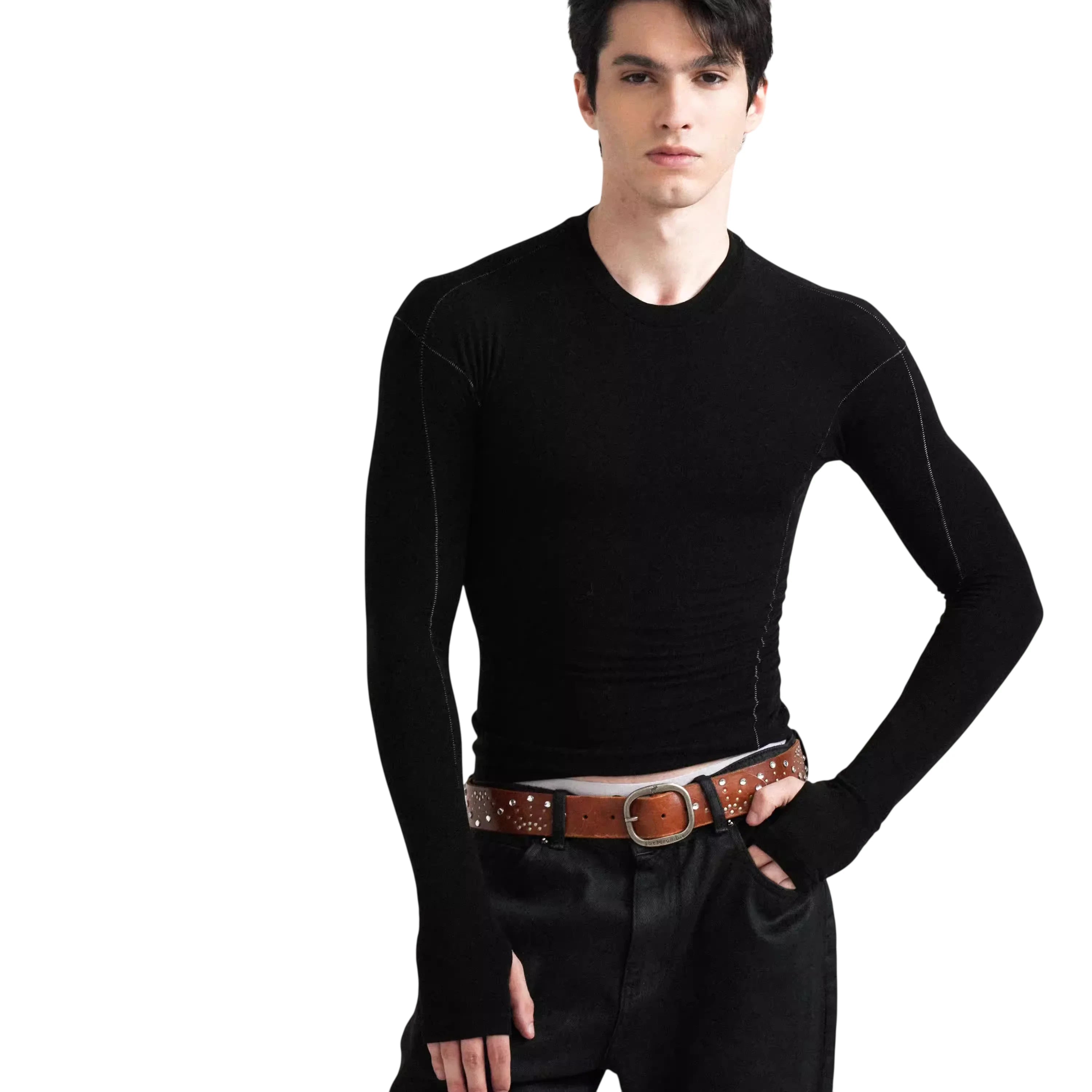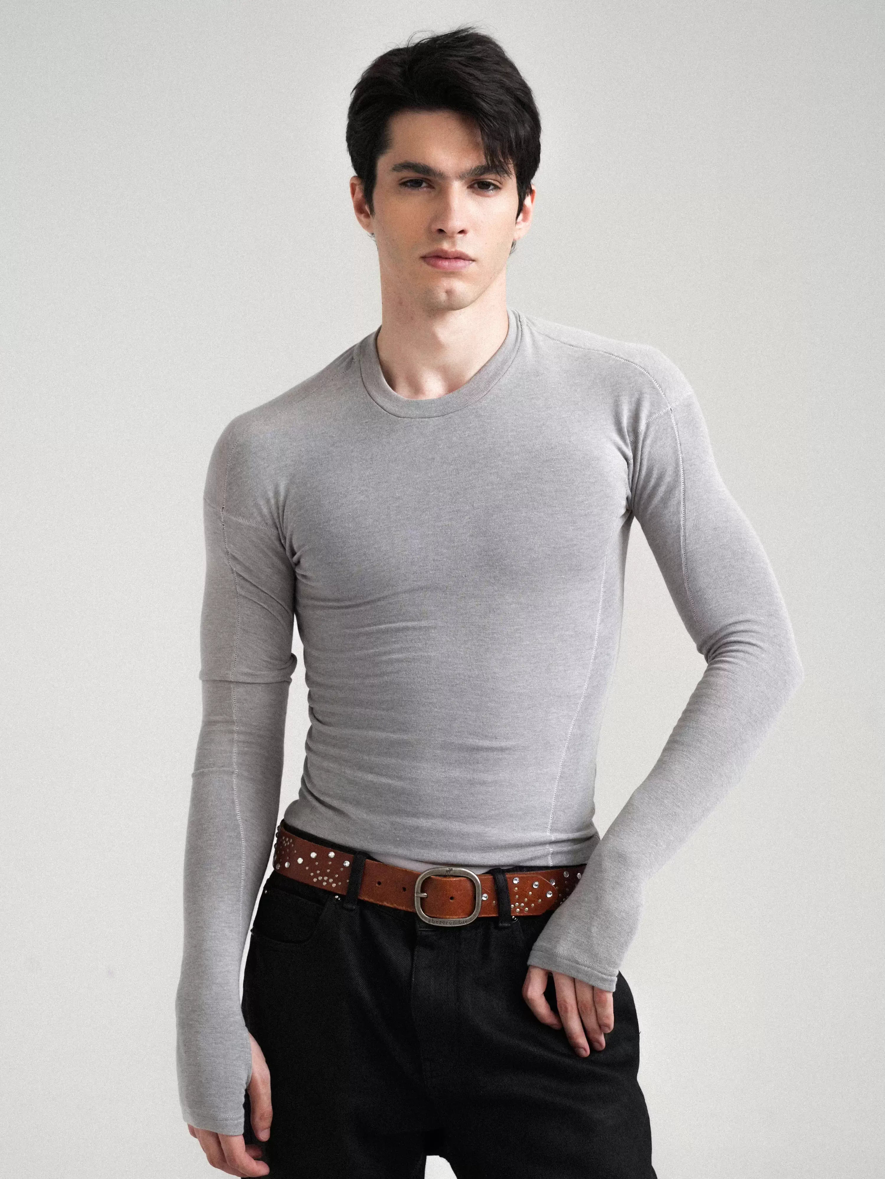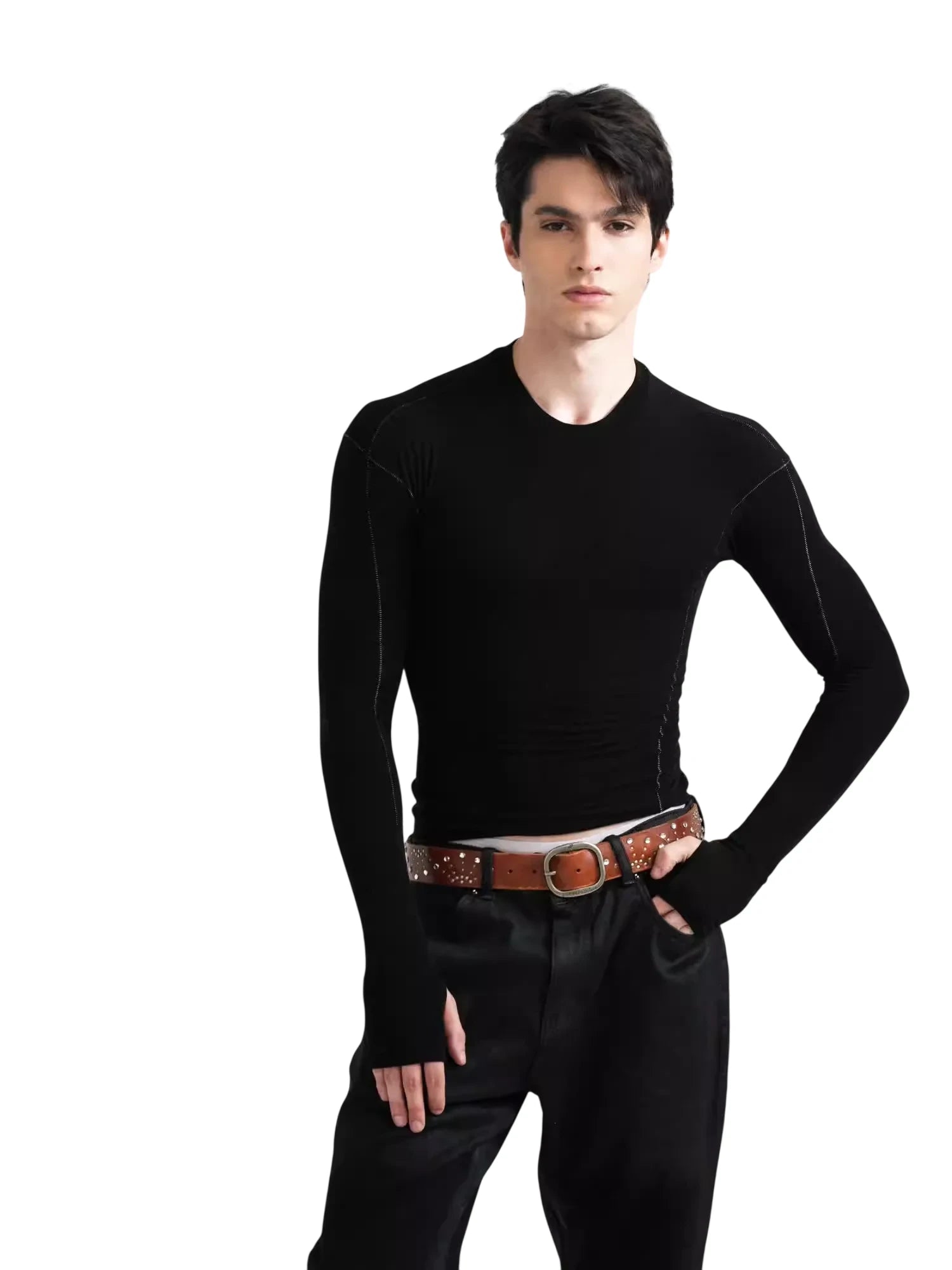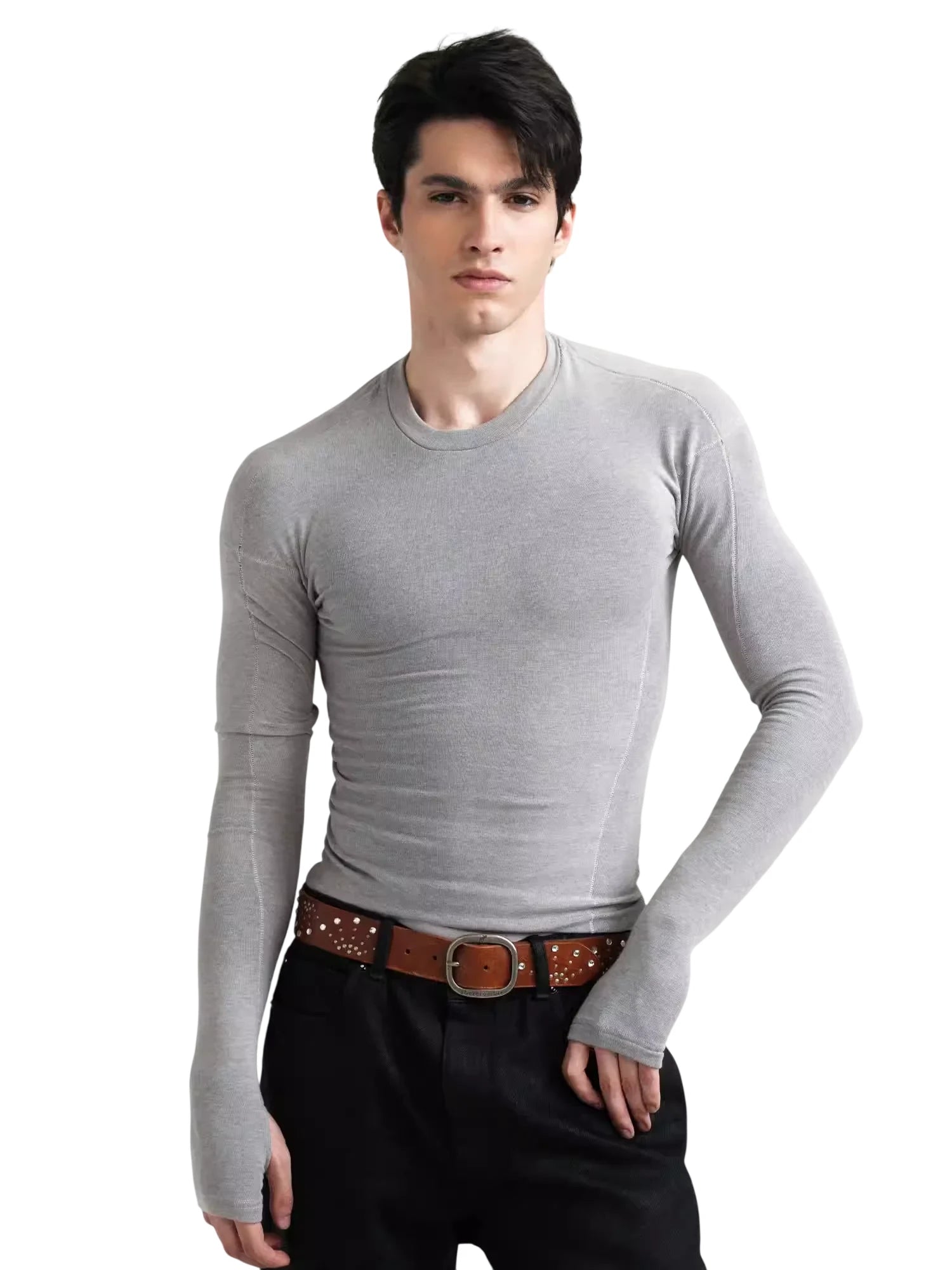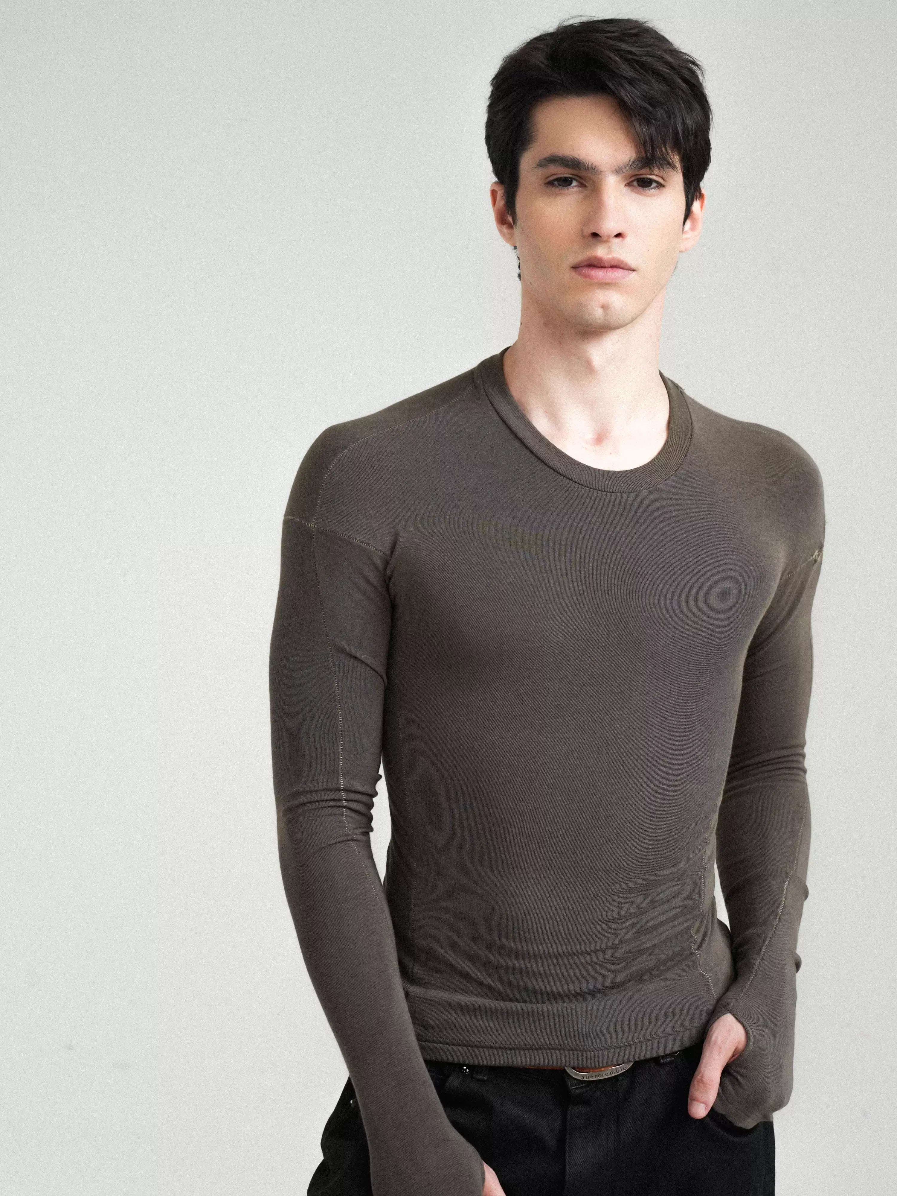 This men's long sleeve thermal base layer top is designed for both comfort and performance. Featuring a sleek, fitted silhouette, it includes extended sleeves with thumbholes for added warmth and a modern touch. The visible seam detailing enhances its sporty look, making it ideal for layering or wearing on its own in cool weather.