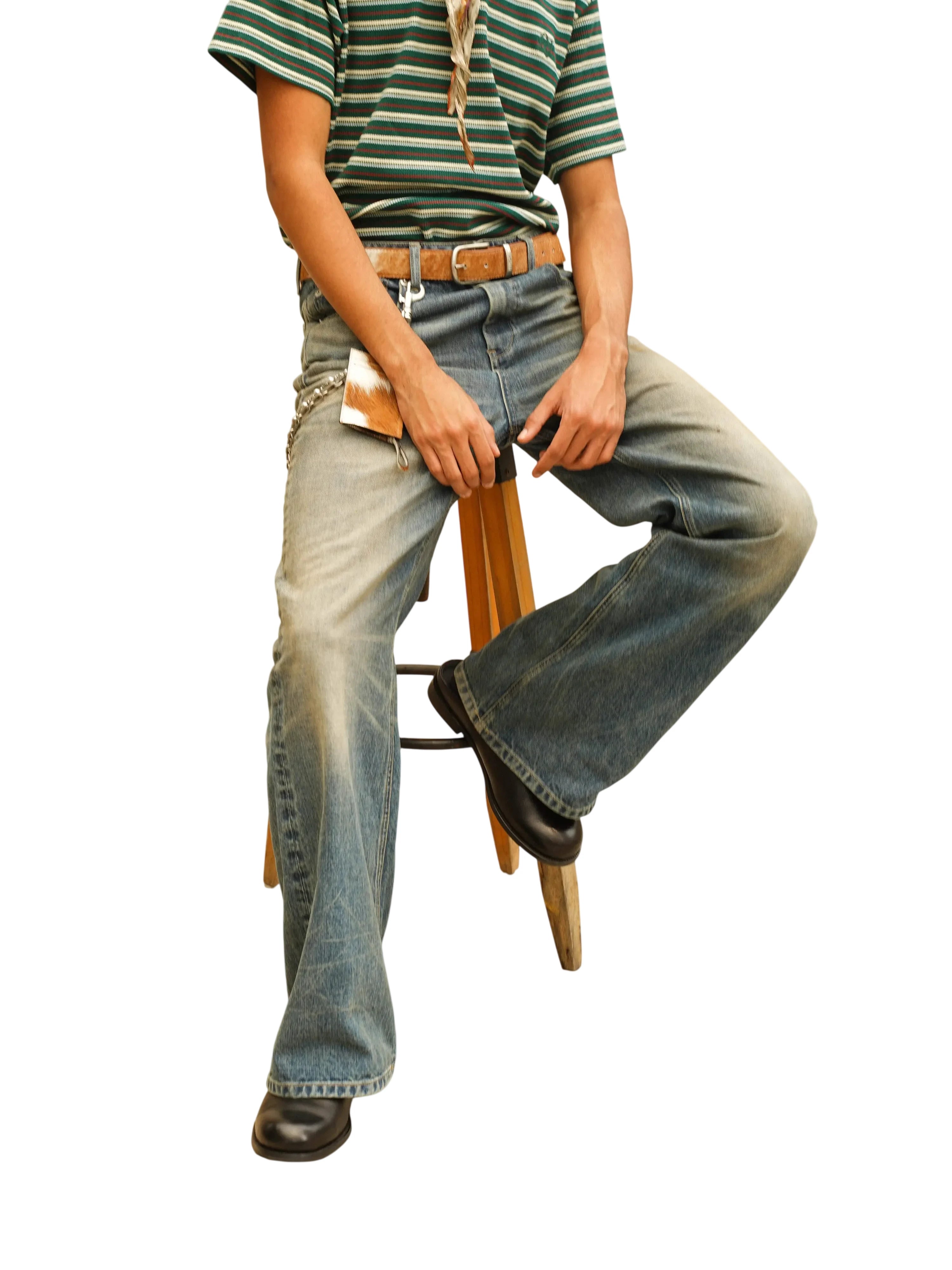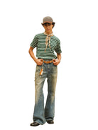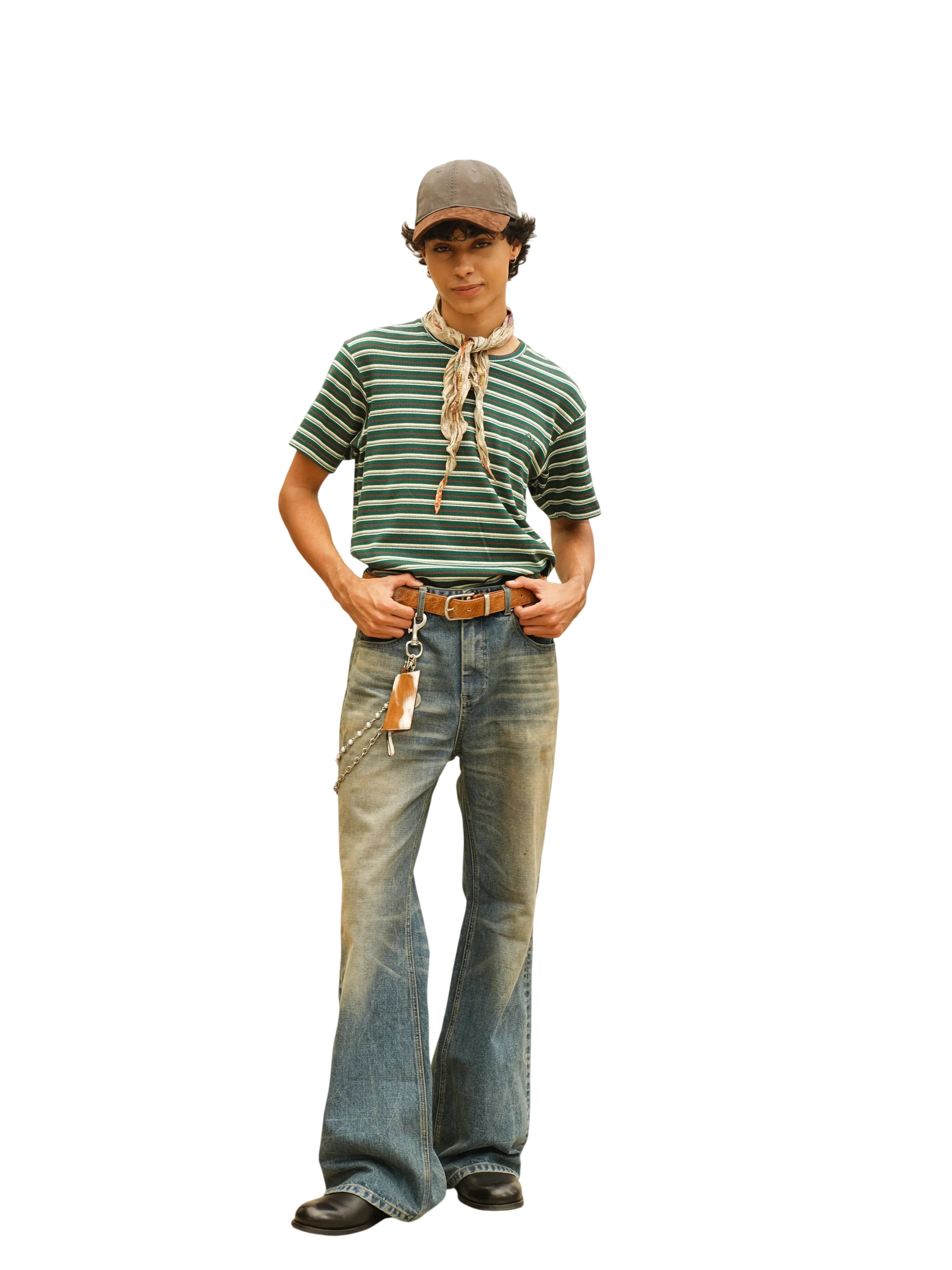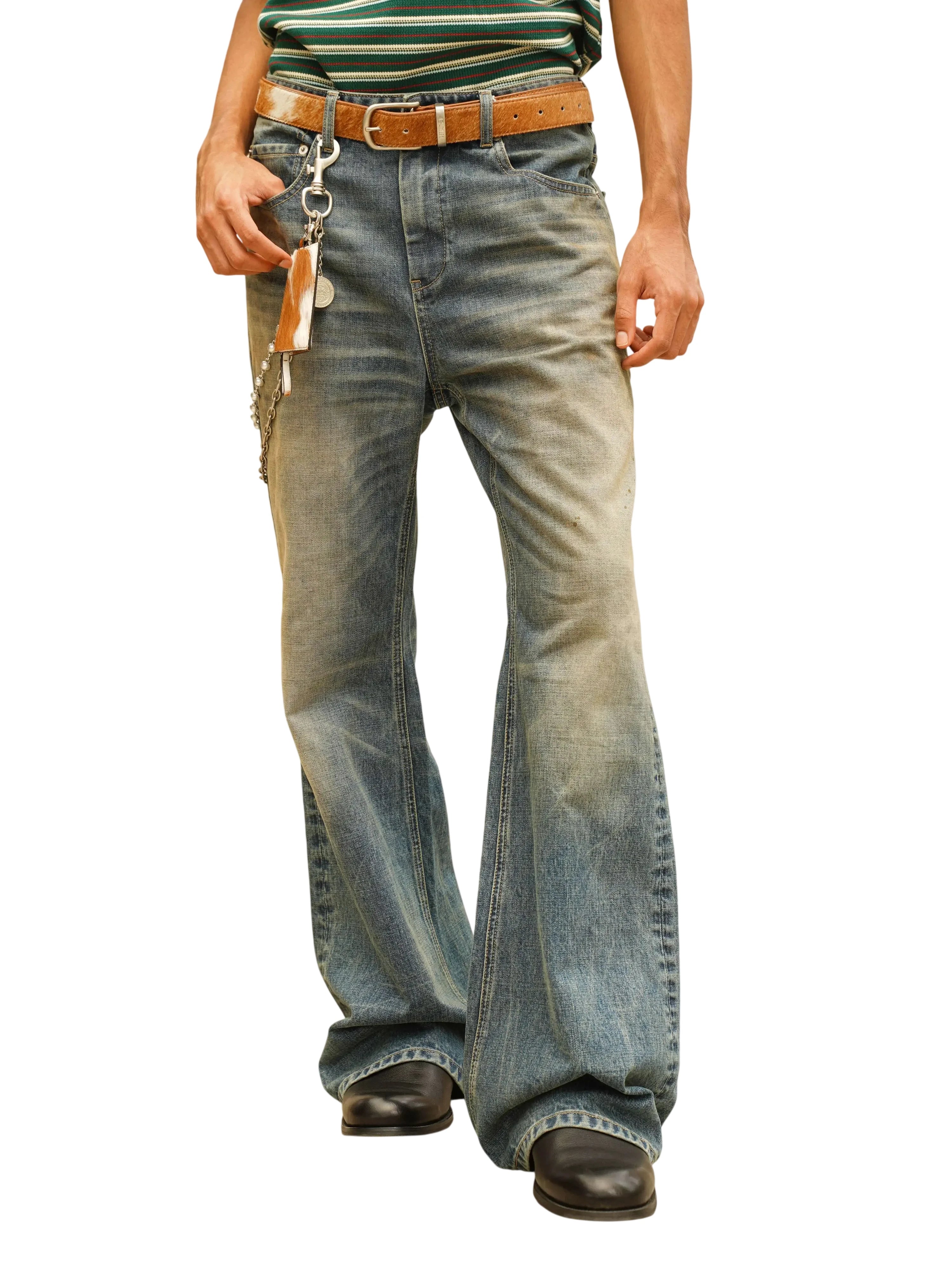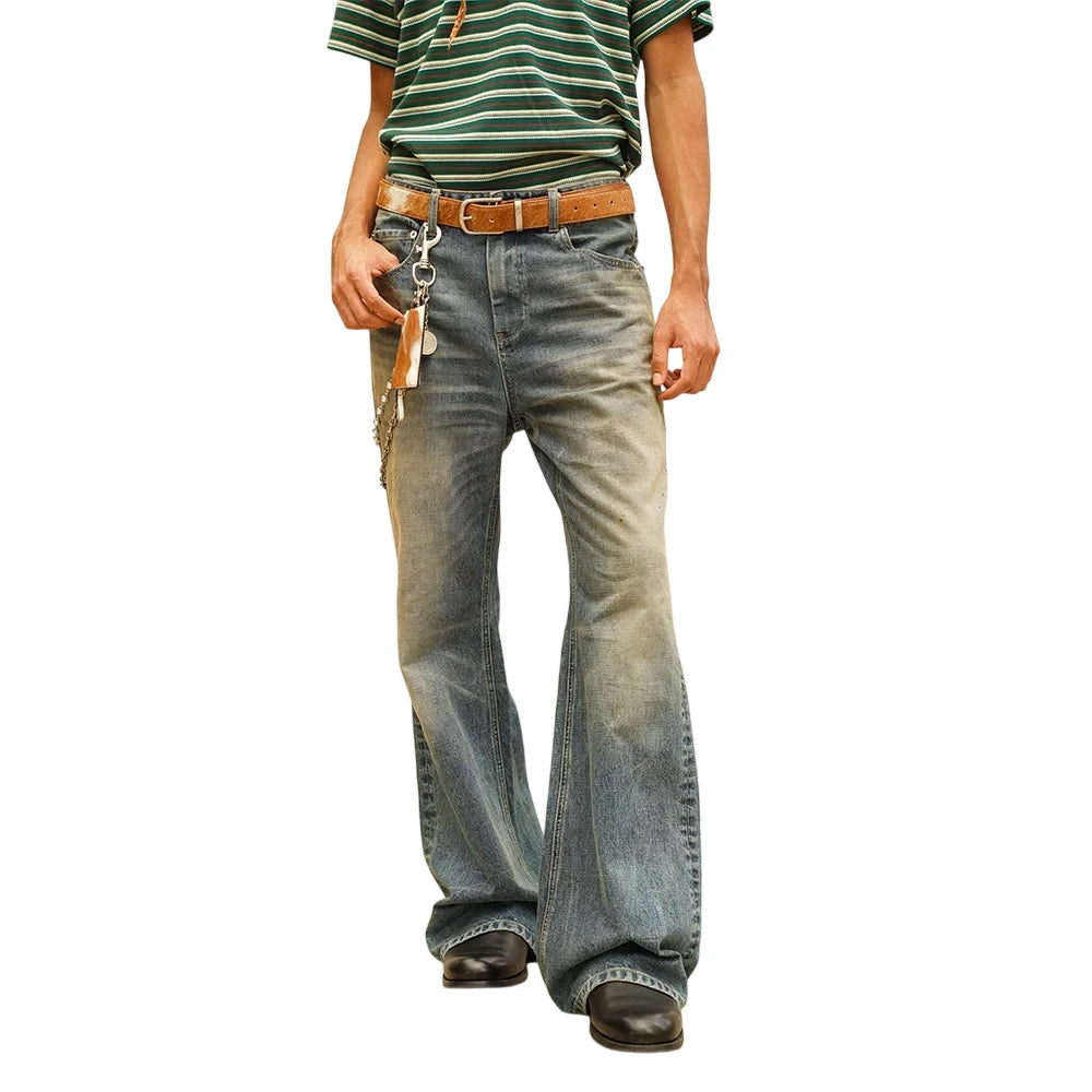 Elevate your streetwear style with these retro washed flared wide-leg jeans for men. Crafted from pure cotton, these jeans feature a heavy faded wash with distressed details at the thighs and knees, offering a classic vintage aesthetic. Designed with a loose A-line silhouette, they provide comfort and effortless style. Perfectly paired with casual tees and accessories, these jeans bring a grunge-inspired look to any modern wardrobe.