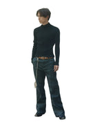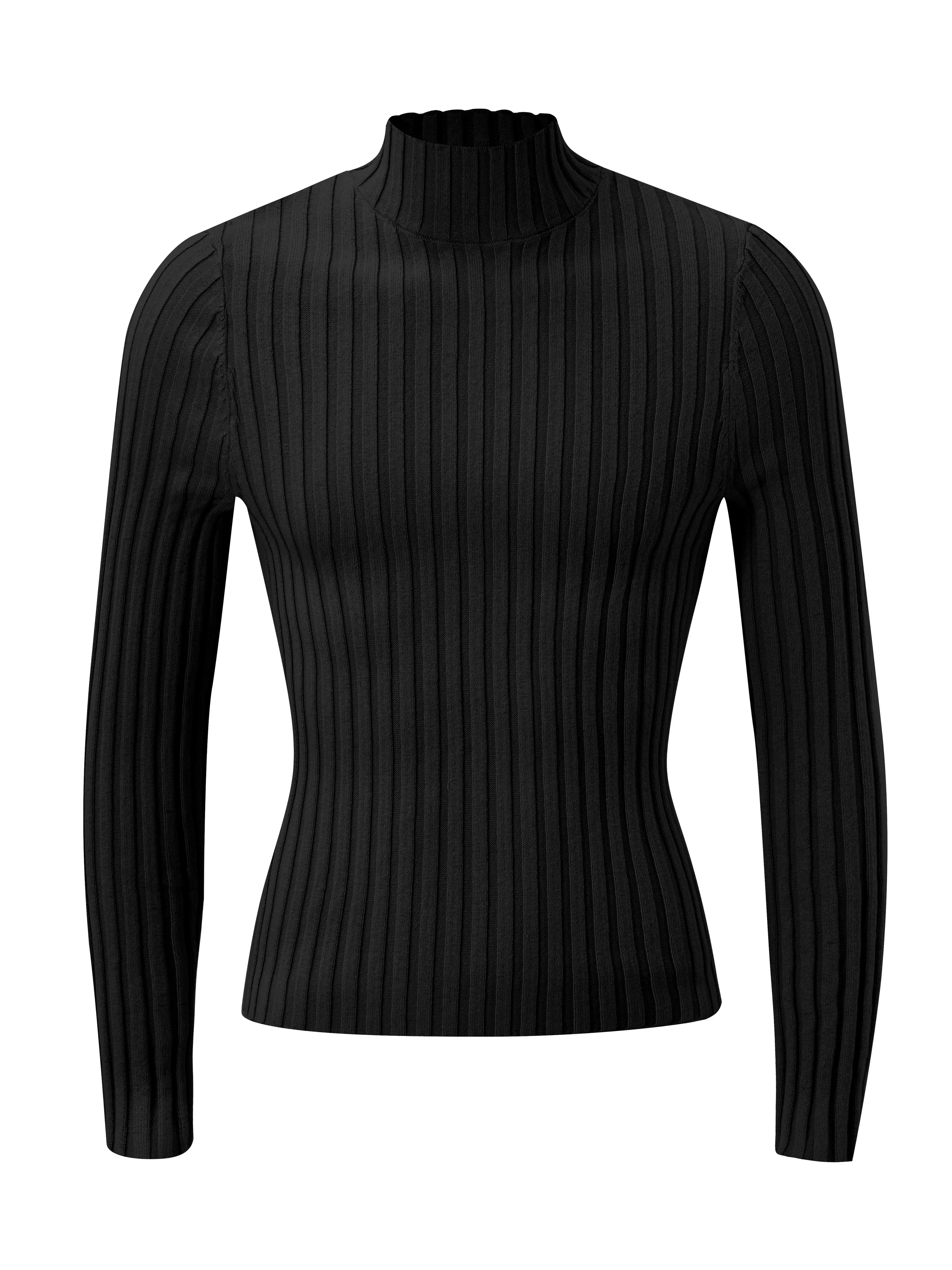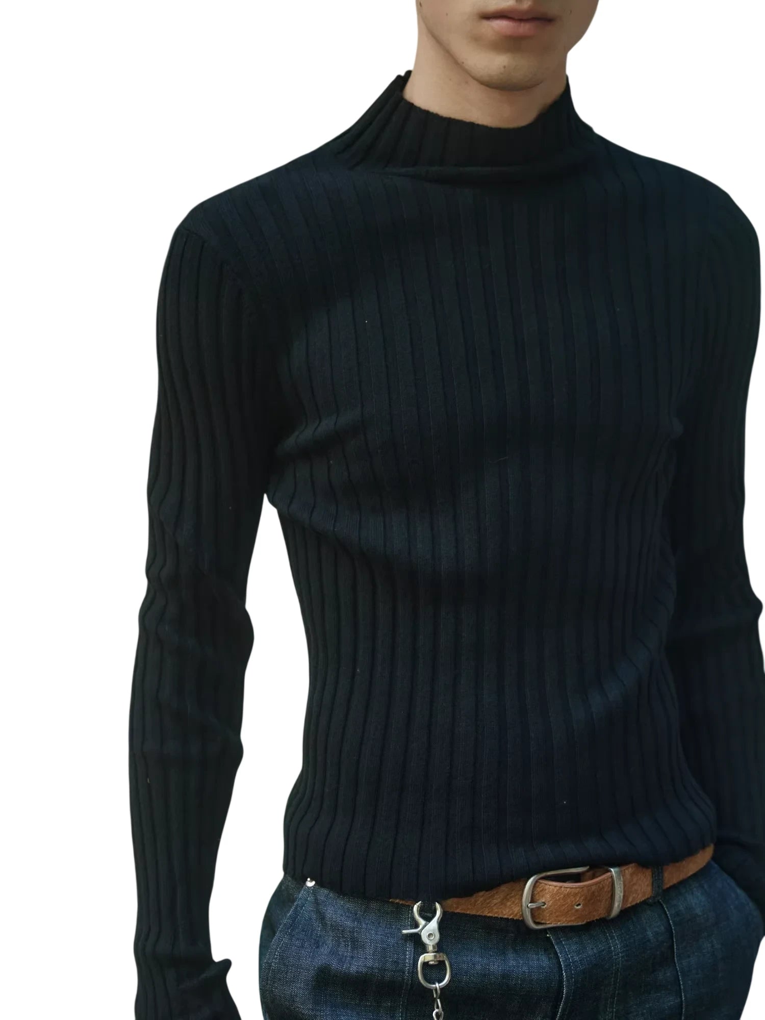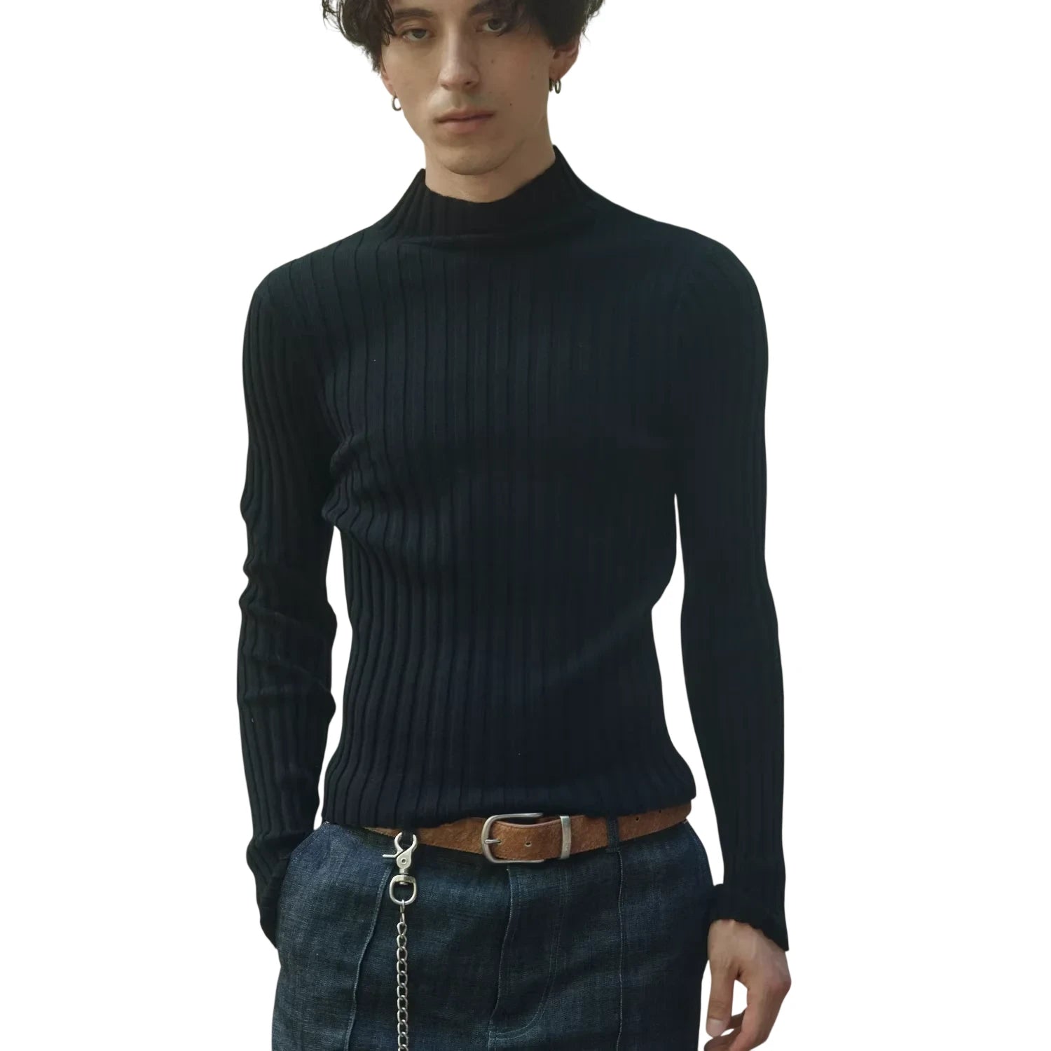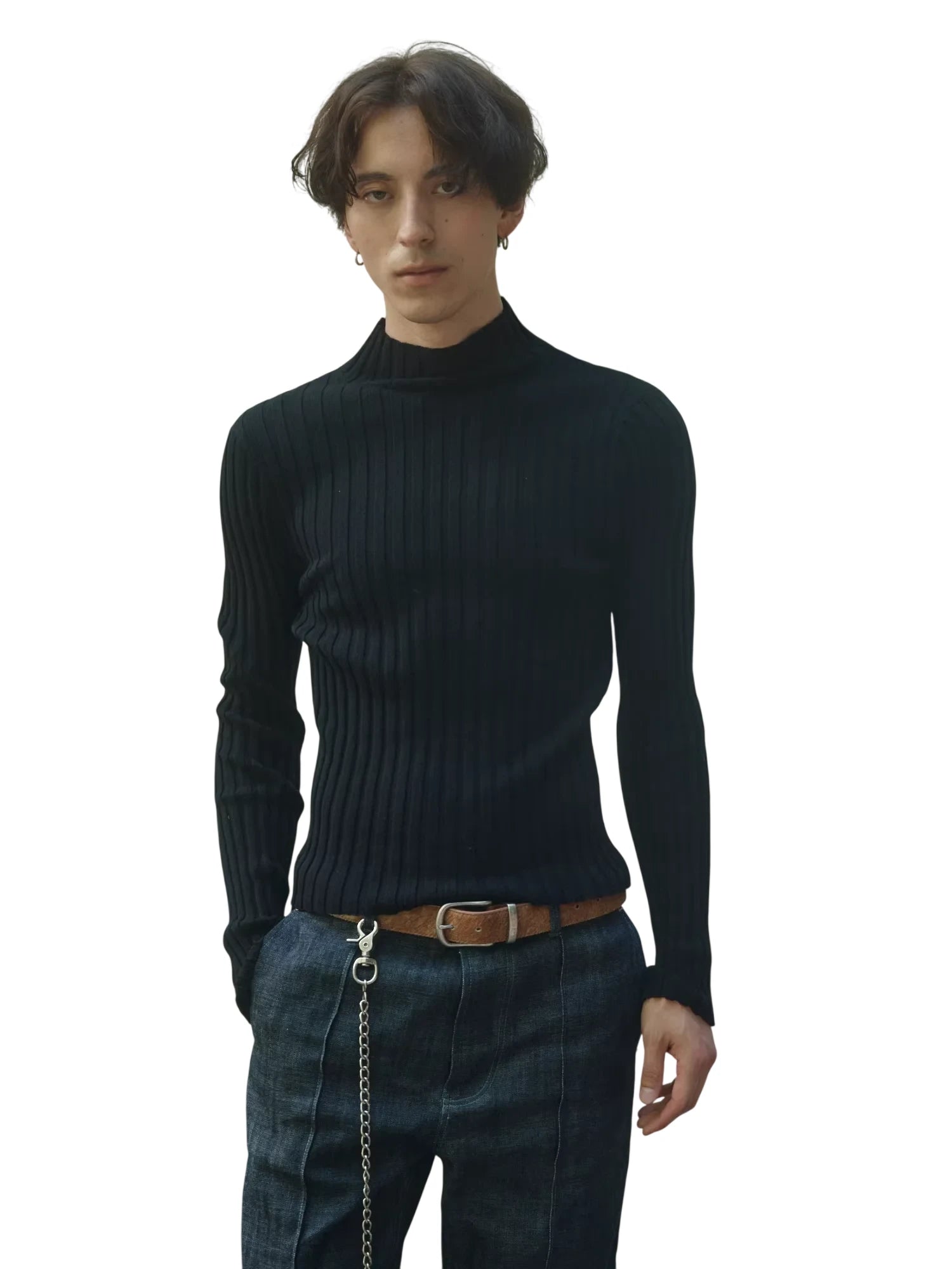 Elevate your wardrobe with this slim-fit turtleneck sweater, crafted from a comfortable wool blend and designed with a classic ribbed knit texture. Featuring long sleeves and a sleek silhouette, this black sweater hugs the torso for a refined and modern look. Ideal for layering or wearing on its own, it pairs effortlessly with denim or tailored pieces. Designed for men, this versatile knit is perfect for cooler days and stylish evenings alike.
