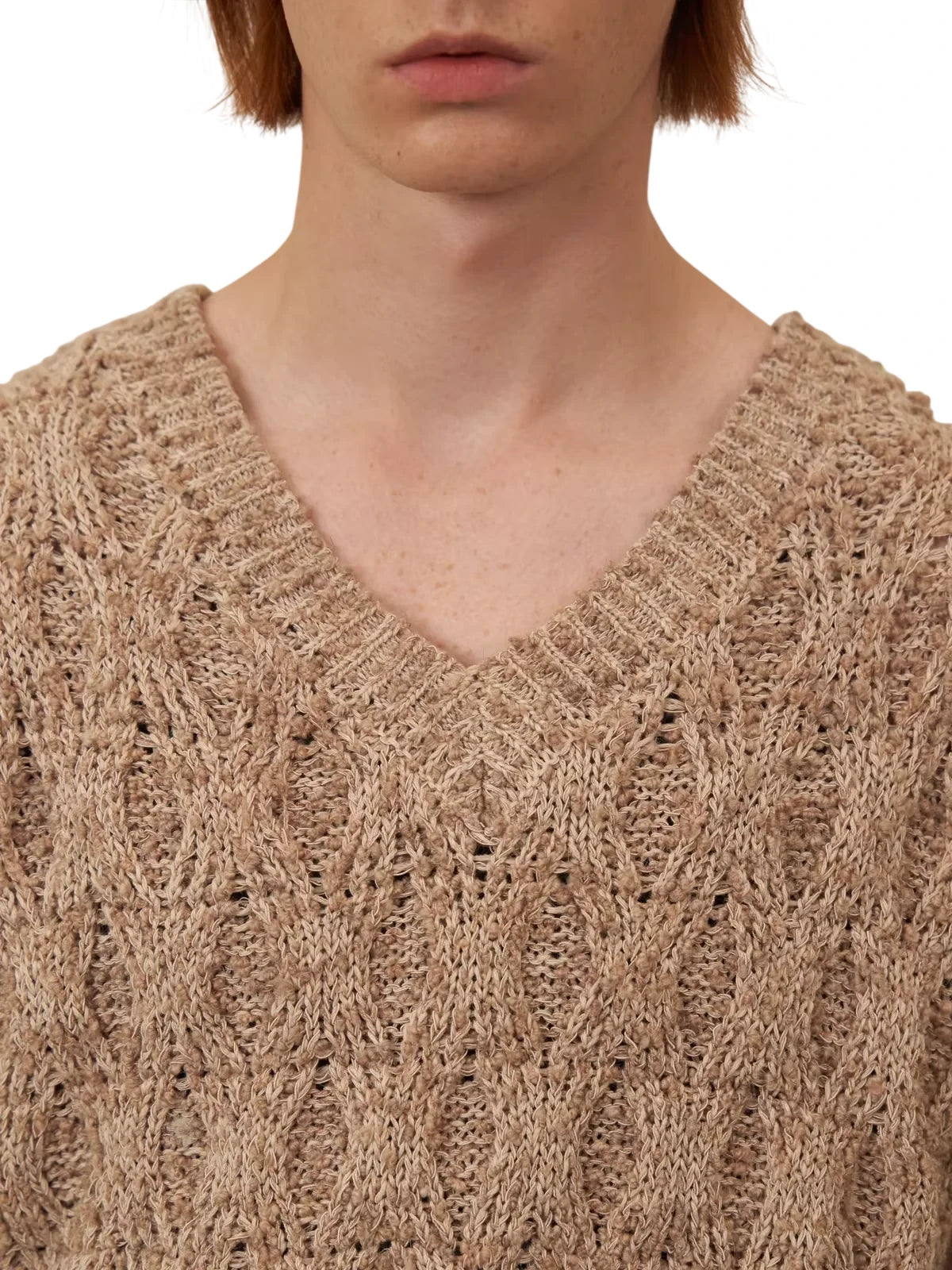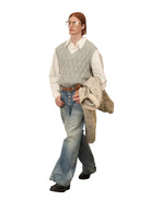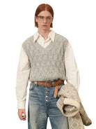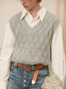 Elevate your layered looks with this classic V-neck knit vest, designed for autumn and winter styling. Featuring a textured diamond cable-knit pattern in a versatile grey hue, this sleeveless sweater adds depth and warmth to your wardrobe. Perfectly paired over a crisp white button-up shirt, it delivers a refined yet relaxed aesthetic.