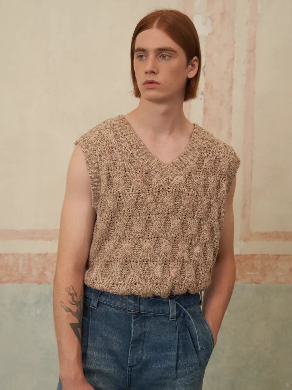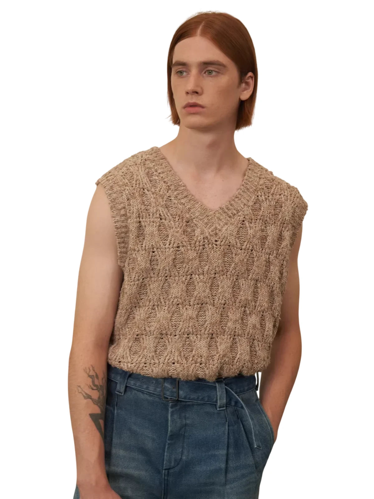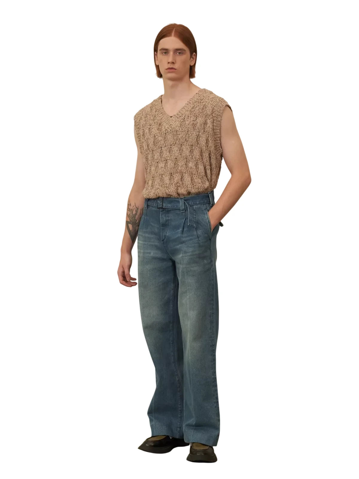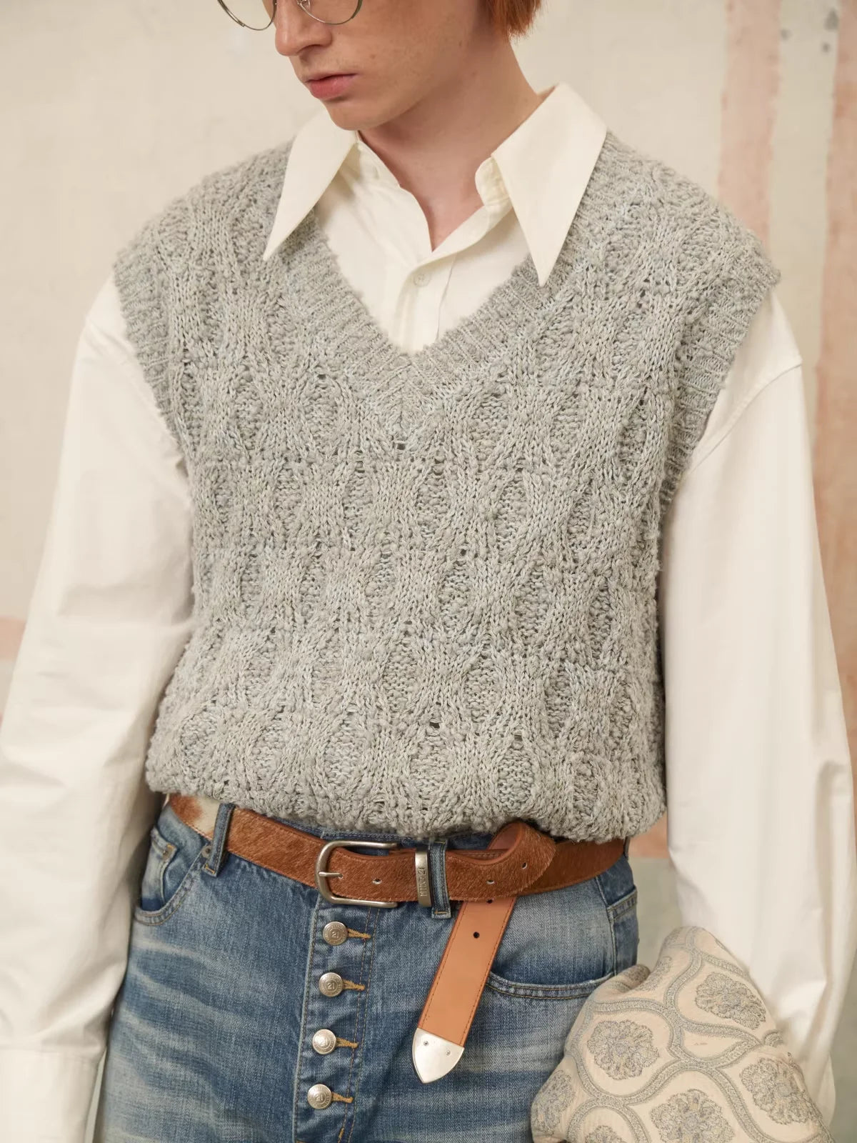 Modeled on a male figure, it is styled with high-waisted, vintage-inspired denim jeans and accessorized with a brown leather belt and clear-framed glasses, reflecting a modern yet timeless fashion sensibility. Ideal for both casual and semi-formal settings.