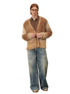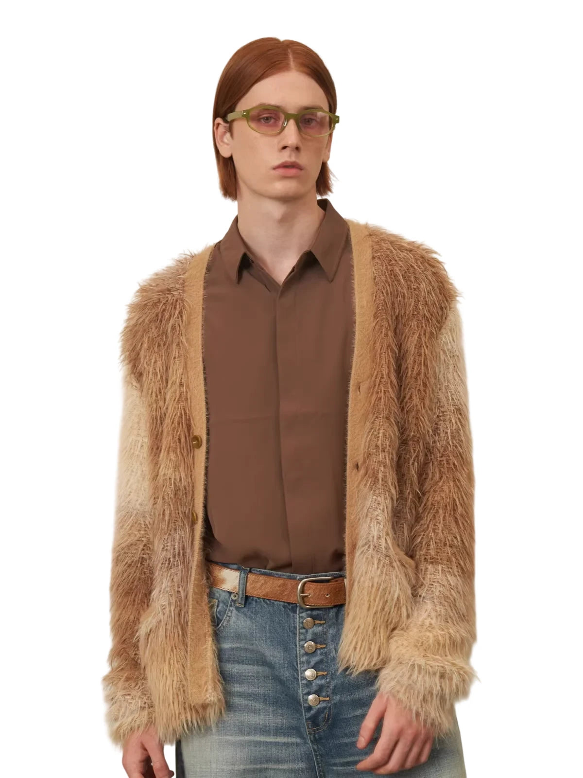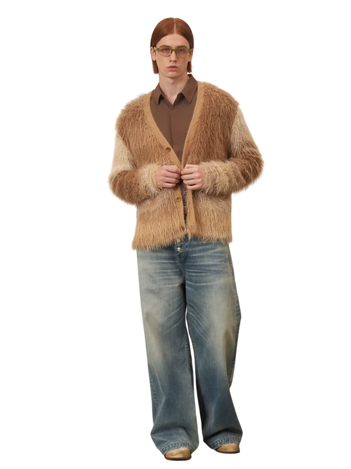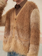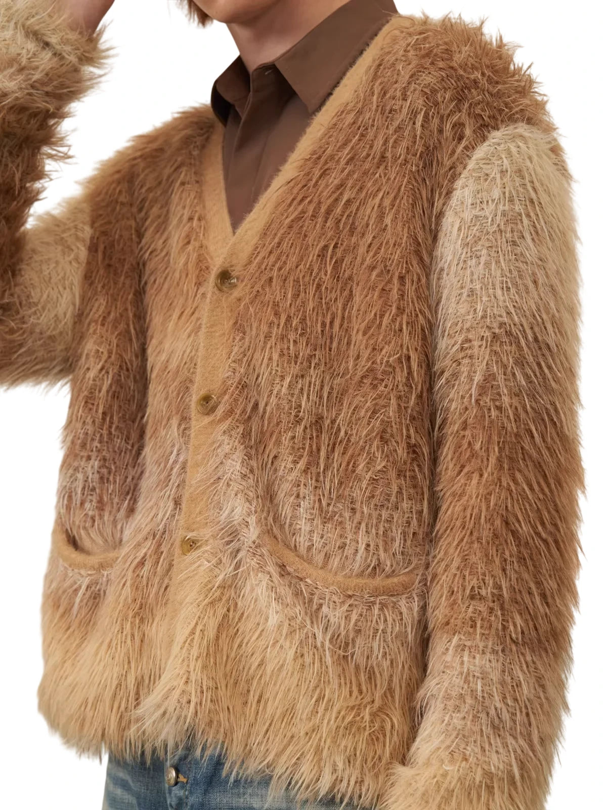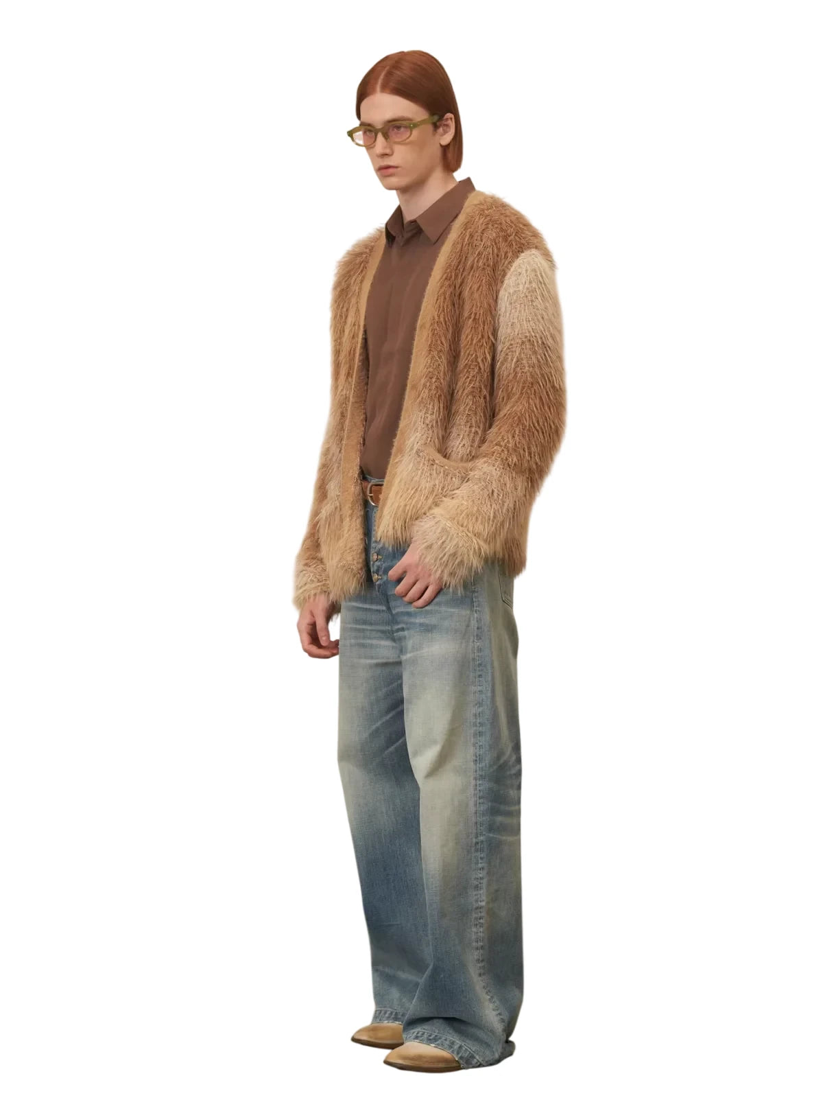 This men's vintage-style cardigan features a soft faux mink texture with a gradient knit design. The open-front silhouette and unstructured shape create a relaxed, cozy aesthetic, perfect for layering during the autumn and winter seasons. Ideal for adding a tactile contrast to classic shirts and casual outfits.