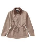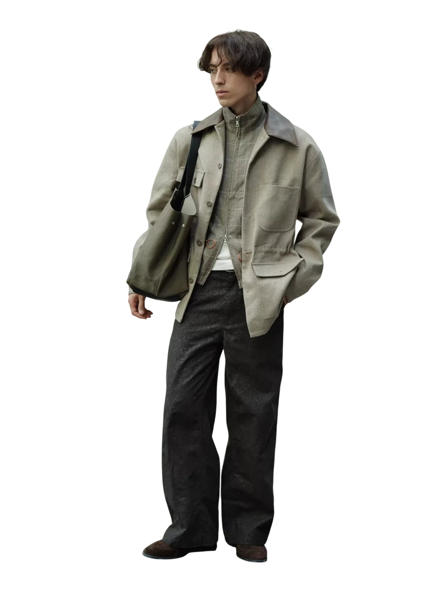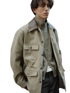 This unisex mid-length jacket features a refined utility design with wool patchwork detailing and a contrasting dark brown leather collar. Designed for both function and style, it includes four front pockets and a drawstring waist for a customizable fit. The structured silhouette and muted tones make it an ideal layering piece for autumn and winter ensembles.