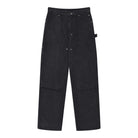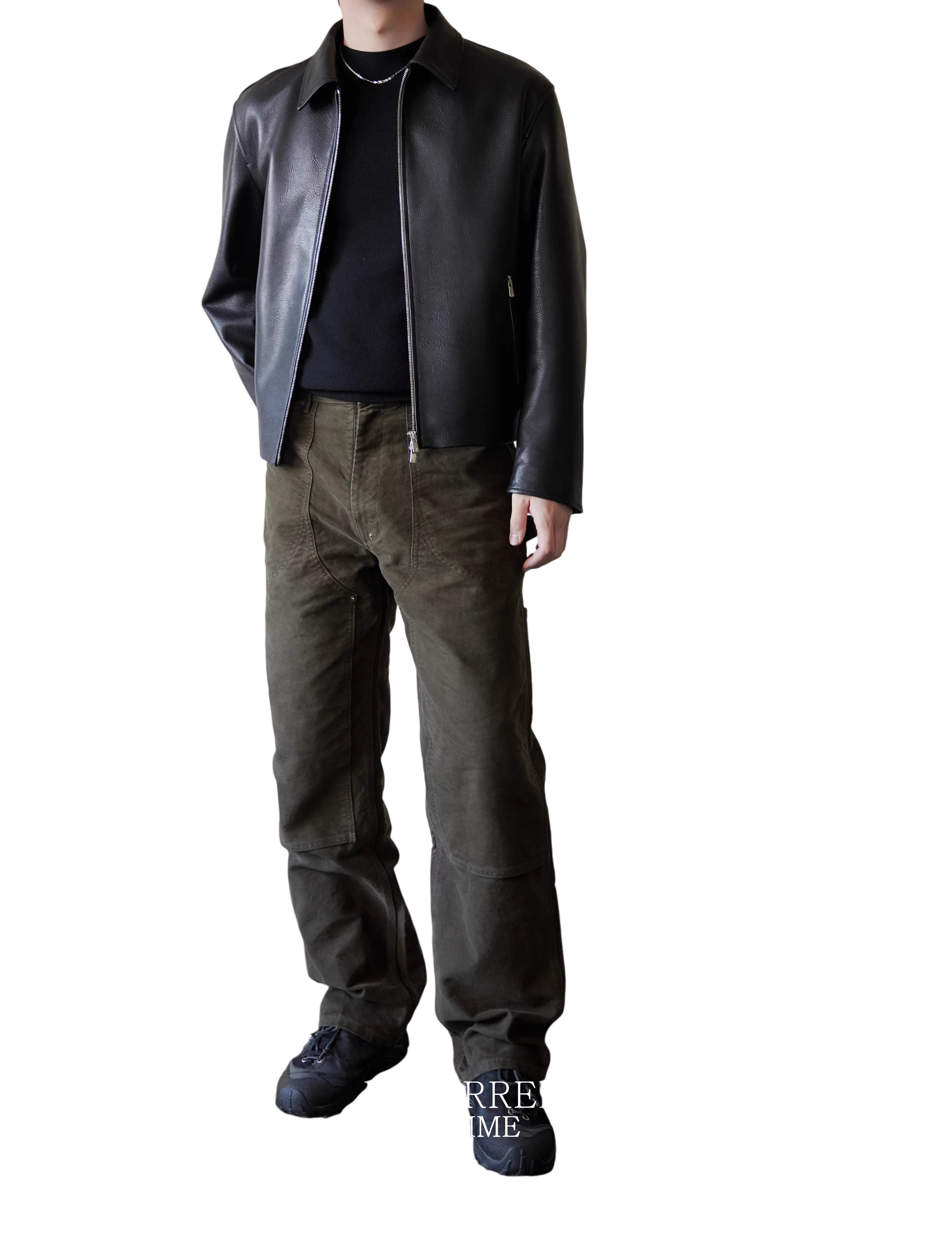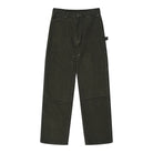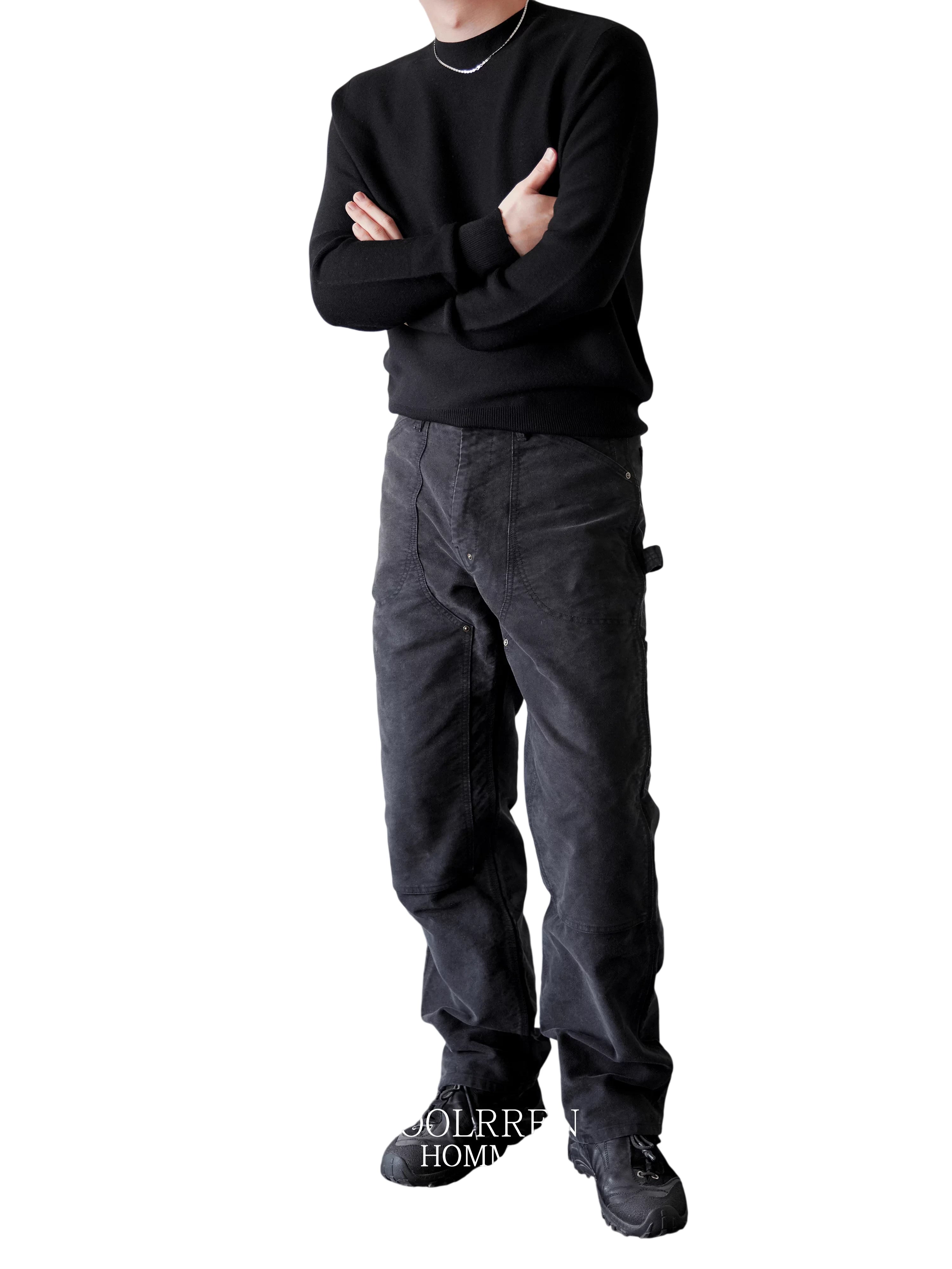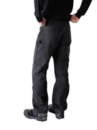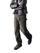 These men's cargo pants feature a rugged and stylish design with an acid-dyed finish and distressed, brushed suede texture. The double-knee construction offers enhanced durability, while the contoured thigh seams and rivet accents provide a modern, functional look. Equipped with belt loops, front pockets, and reinforced seam panels, these commuter-ready pants combine utility with a sophisticated urban edge. Available in washed black and olive green.