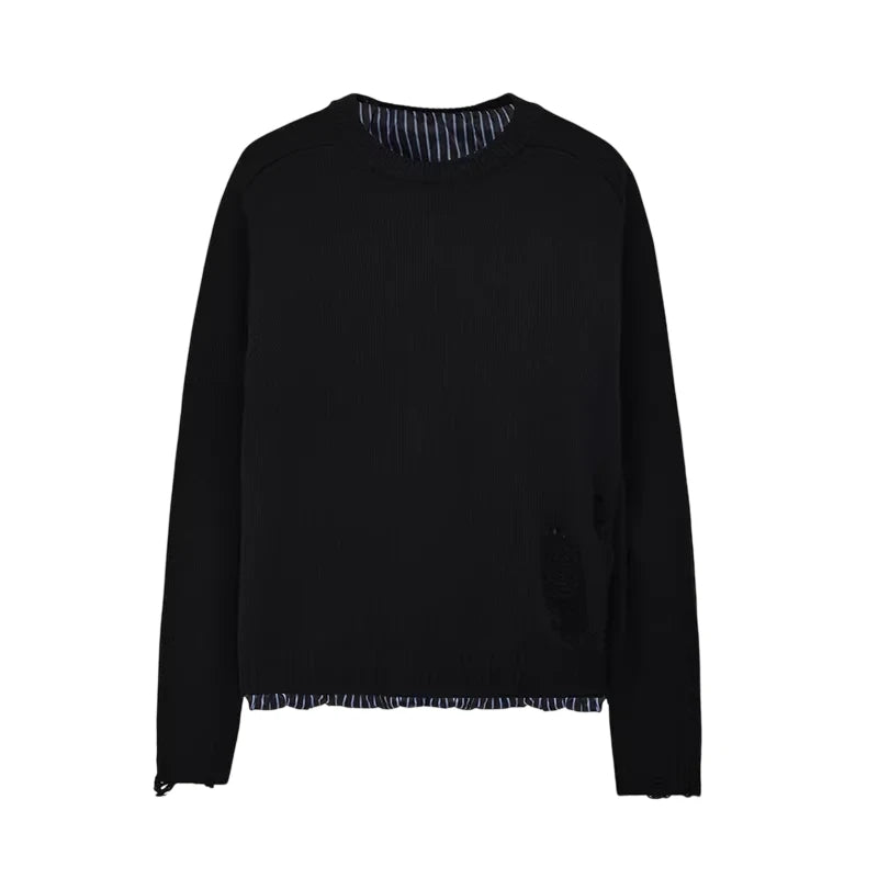 This men's pullover sweater features a clean-fit design crafted from a wool shell with a satin Tencel blend lining for added comfort. Highlighting a faux layered look, the piece incorporates a striped shirt hem detail extending from its distressed lower front, providing a stylish contrast and modern appeal. Ribbed crew neckline, cuffs, and hem complete the casual yet fashion-forward silhouette.