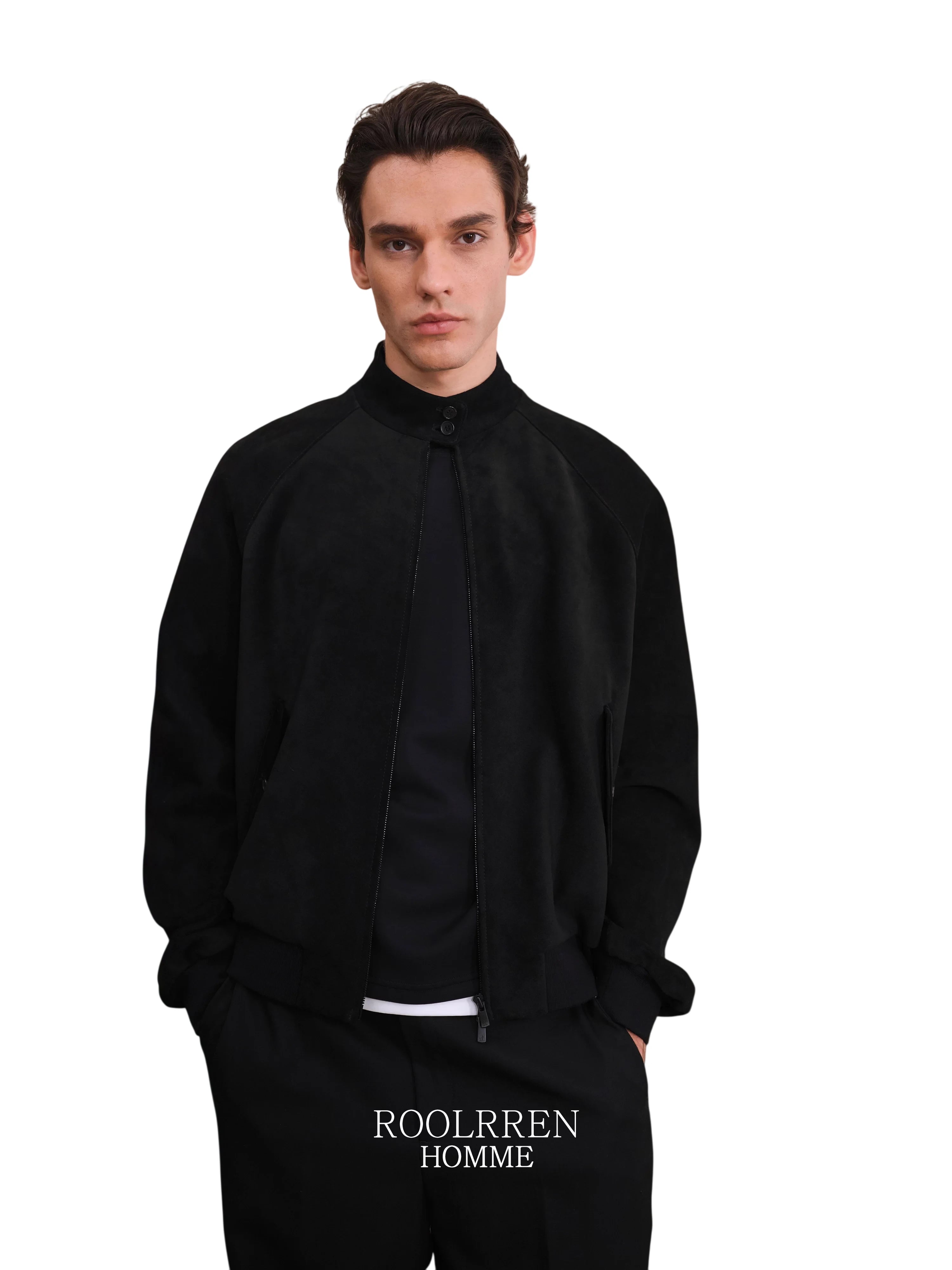 Roolrren homme Italian Suede Retro Stand Collar Leather Harrington Jacket