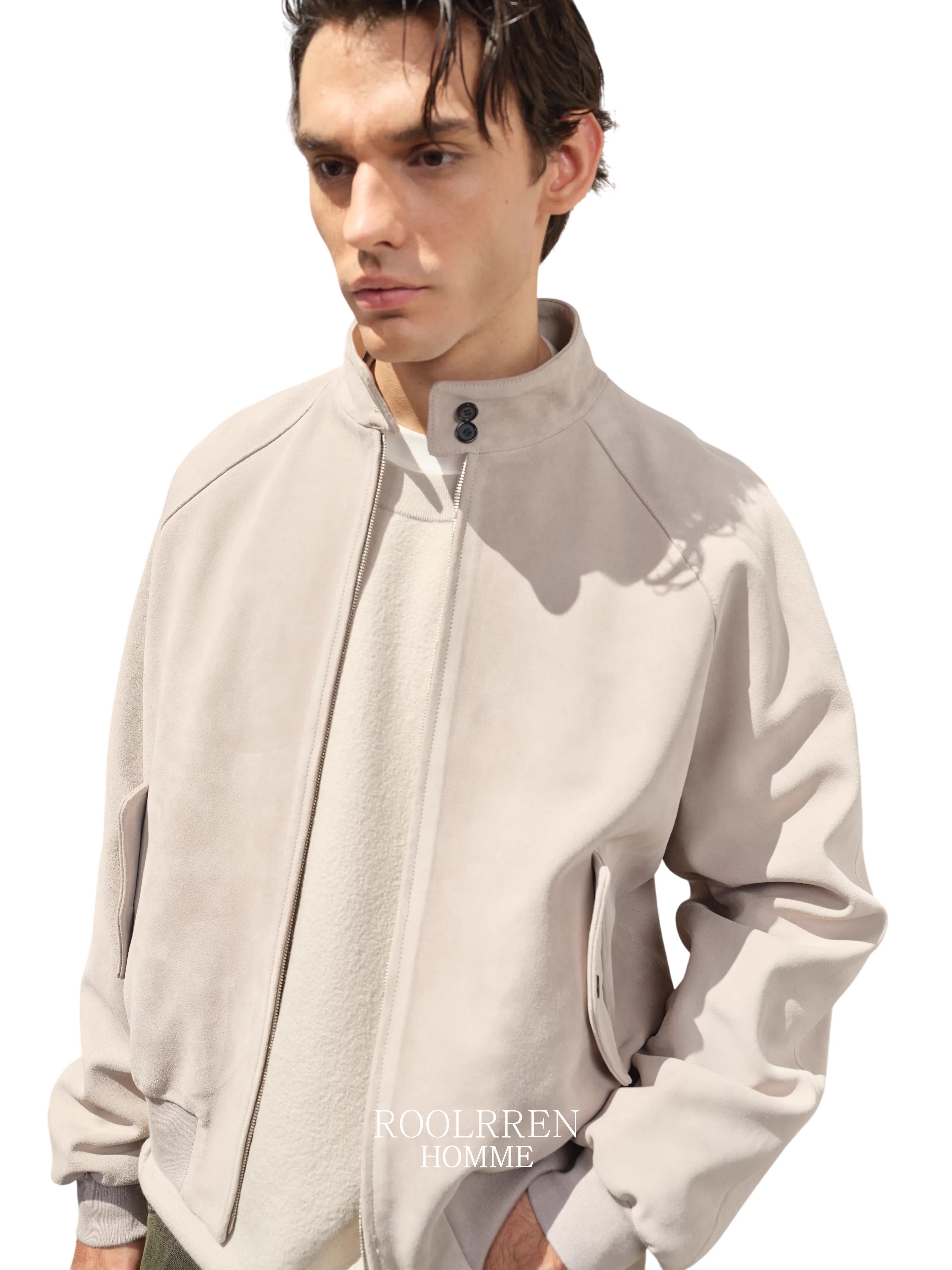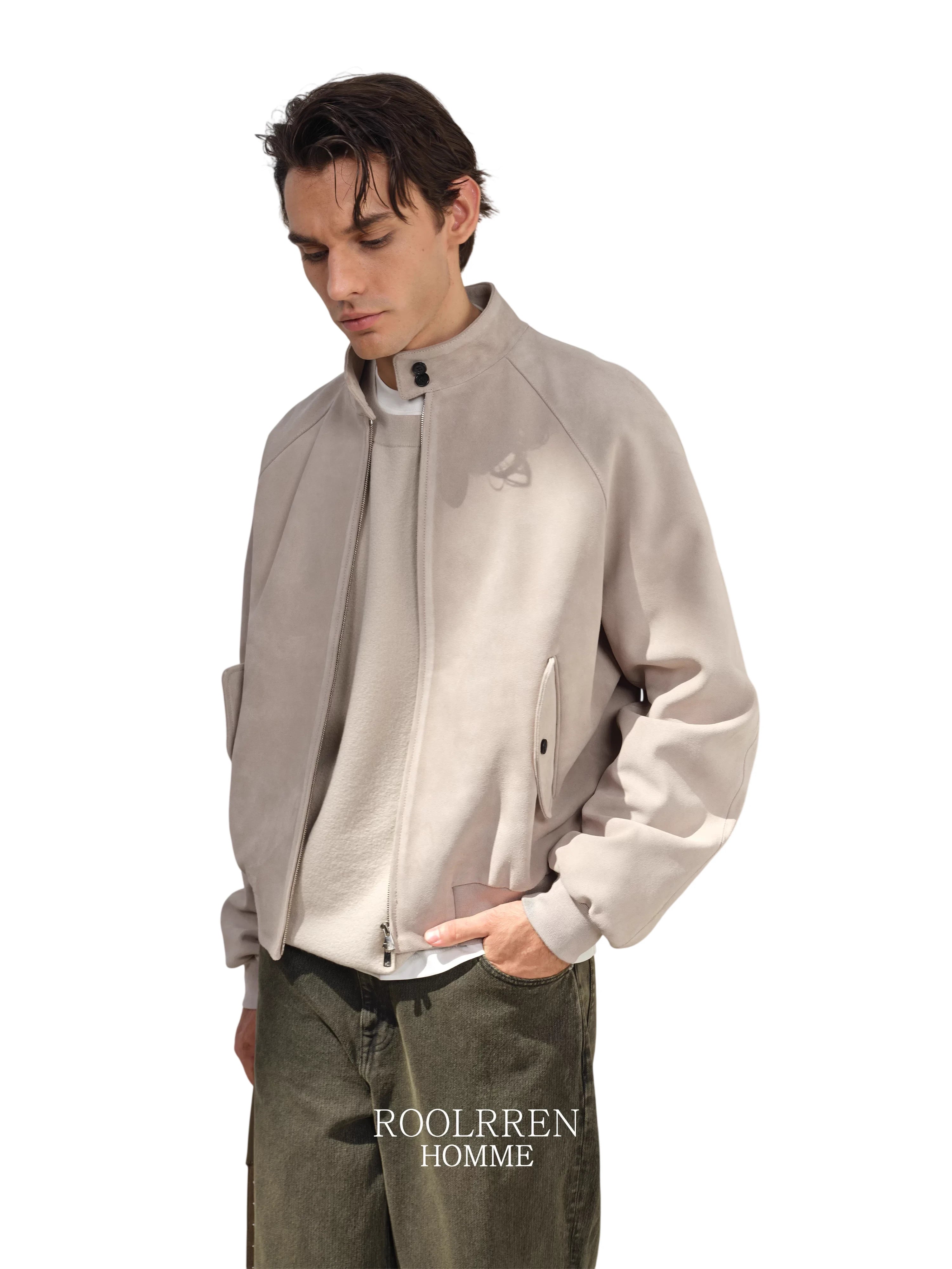 Elevate your outerwear collection with this Italian-imported suede Harrington jacket. Designed for men, this refined jacket features a retro-inspired silhouette enhanced by a modern small stand collar and streamlined tailoring. The light beige tone and genuine suede leather offer both luxury and versatility, while the clean lines and minimal seam detailing create a sophisticated look. A front zipper closure ensures ease of wear, making it ideal for both casual and smart-casual occasions.