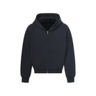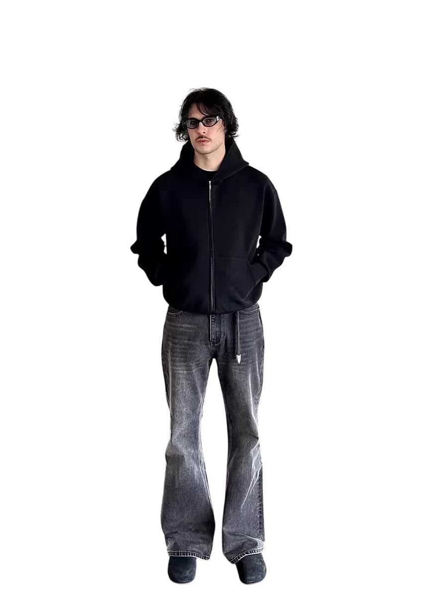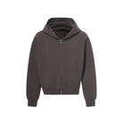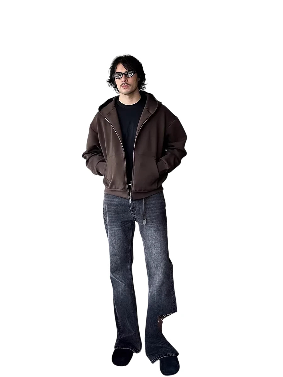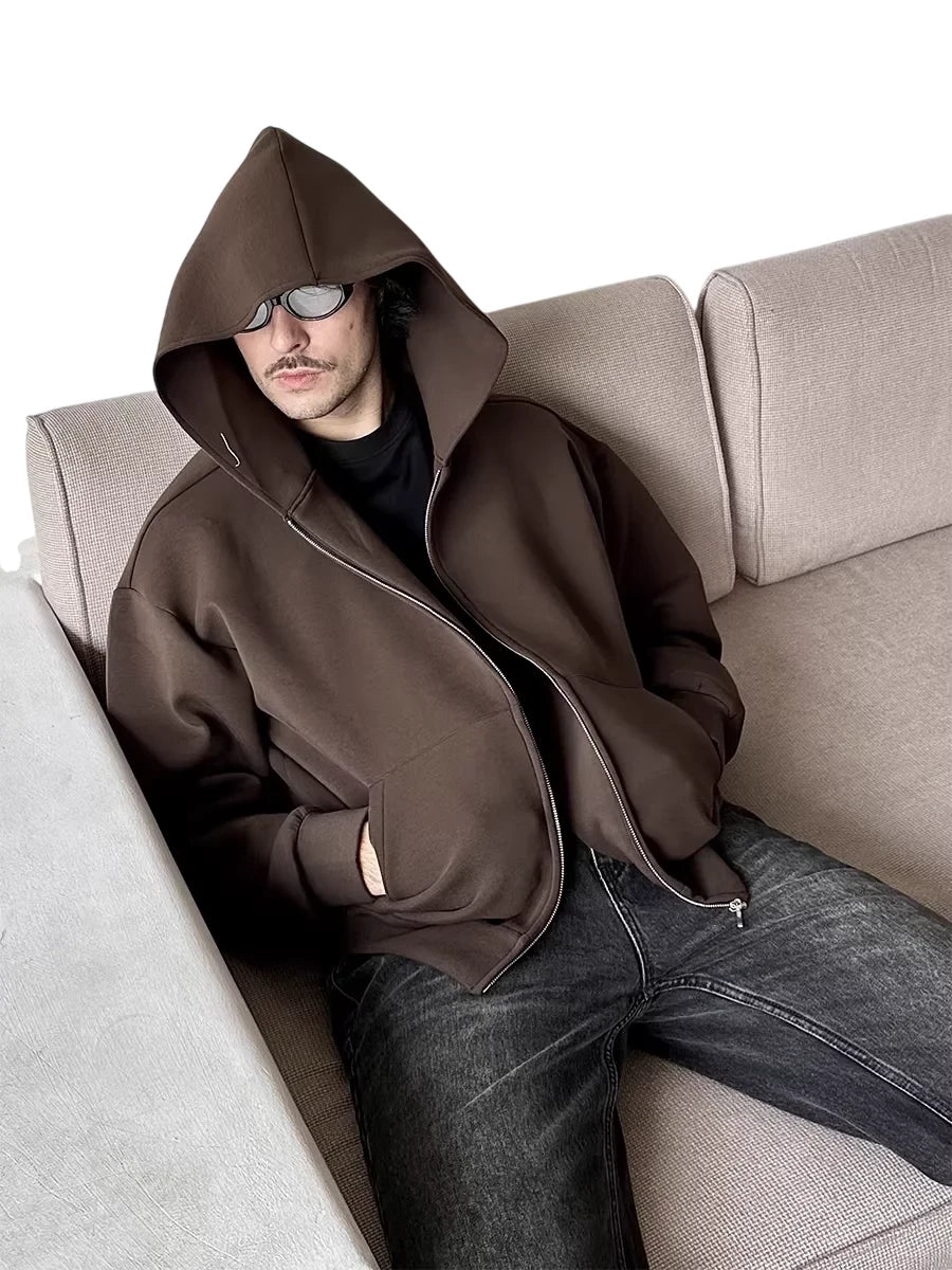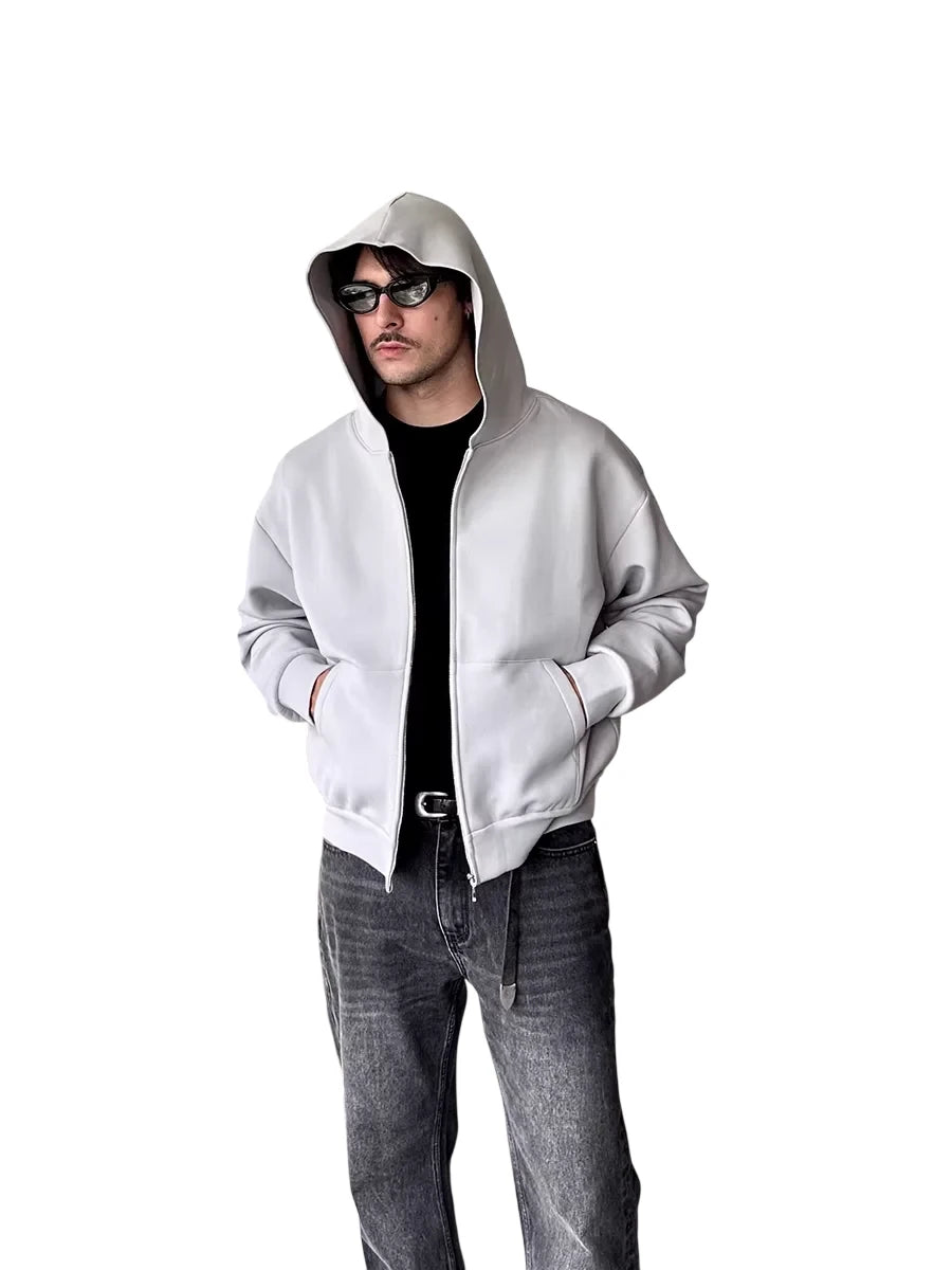 Designed for cooler weather, this men's zip-up hoodie jacket features a structured cotton air layer fabric for added warmth and comfort. The high collar and full-length zipper provide a sleek silhouette, while large front pockets offer practical storage. Available in three versatile colors—black, white, and chocolate brown—this jacket blends casual style with everyday functionality.