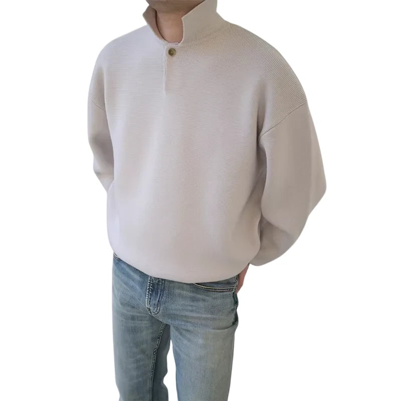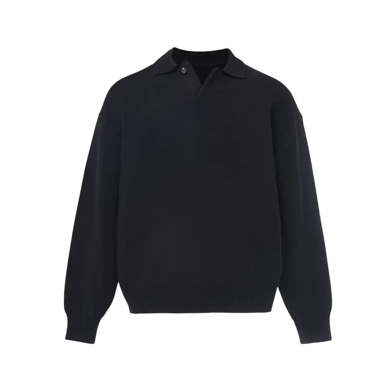 Crafted from imported Australian Merino wool, this men's long-sleeve knit polo sweater offers exceptional softness and warmth. Featuring a classic small collar and single-button placket, the sweater combines understated elegance with comfortable wear. Ribbed cuffs and hem provide a clean, tailored fit, making it a versatile choice for both casual and refined looks.
