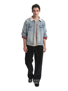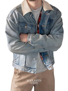 Stay warm and stylish with this men's denim jacket, featuring a light blue wash and cozy inner plaid flannel lining in red, navy, and white. Designed with a beige corduroy collar and classic buttoned flap pockets, this thick, dual-layered outerwear piece offers a rugged yet refined look ideal for colder weather.