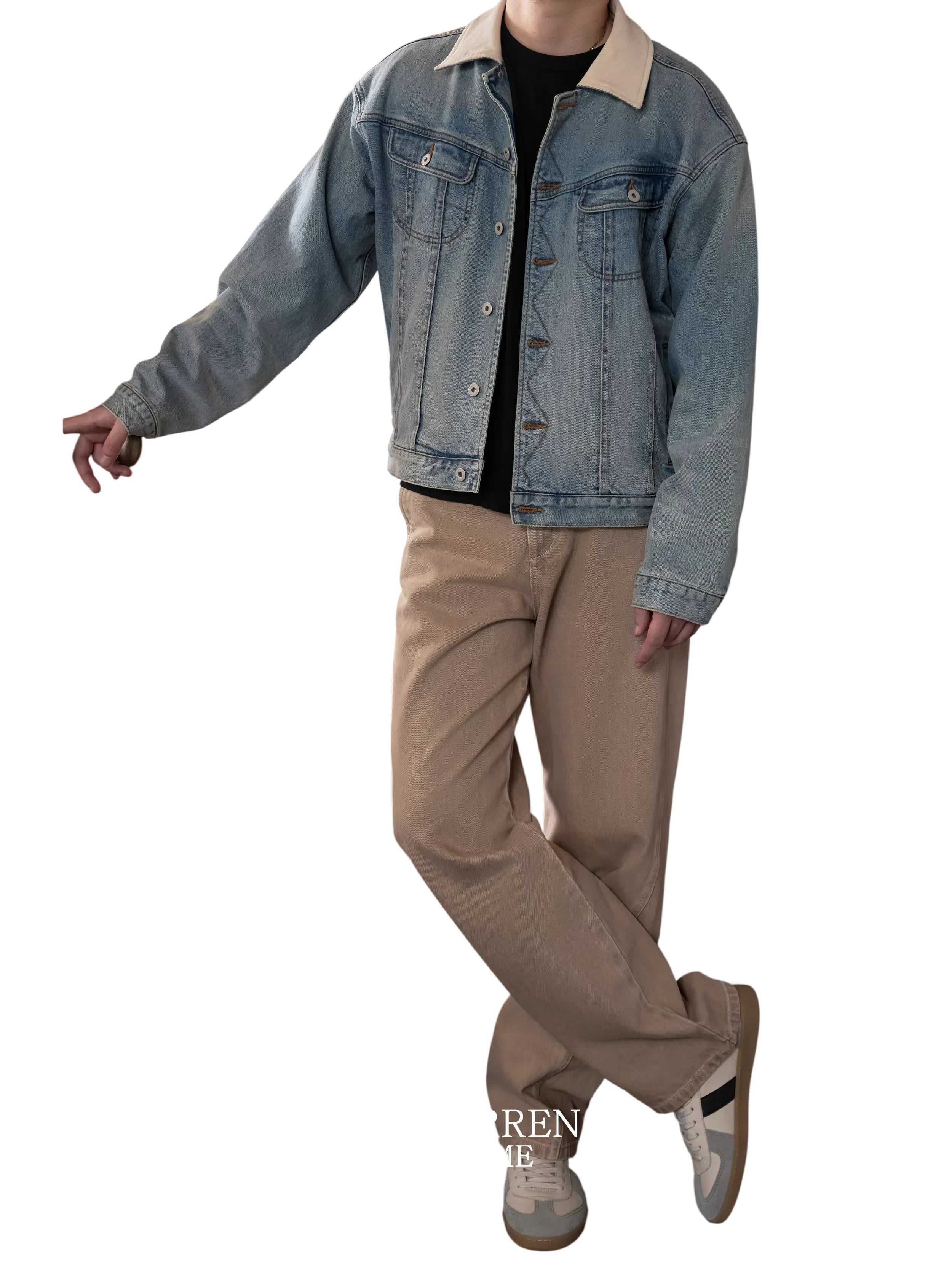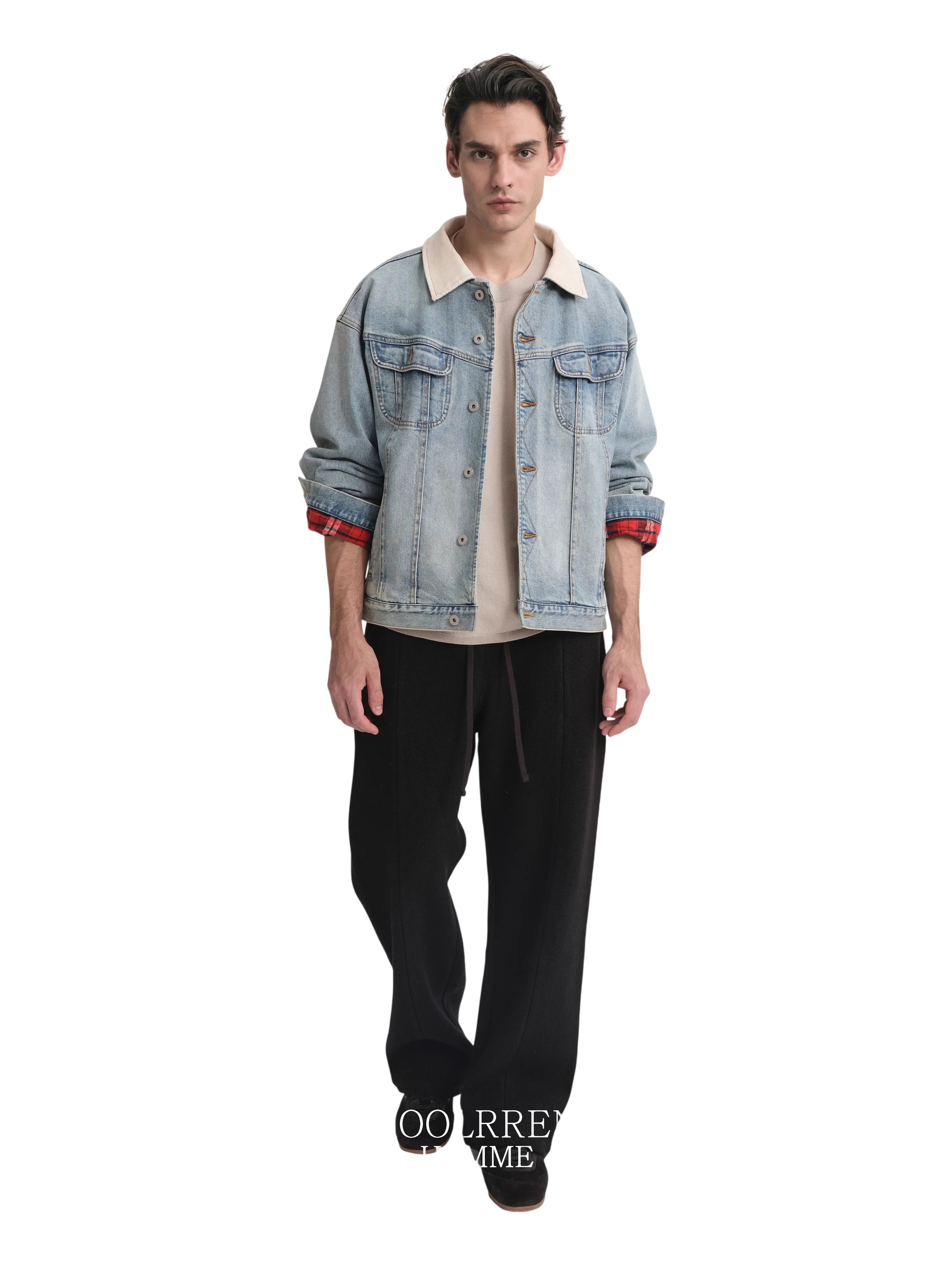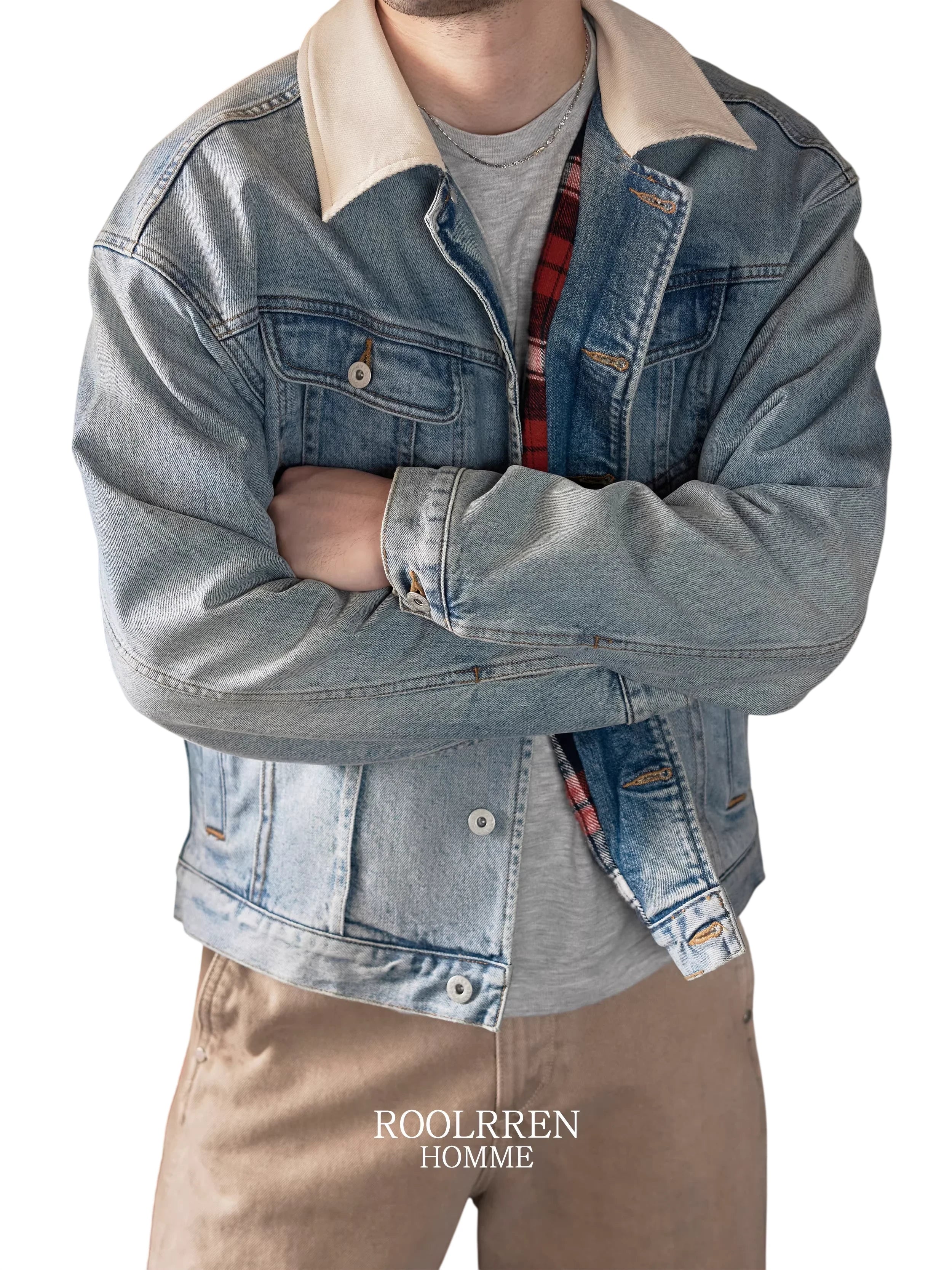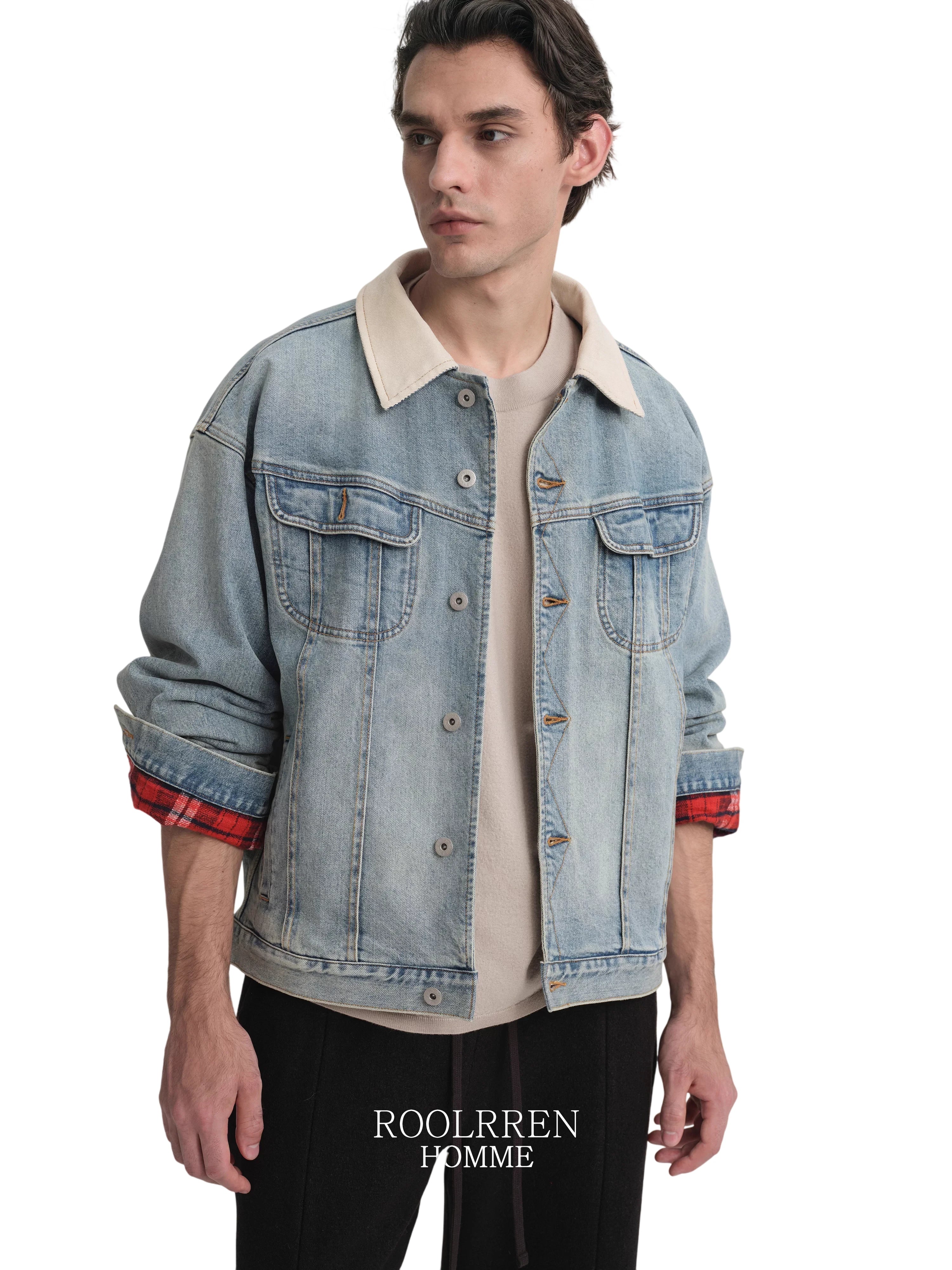 Roolrren homme Men's Plaid Lined Corduroy Collar Denim Jacket