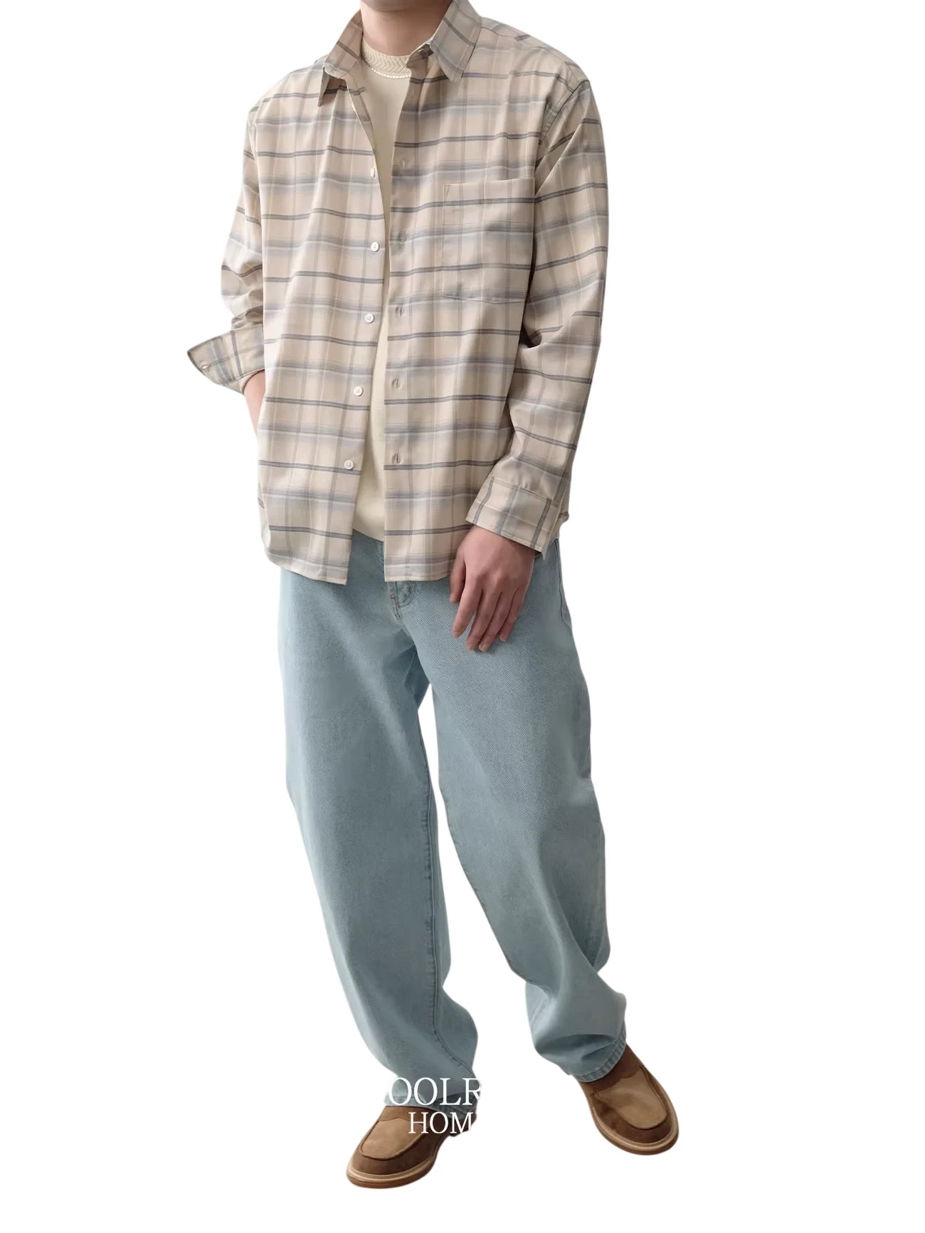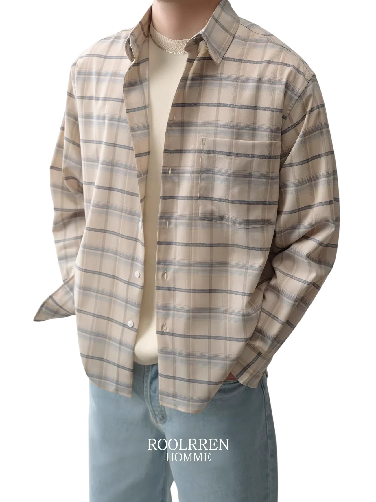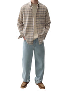 Elevate your wardrobe with this men's relaxed fit plaid shirt, crafted from ultra-fine 140s first-cut pure wool for exceptional softness and comfort. The custom-woven fabric features a subtle plaid pattern in beige, cream, and soft grey tones, offering a refined and understated look. This long-sleeve shirt is designed with a classic point collar, a functional left chest pocket, and a clean button-front closure. Ideal for both casual wear and elevated layering.