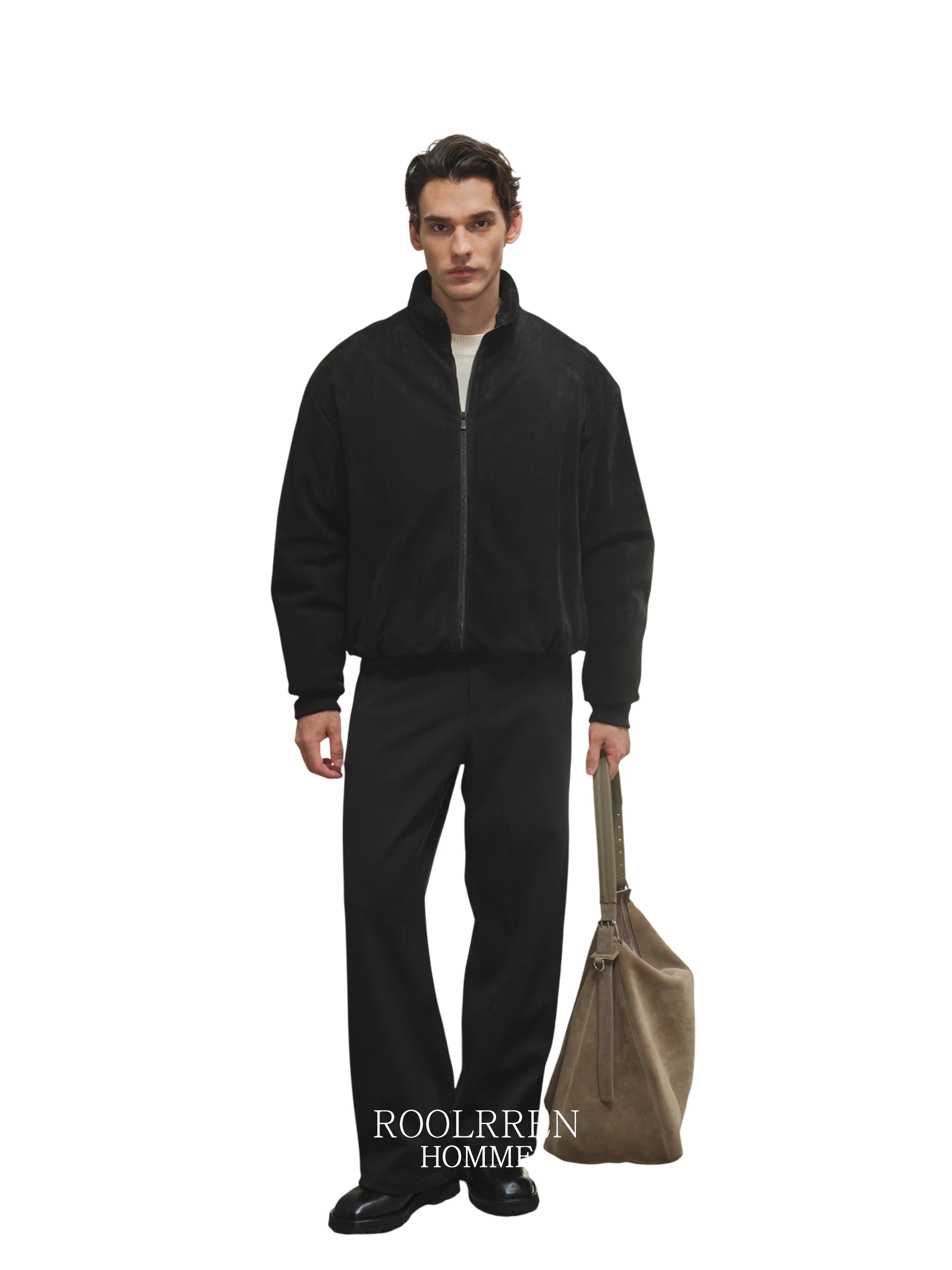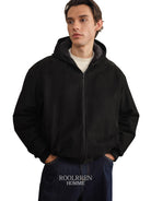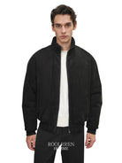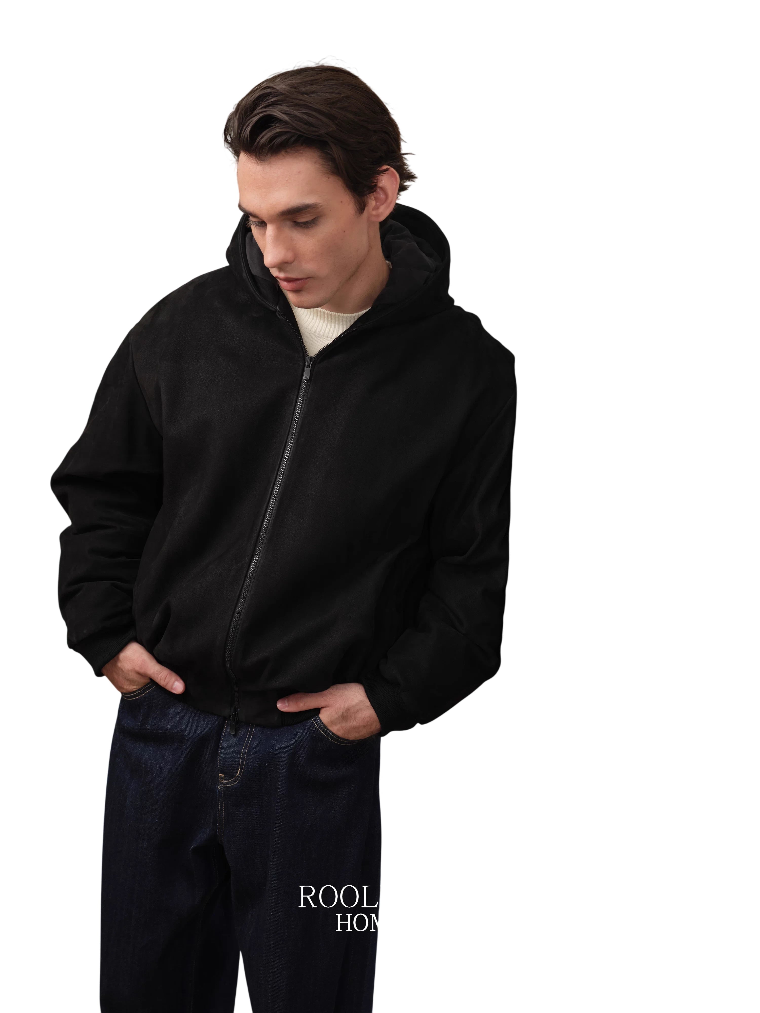 This men's oversized down jacket features a luxurious calf suede texture with a matte finish for a sophisticated look. Designed with a high stand collar and a cozy hood, it offers both warmth and style. The plush suede-like material provides a soft touch, while its relaxed fit ensures comfort in colder weather.