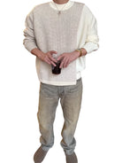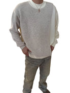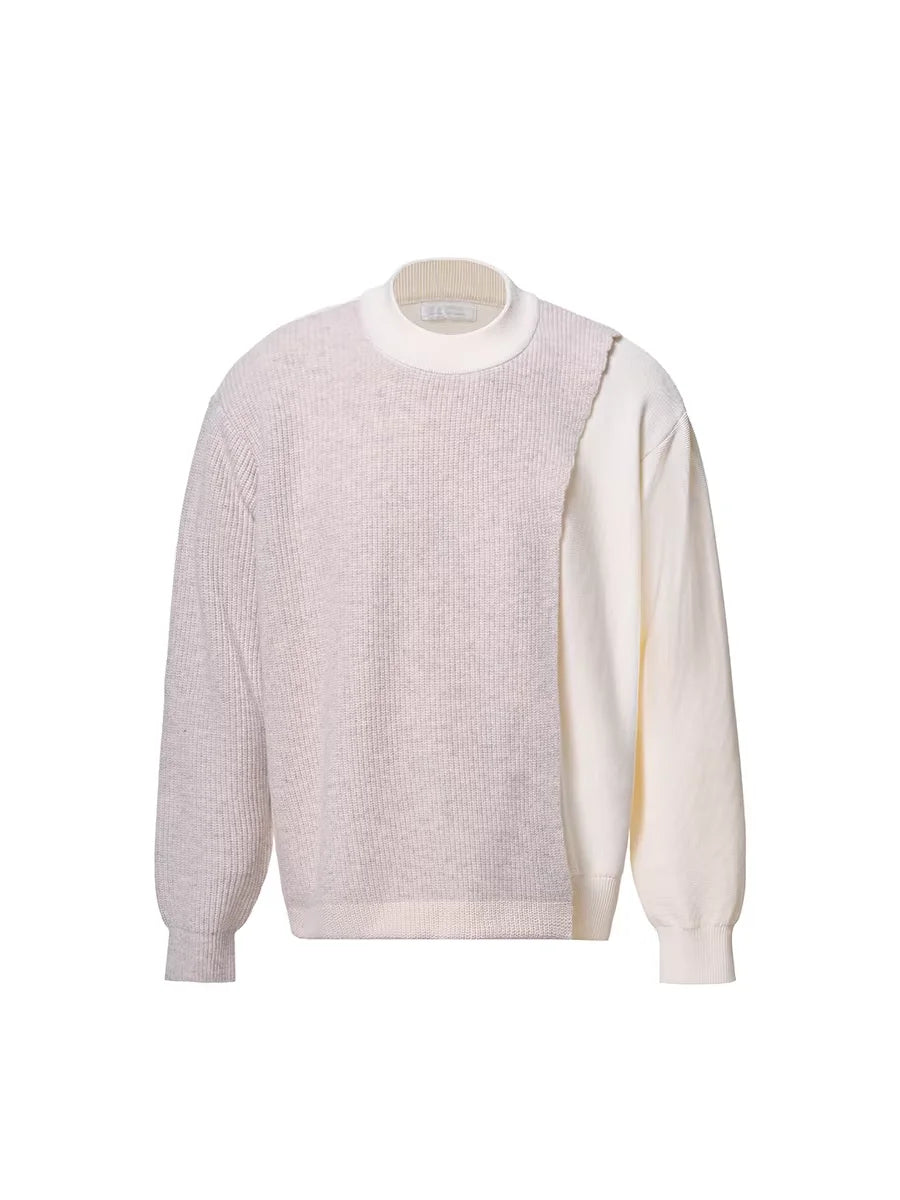 This women's pullover sweater features a minimalist, modern design with a unique layered look. Crafted from high-quality wool, it showcases an asymmetrical dual-tone style—one side in beige ribbed knit and the other in solid off-white. Designed with a high round neckline and long sleeves, this relaxed-fit sweater offers both warmth and style, making it ideal for casual and elegant winter wear.