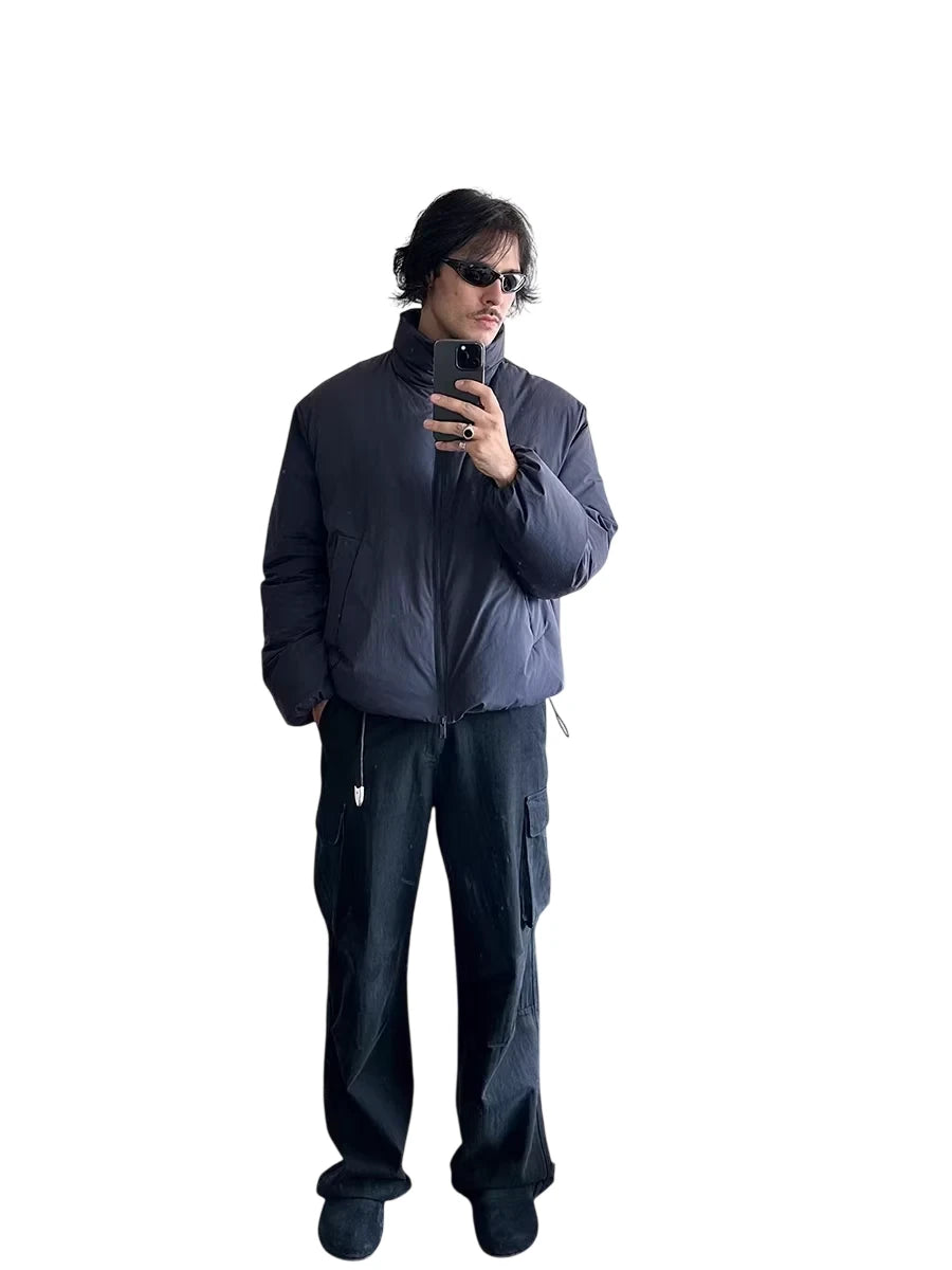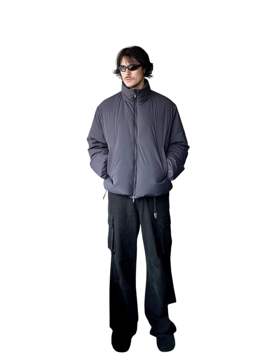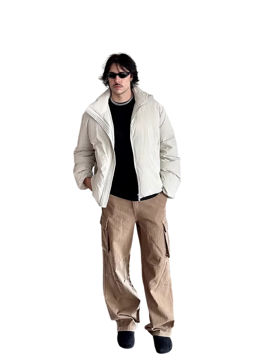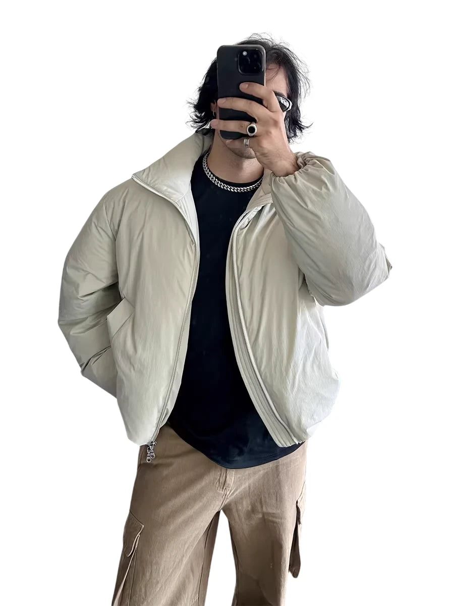 Stay warm and stylish with this lightweight insulated down jacket, designed for minimalist urban commuting. Featuring a high stand collar, full-length sleeves, and a water-resistant exterior, this loose-fitting jacket is filled with white duck down for reliable insulation. The clean design and neutral color options make it a versatile choice for cold weather wear.