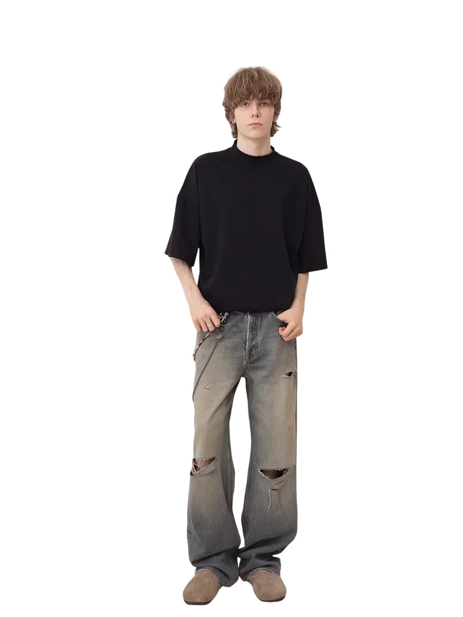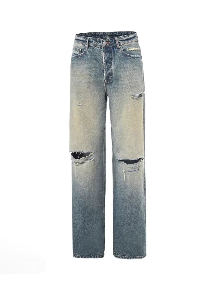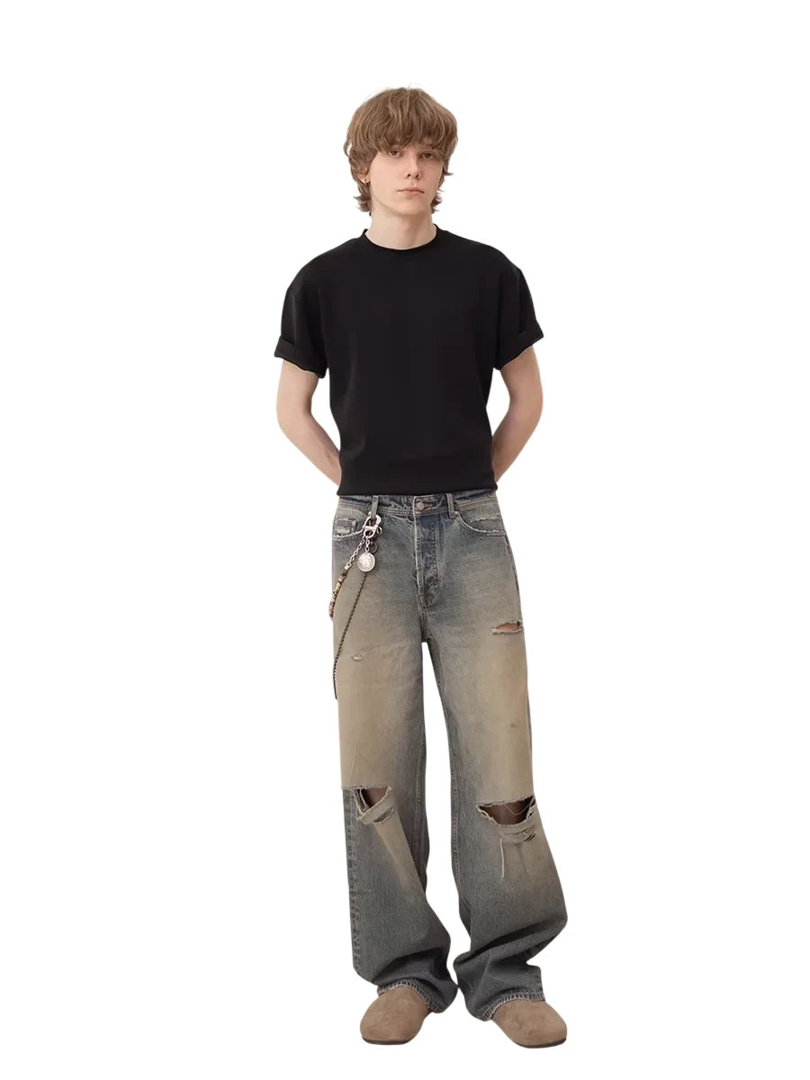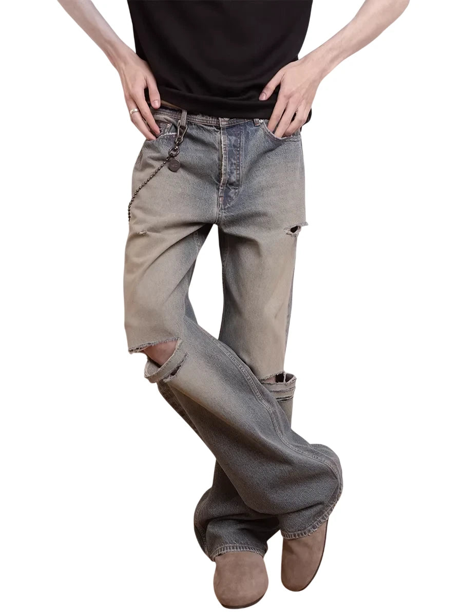 These mud-dyed distressed straight-leg jeans offer a bold streetwear look with a relaxed silhouette. Designed for men, the jeans feature heavy distressing at the knees, a gradient light blue to grey wash, and flared hems that stack over footwear for a laid-back vibe. A stylish metal chain accent adds urban edge, perfect for making a fashion-forward statement.
