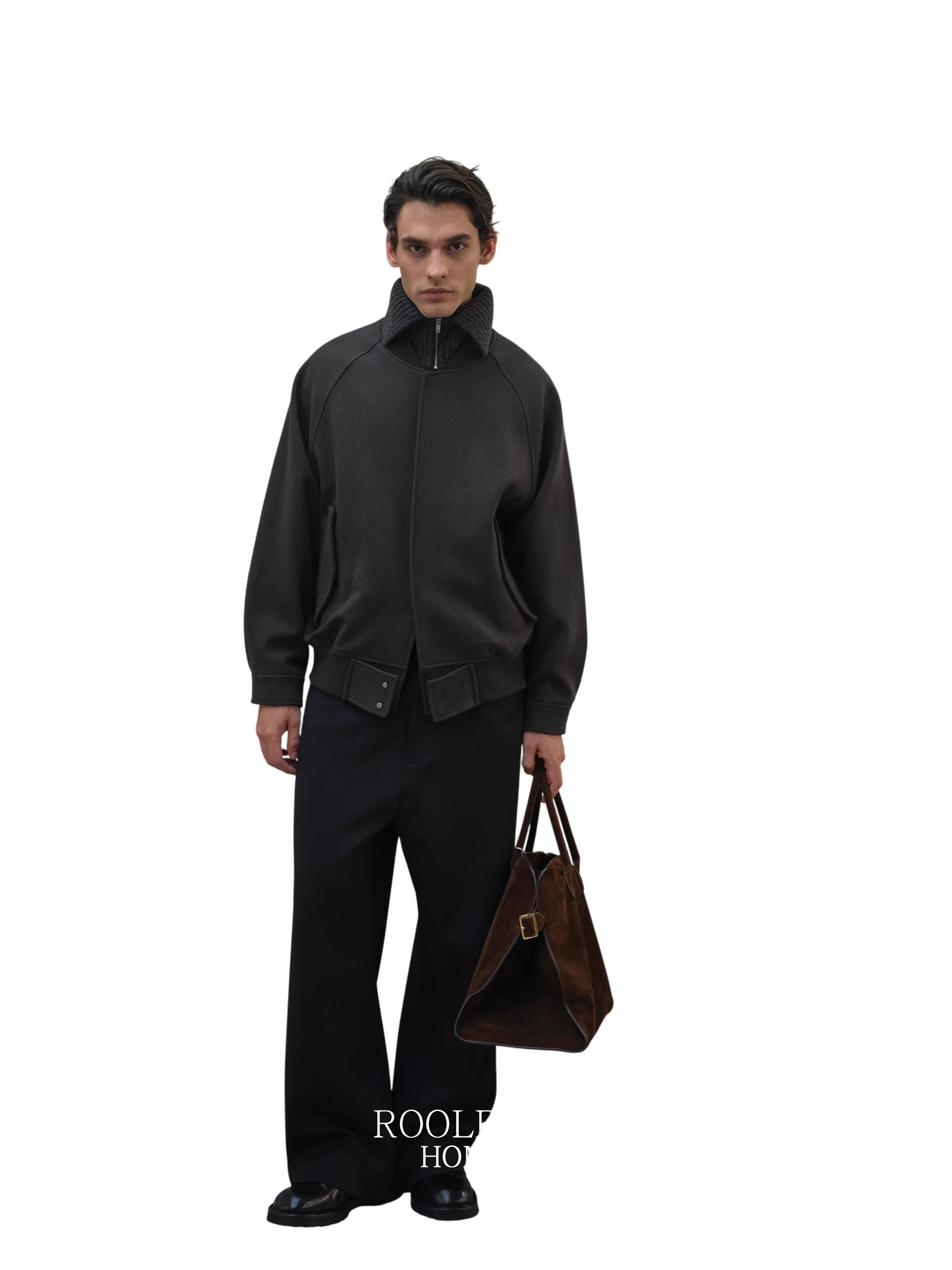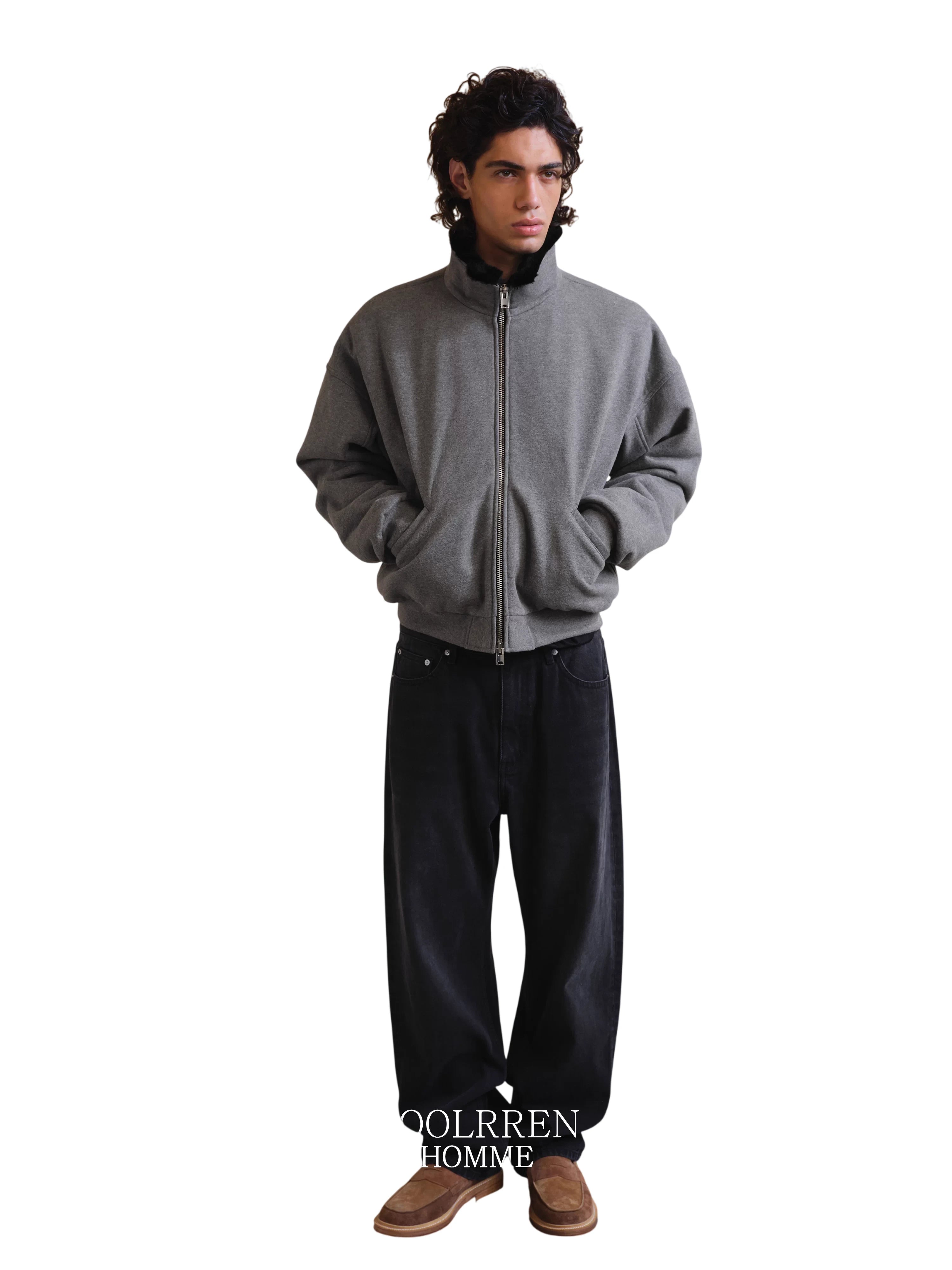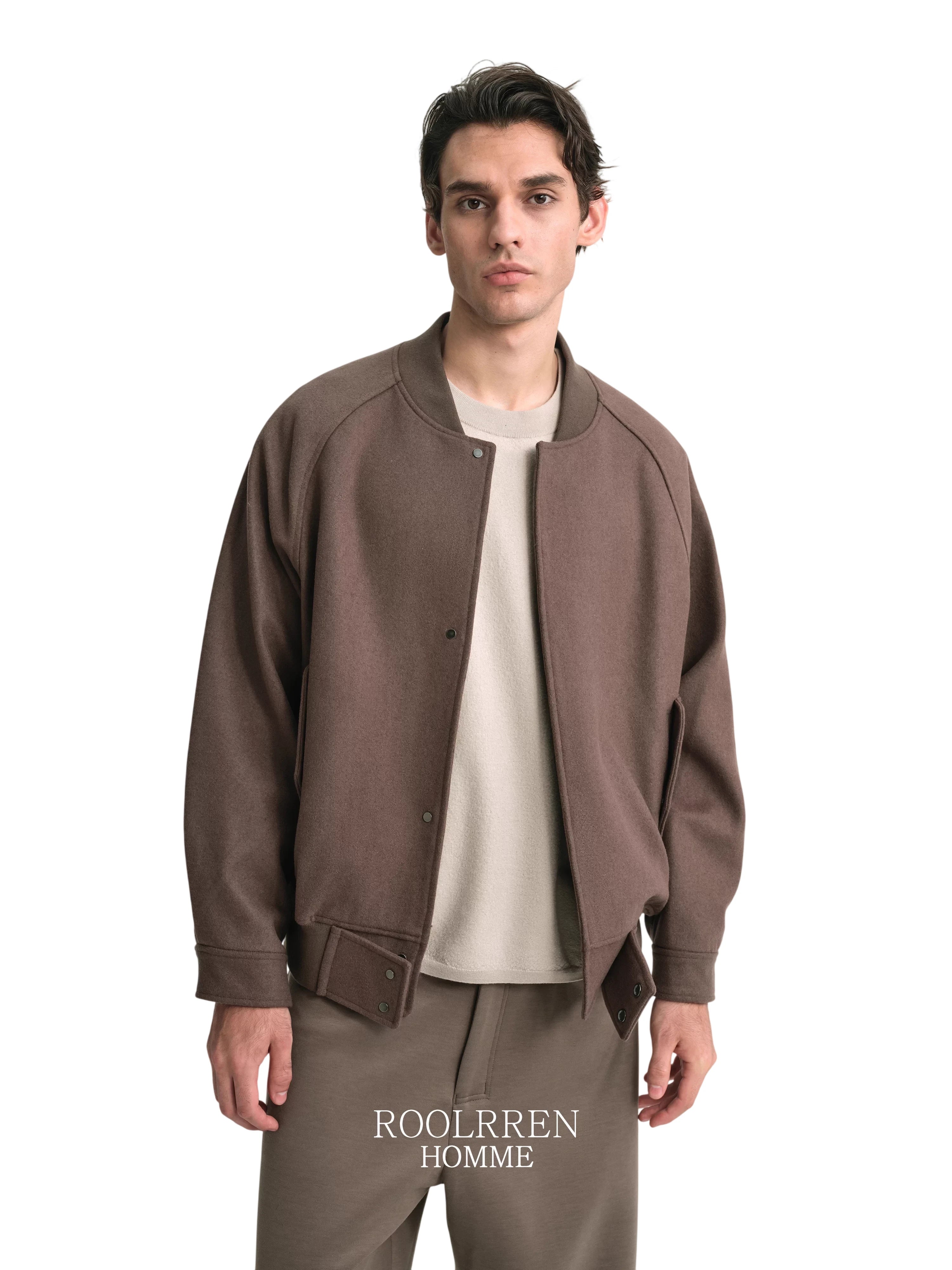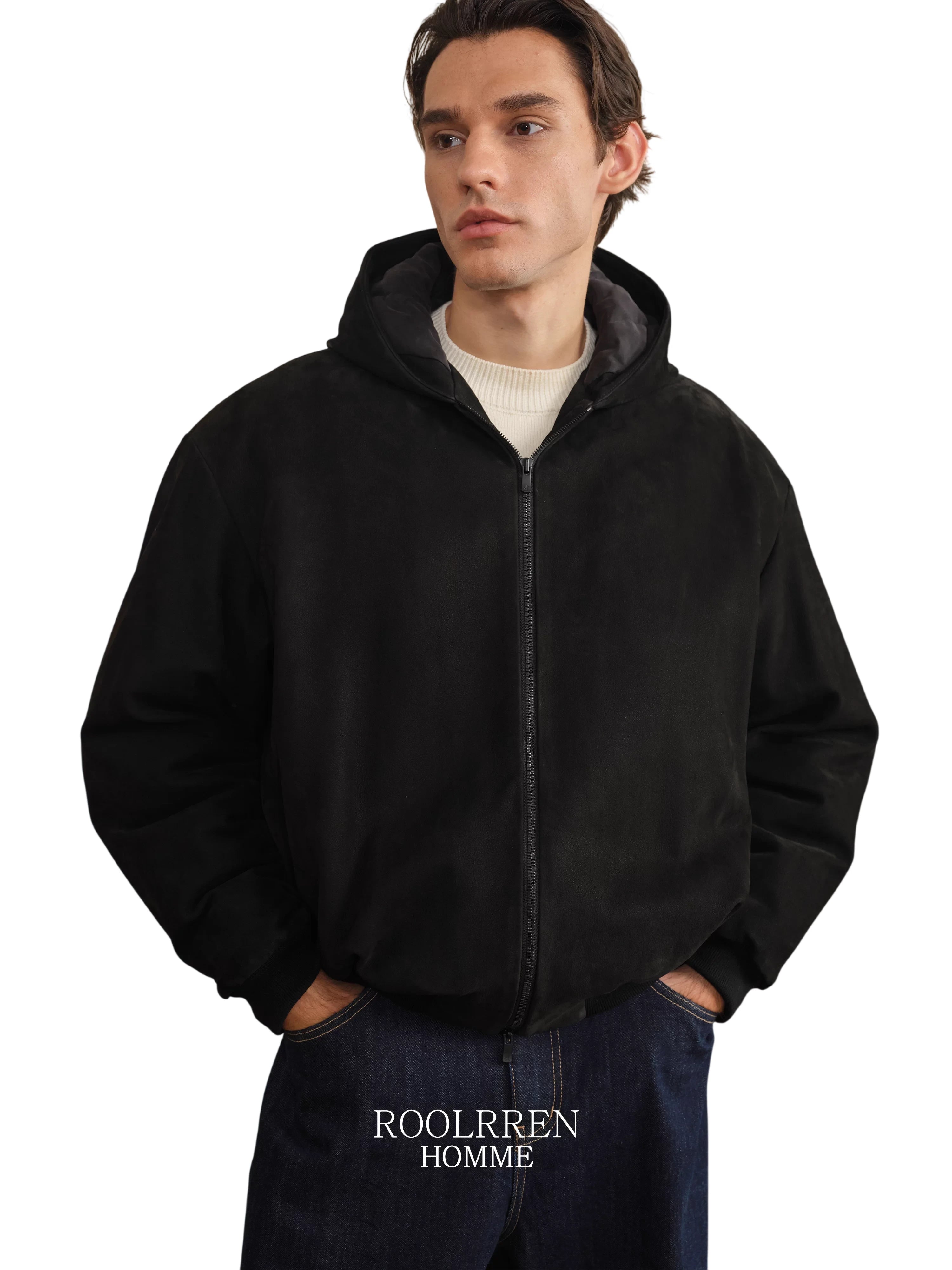 Roolrren homme Men's Sheepskin Leather Jacket with Wool Lining and Turn-Down Collar