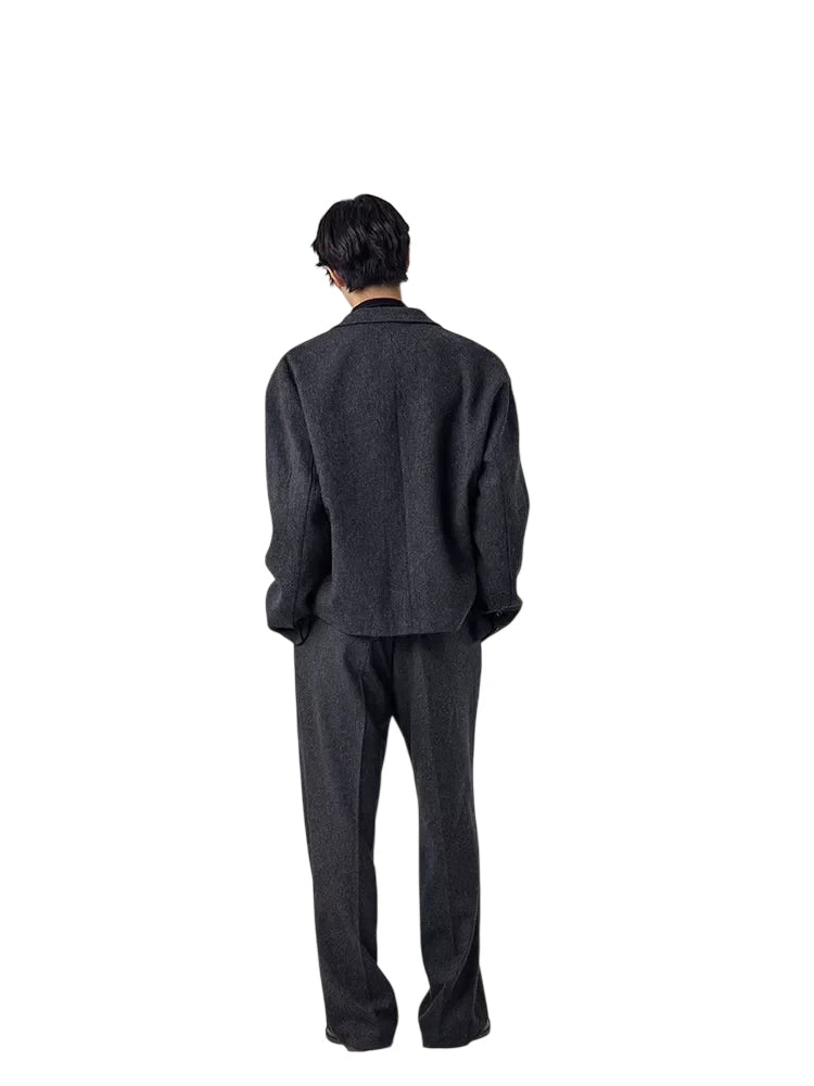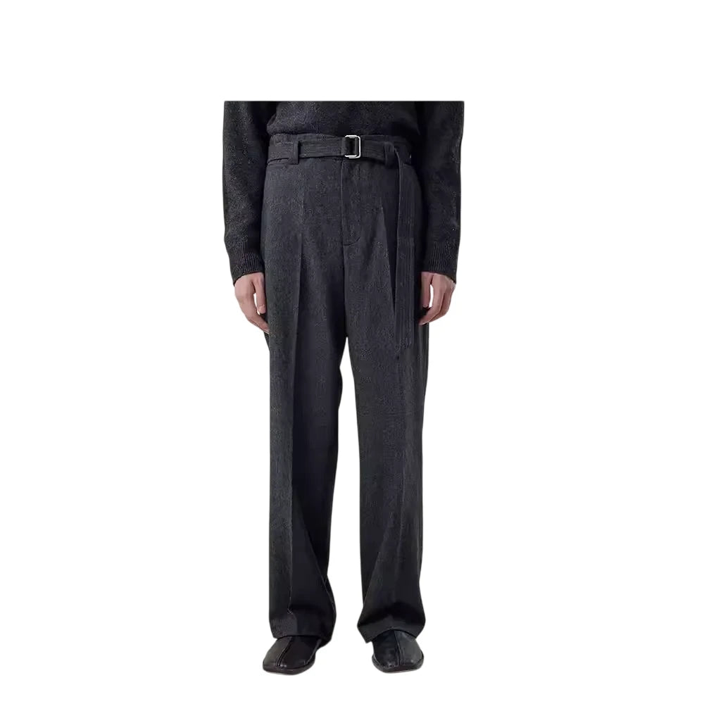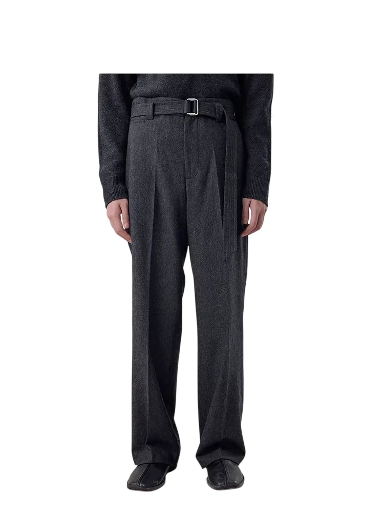 Designed for refined urban comfort, these heather grey trousers are tailored from fine merino wool with a subtly textured finish. Featuring a high-waisted cut and wide-leg silhouette, they offer a natural drape and relaxed fit. Deep front pleats and a matching belt with a rectangular buckle add structure and adjustability. Ideal for the modern male commuter, these trousers combine classic tailoring with contemporary ease.