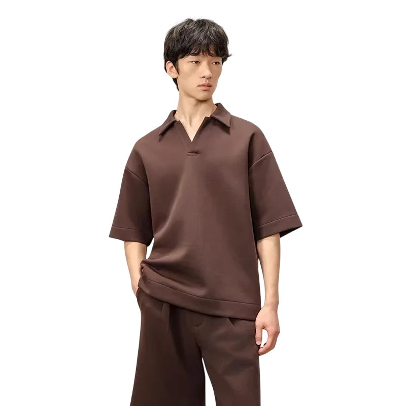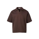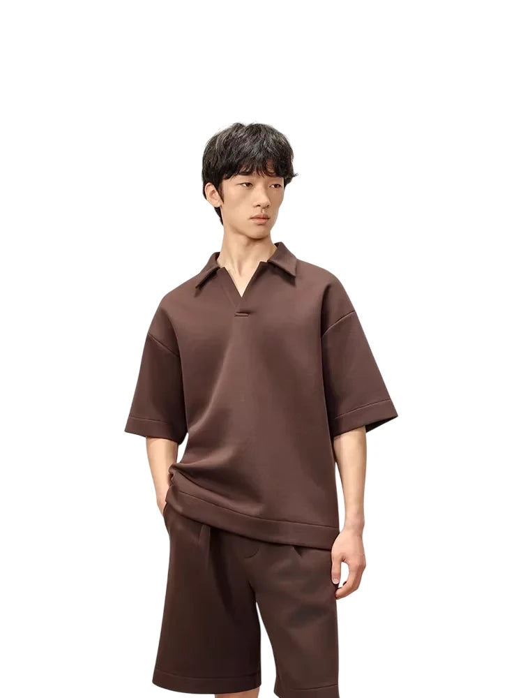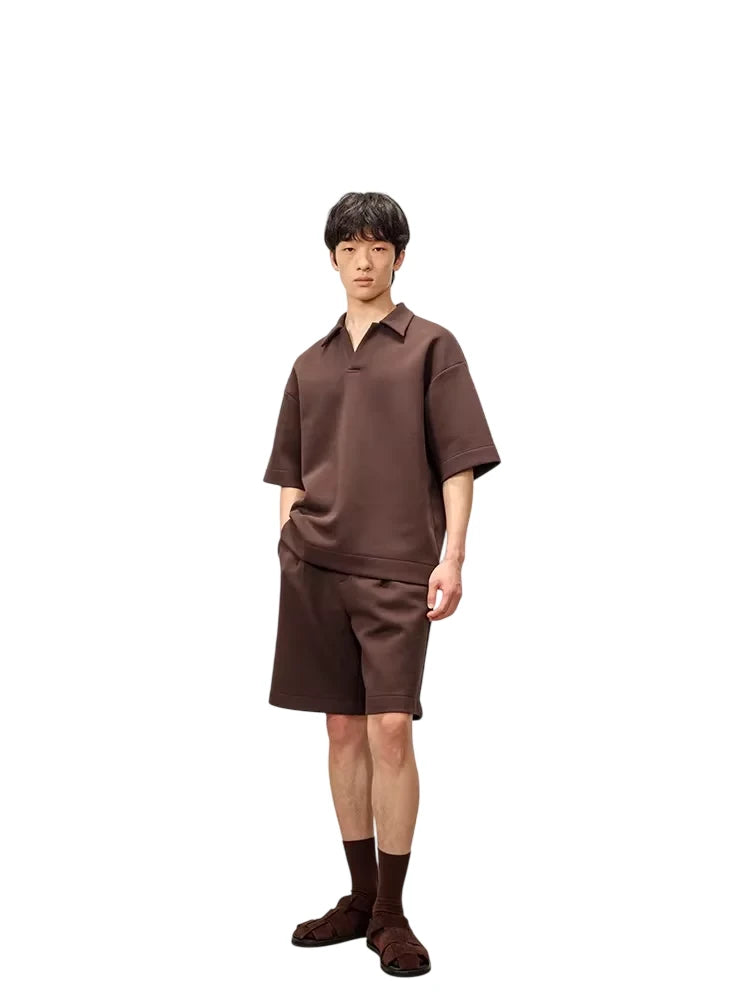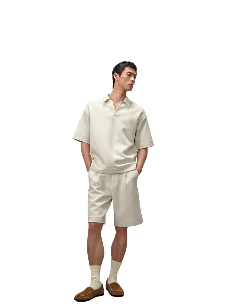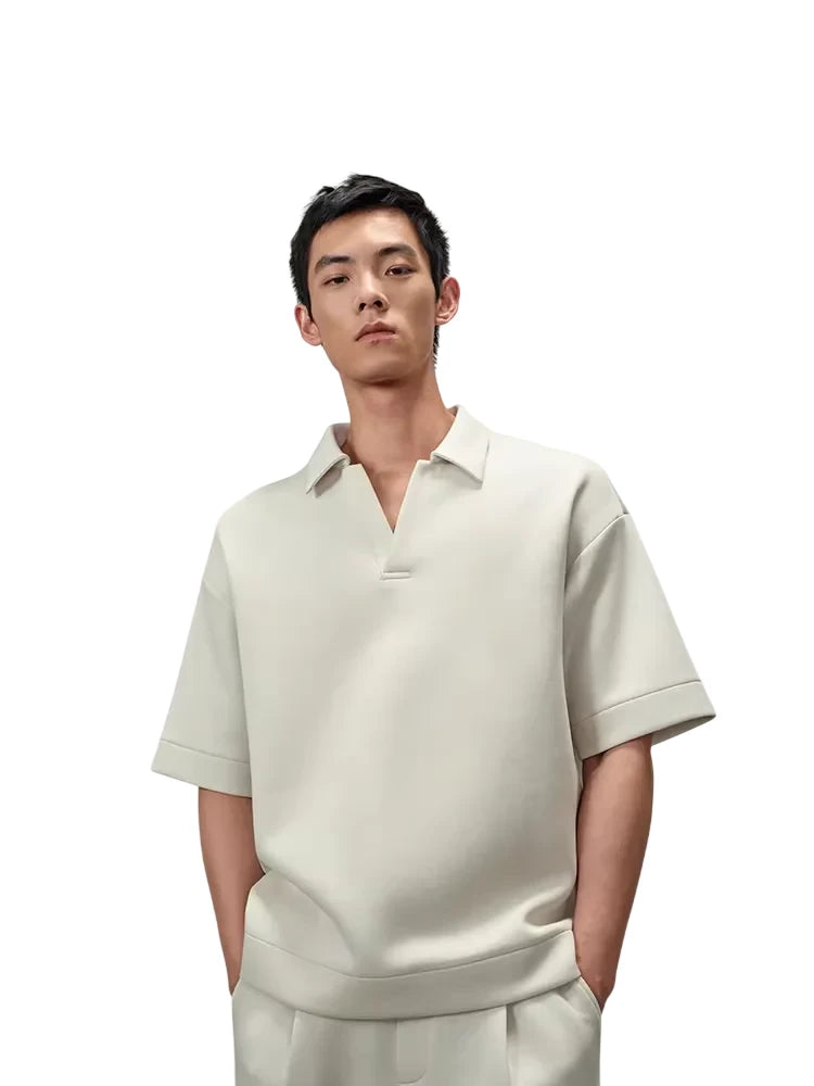 This men's short sleeve polo is crafted from heavyweight, double-sided air layer fabric that offers superior structure and comfort. Featuring a relaxed fit with dropped shoulders and wide sleeves, it delivers a modern, casual look. Three-dimensional tailoring enhances its clean silhouette, while the sporty collar with a subtle notch adds refined athletic appeal. Perfect for a contemporary everyday ensemble.