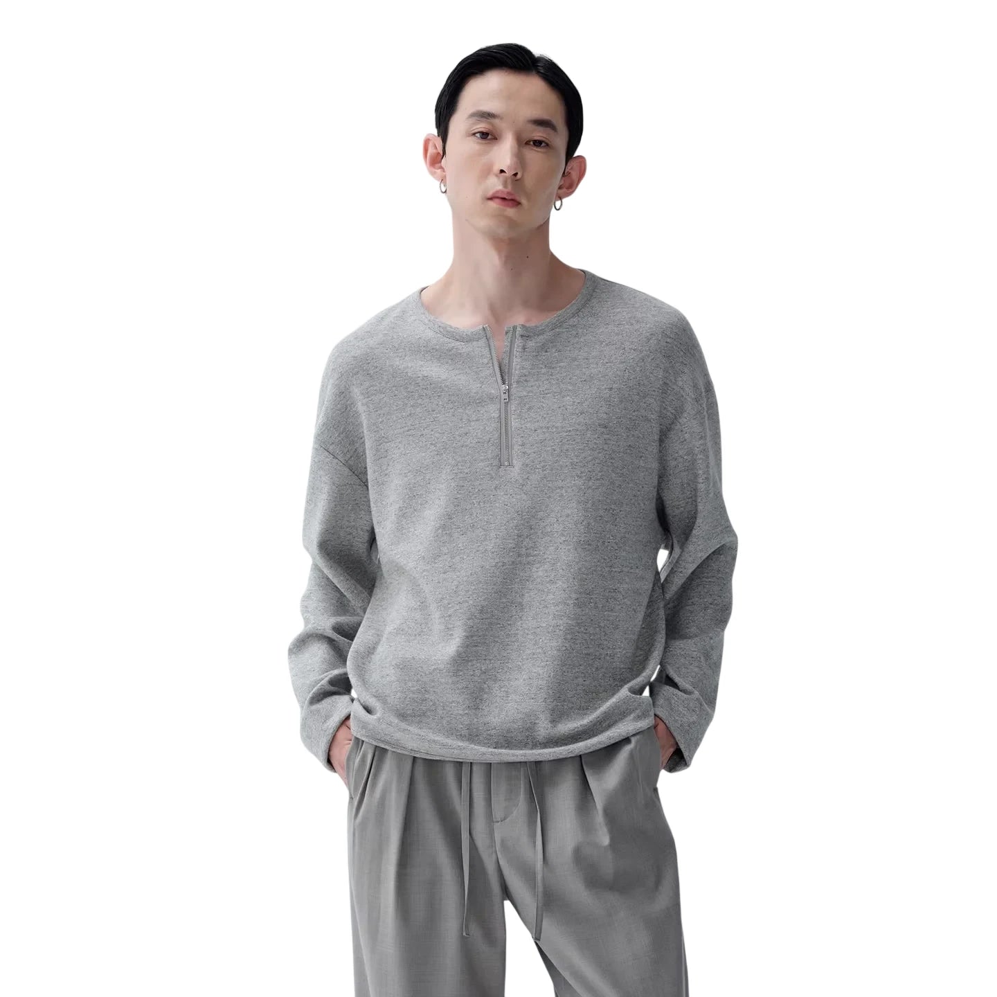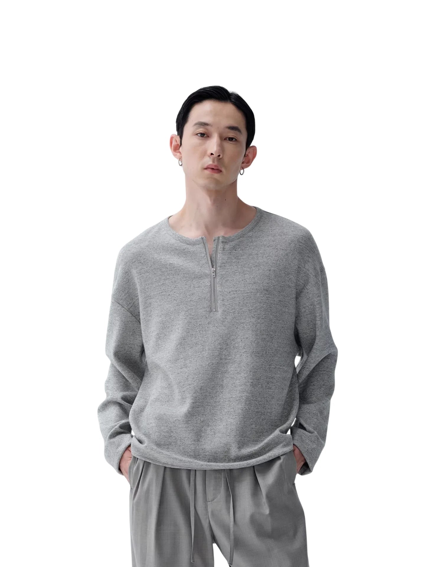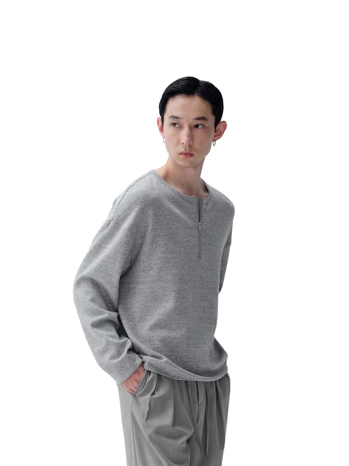 This men's long sleeve half-zip Henley combines the luxurious feel of silk and wool in a light heather gray blend. Designed with a relaxed fit and dropped shoulders, it offers both comfort and style for versatile wear. The quarter-zip detail adds a modern, athletic touch, while the heathered texture gives the piece a refined, casual appeal. Ideal for minimalist dressing, this top is as sophisticated as it is comfortable.