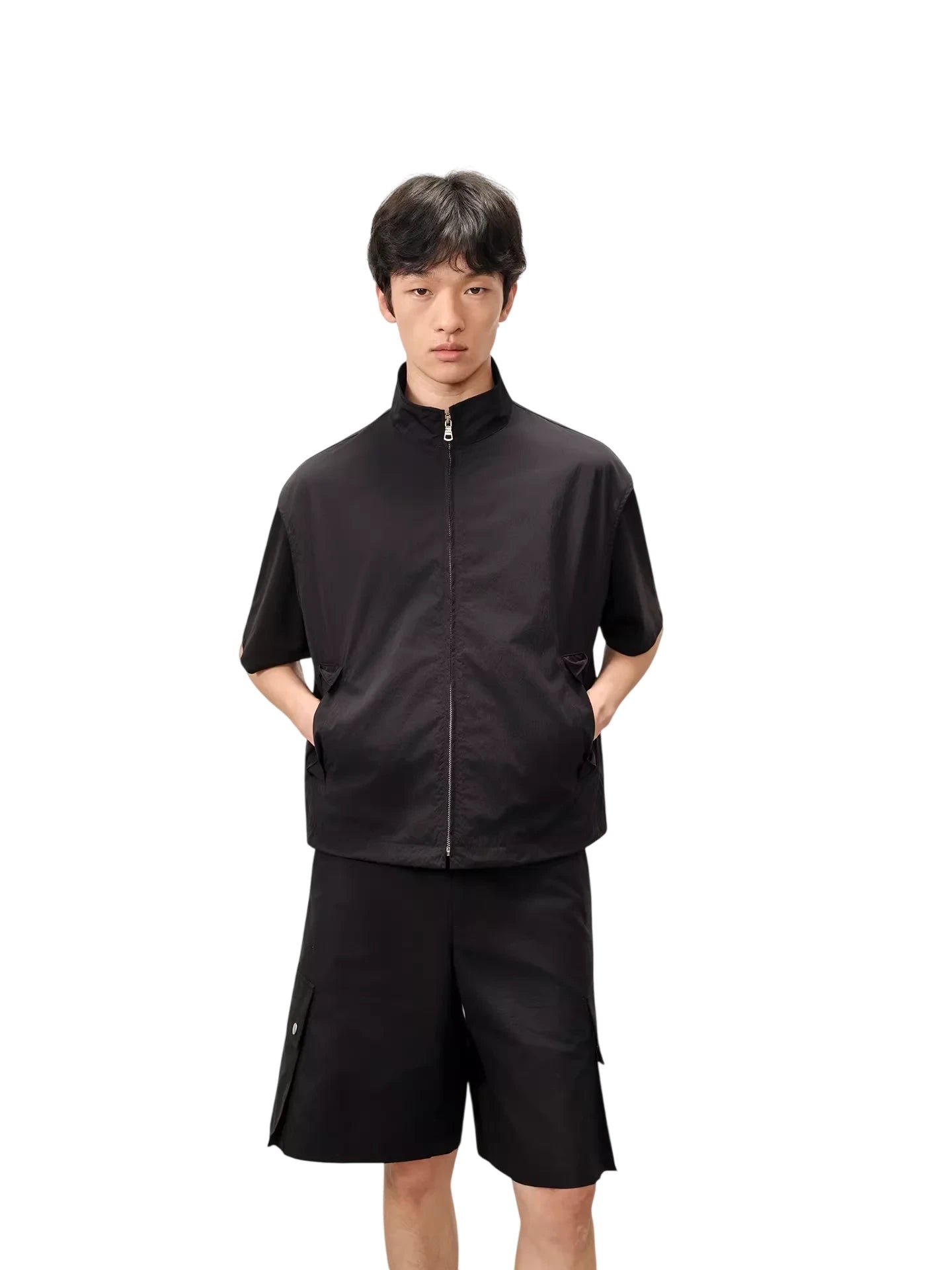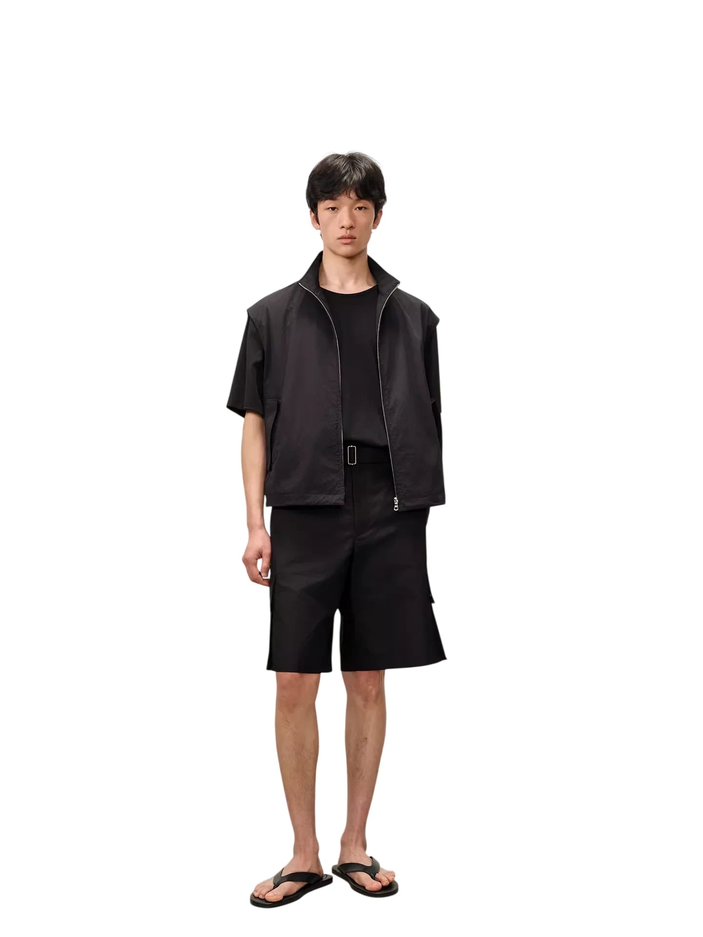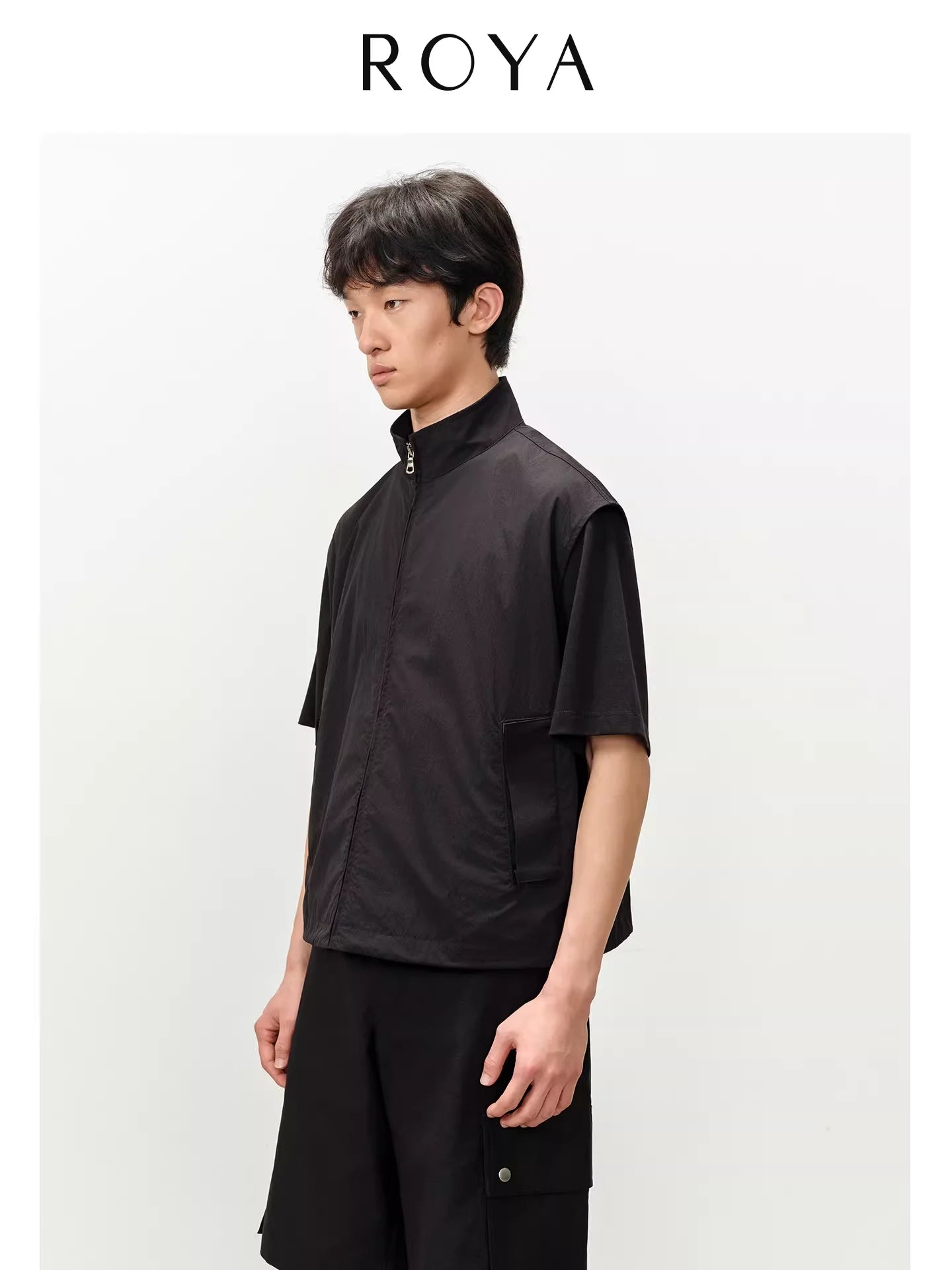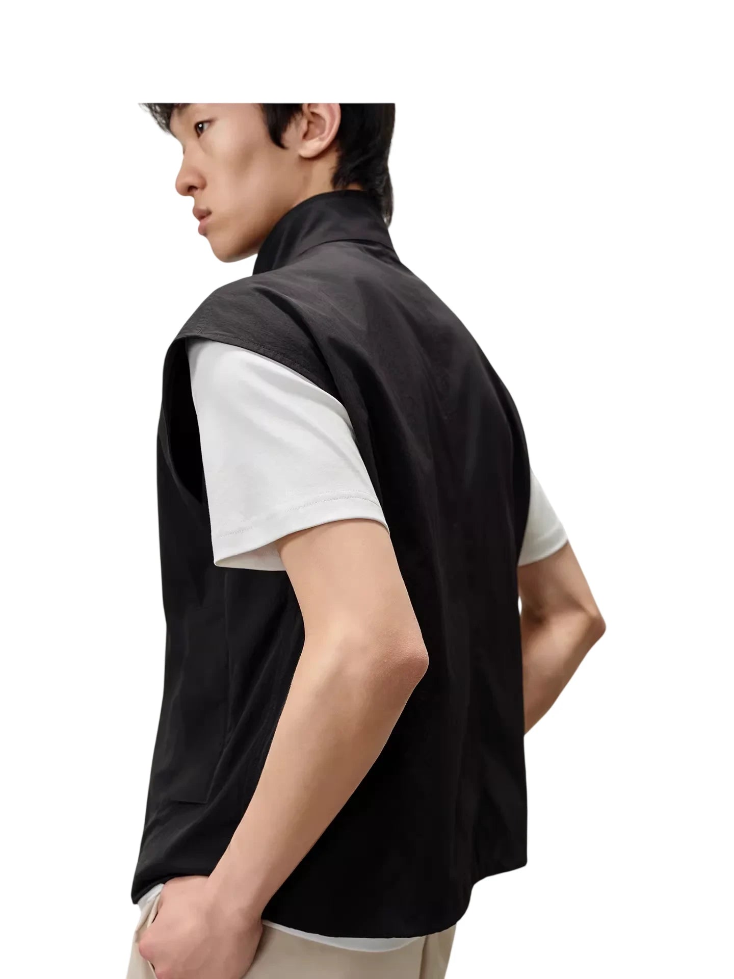 Designed with functionality and minimalist aesthetics in mind, this men's zip-up vest features a stand collar and a matte, water-repellent nylon finish. Lightweight and versatile, it includes adjustable straps for a customizable fit and clean silhouette, making it ideal for casual or streetwear styling. Pair it effortlessly with utility-inspired pieces for a complete look.