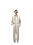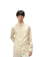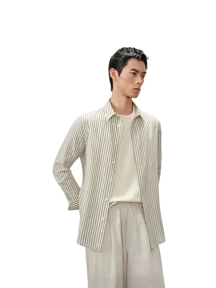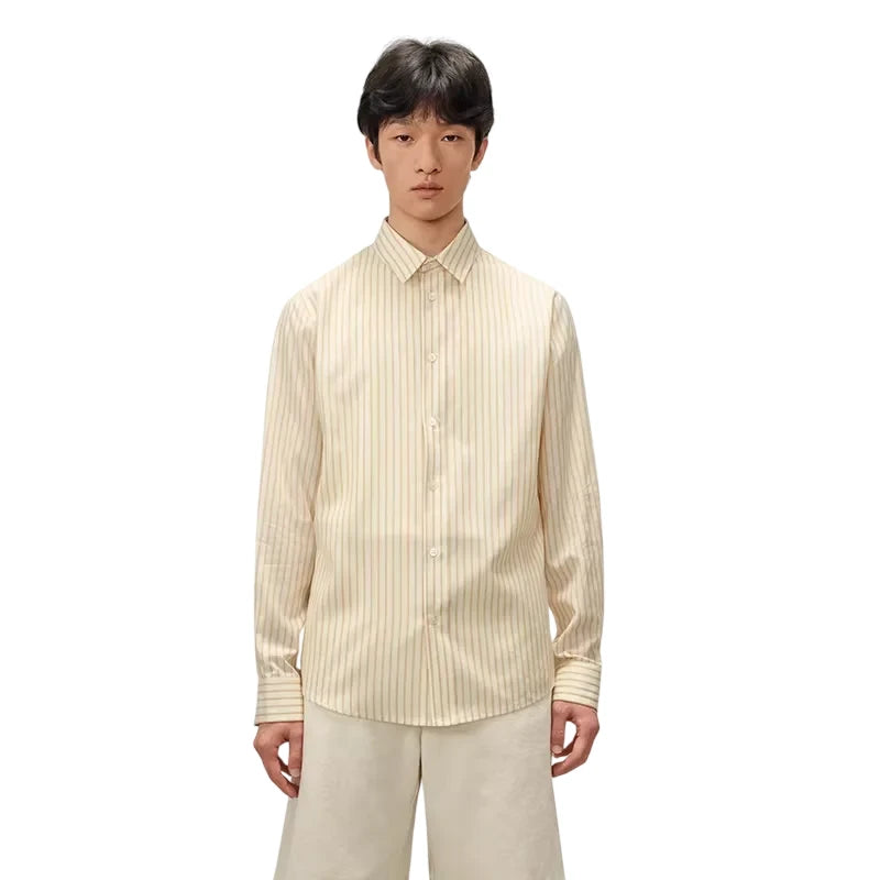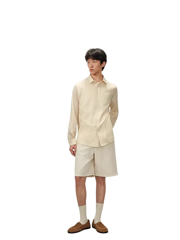 This men's long sleeve formal shirt features a refined blend of lyocell and silk, offering a smooth texture with a graceful sheen. Designed with subtle vertical stripes in muted yellow and brown on a soft cream base, it presents a clean and sophisticated look. The shirt includes a classic collar, a button-down front, and a tailored fit with gentle draping at the sides. Ideal for formal settings, its understated elegance provides both comfort and style.
