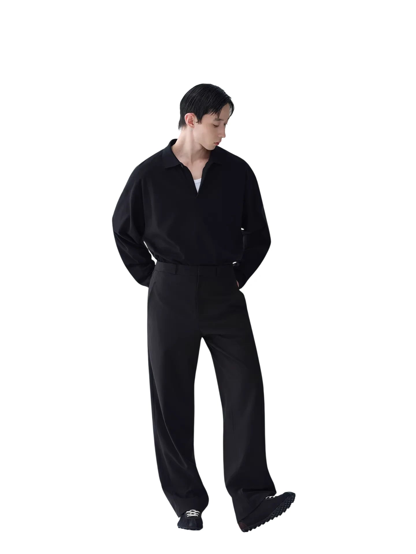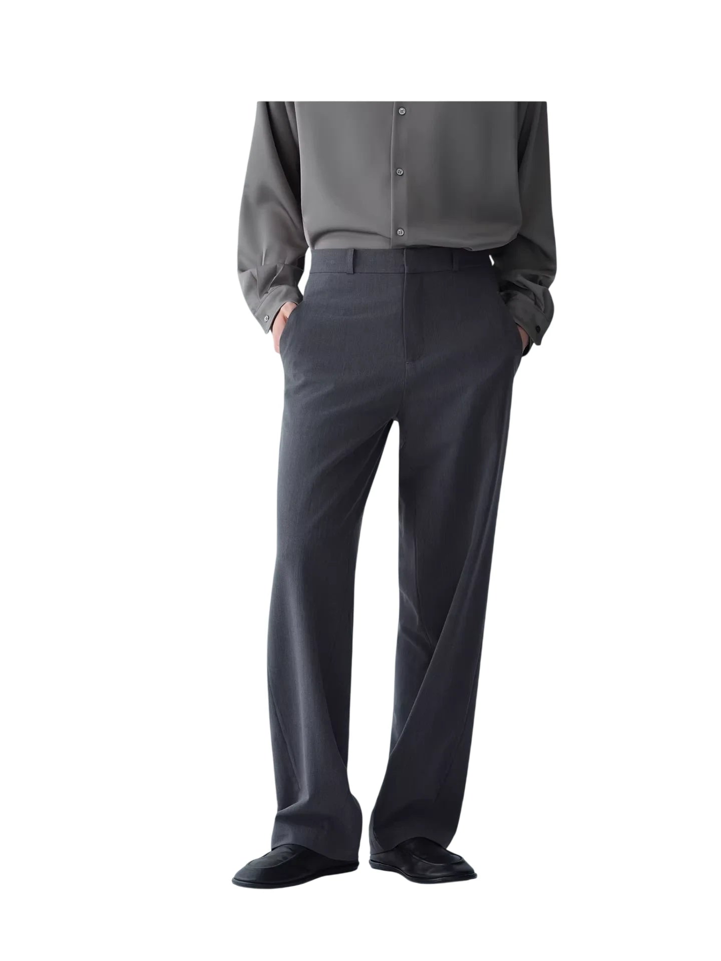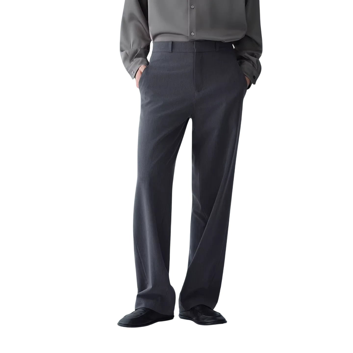 These men's tailored trousers are crafted from a luxurious Tencel wool blend, offering a refined balance of comfort and style. Featuring a semi-elastic waistband, slanted side pockets, and a straight-leg silhouette, they provide a relaxed yet polished appearance. The minimalist front design is complemented by imported hardware and a smooth, clean cut, making them ideal for both business casual and smart everyday wear.