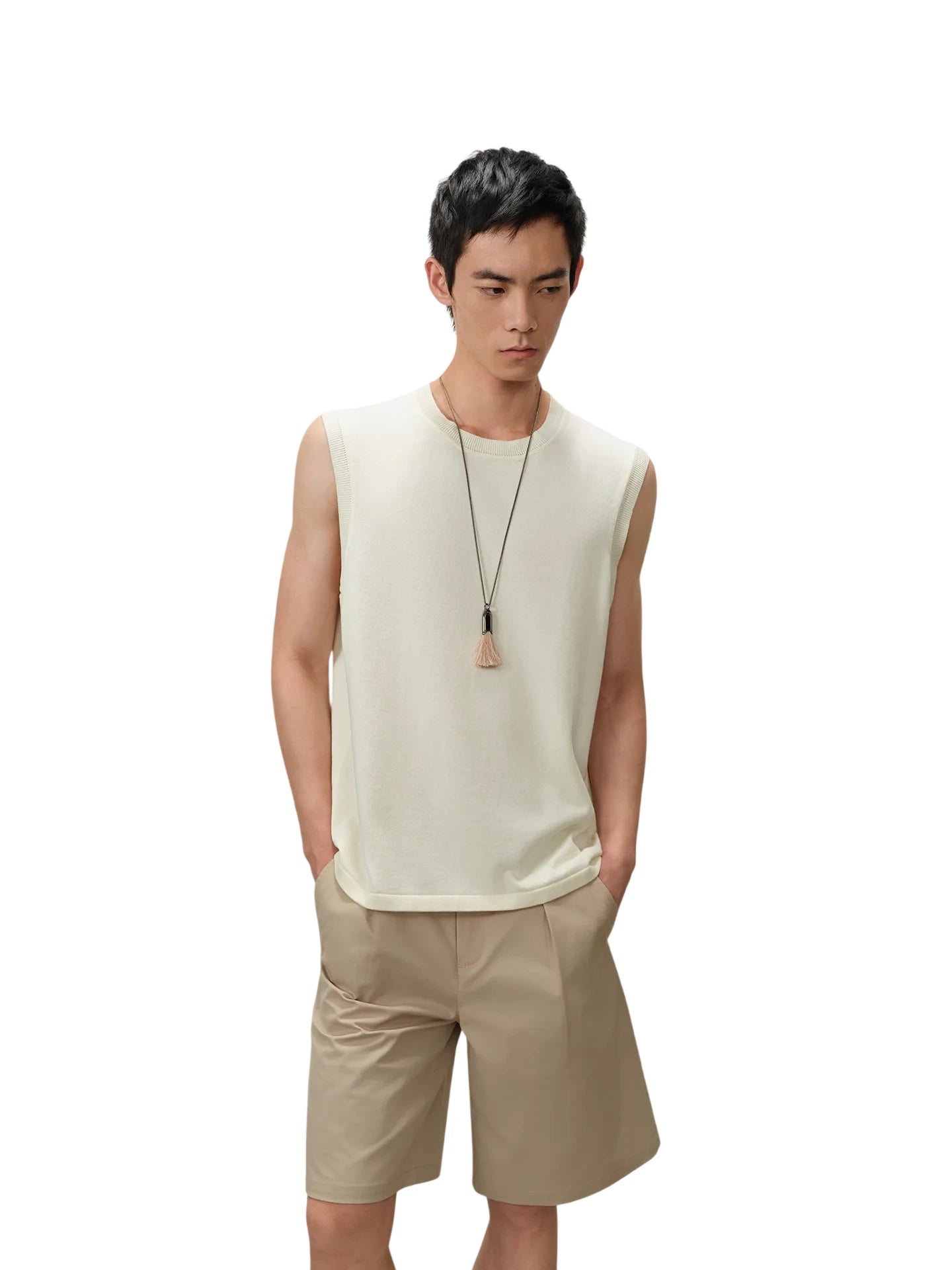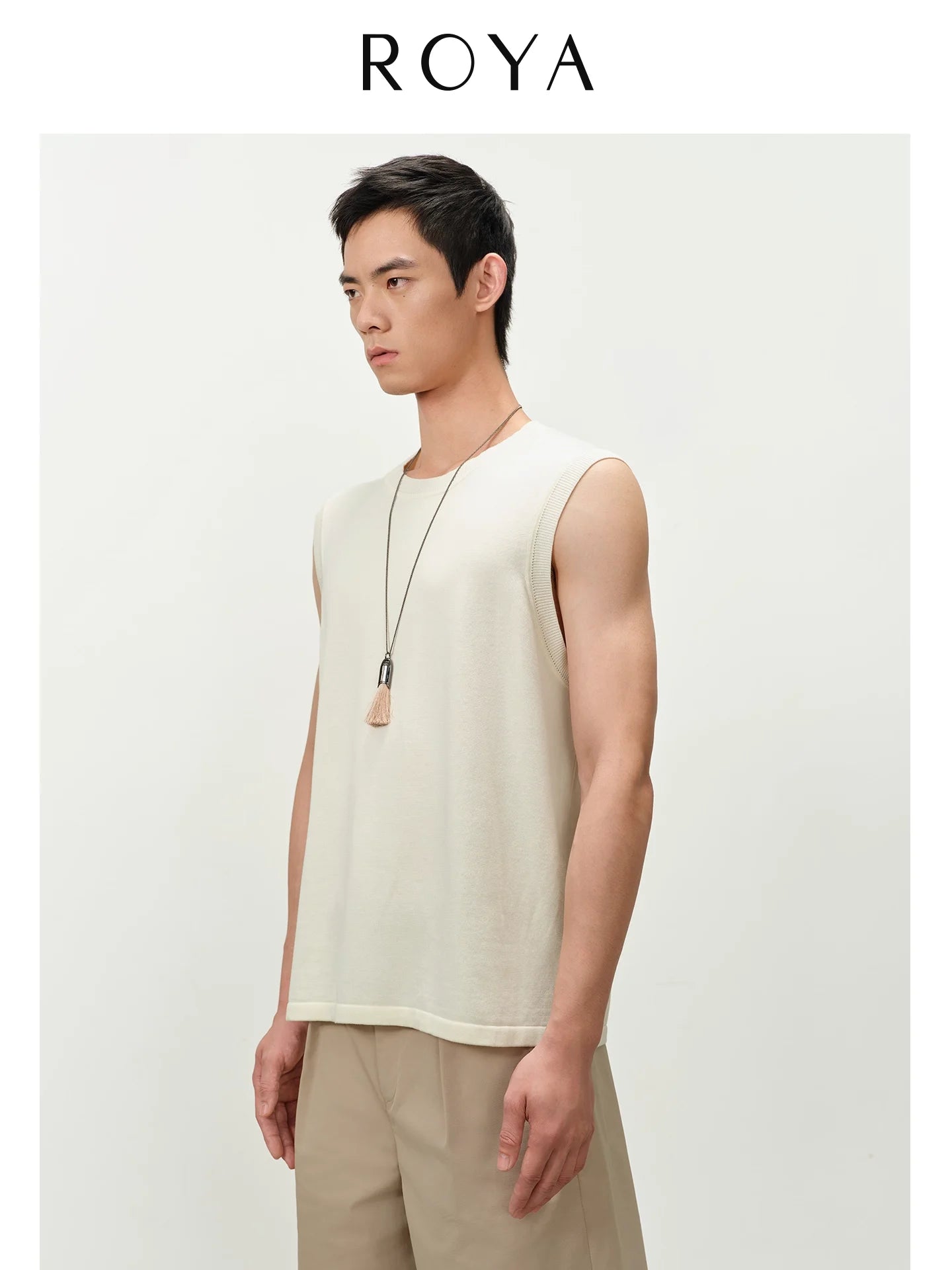 This men's sleeveless knit top combines the softness of viscose with the breathability of cotton for all-day comfort. Featuring a smooth drape and a refined, minimalist silhouette, it is designed with a crew neckline and a subtly tailored fit. The lightweight knit fabric offers natural ventilation and a premium feel, making it a versatile addition to casual and smart-casual wardrobes. Ideal for warm-weather layering, this top exudes understated elegance and effortless style.