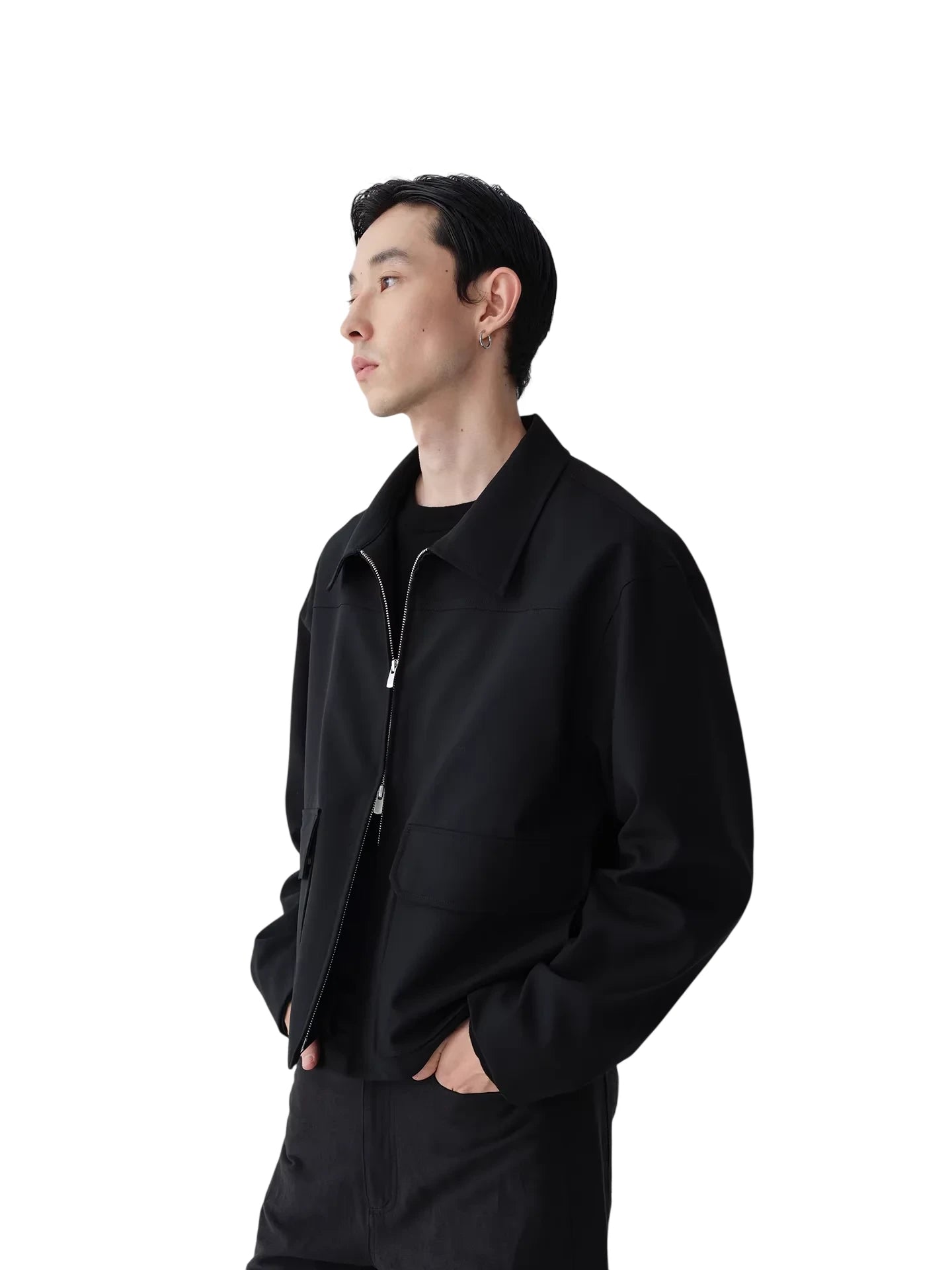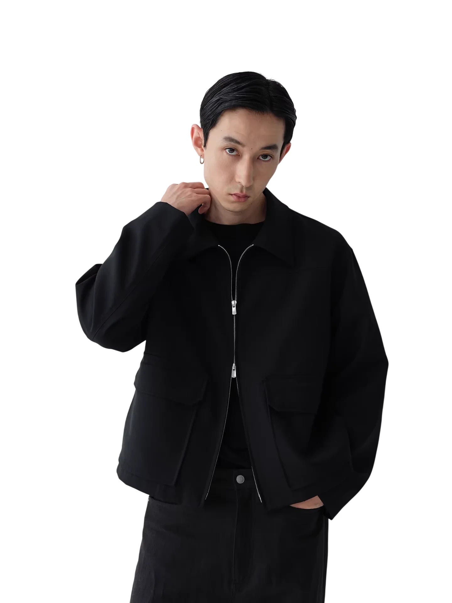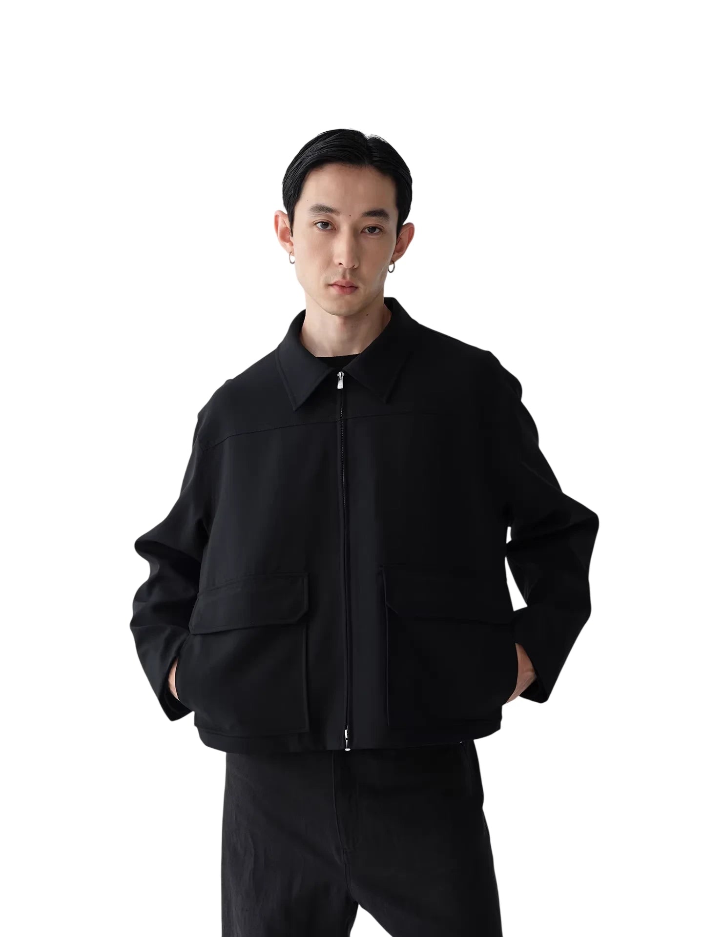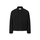 This black zip-up short jacket is crafted from 100% merino wool for a refined and comfortable wear. Featuring a structured boxy silhouette, it includes a spread collar and two large front flap pockets for a functional yet minimalist design. The silver front zipper offers a subtle contrast, enhancing the jacket's sleek look. Designed for men, this jacket pairs effortlessly with monochrome outfits for a modern, elevated appearance.