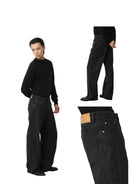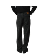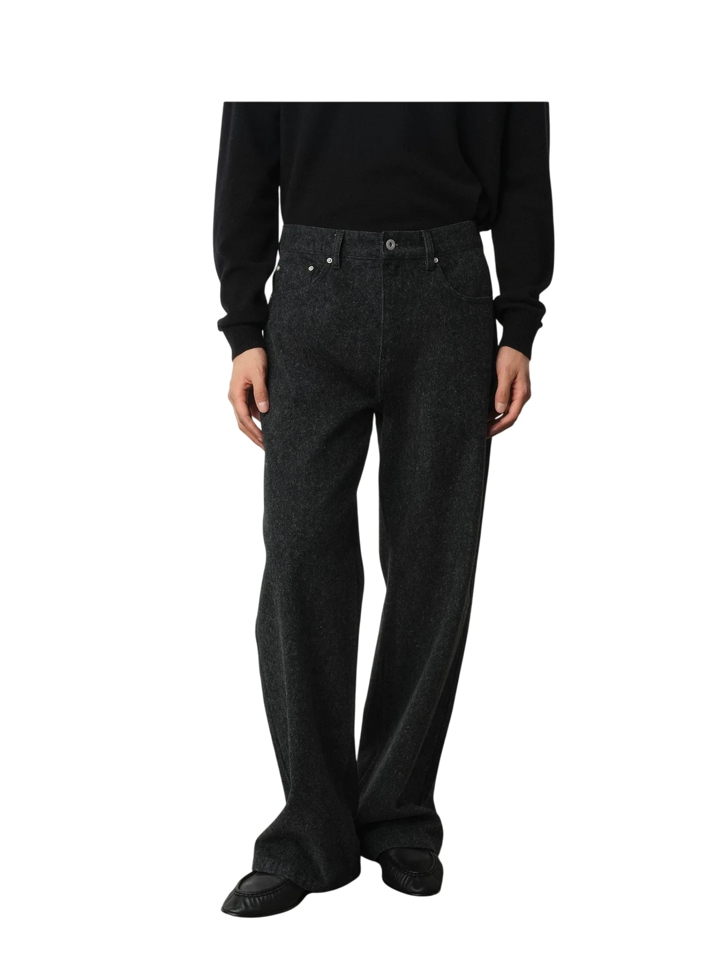 Crafted for men, these heather grey trousers feature a sueded, brushed finish with a denim-inspired texture. Designed with a wide-leg silhouette and relaxed fit, they offer classic five-pocket styling, a button closure, and belt loops. The soft, wool-blend fabric drapes naturally for an effortlessly sophisticated look, ideal for minimalist wardrobes.