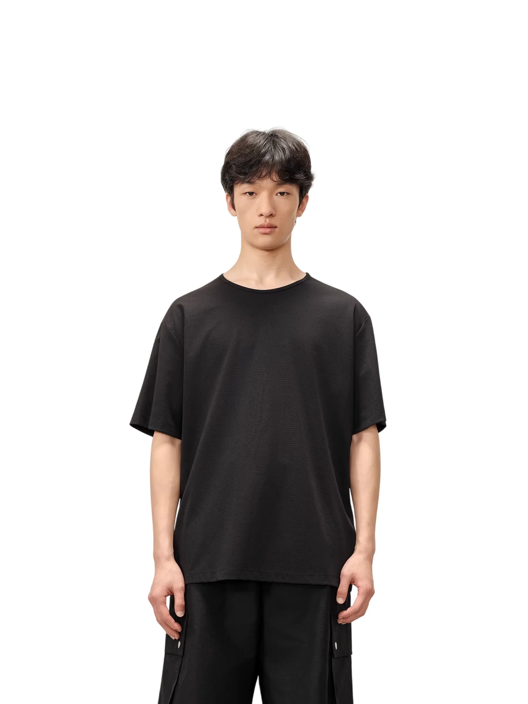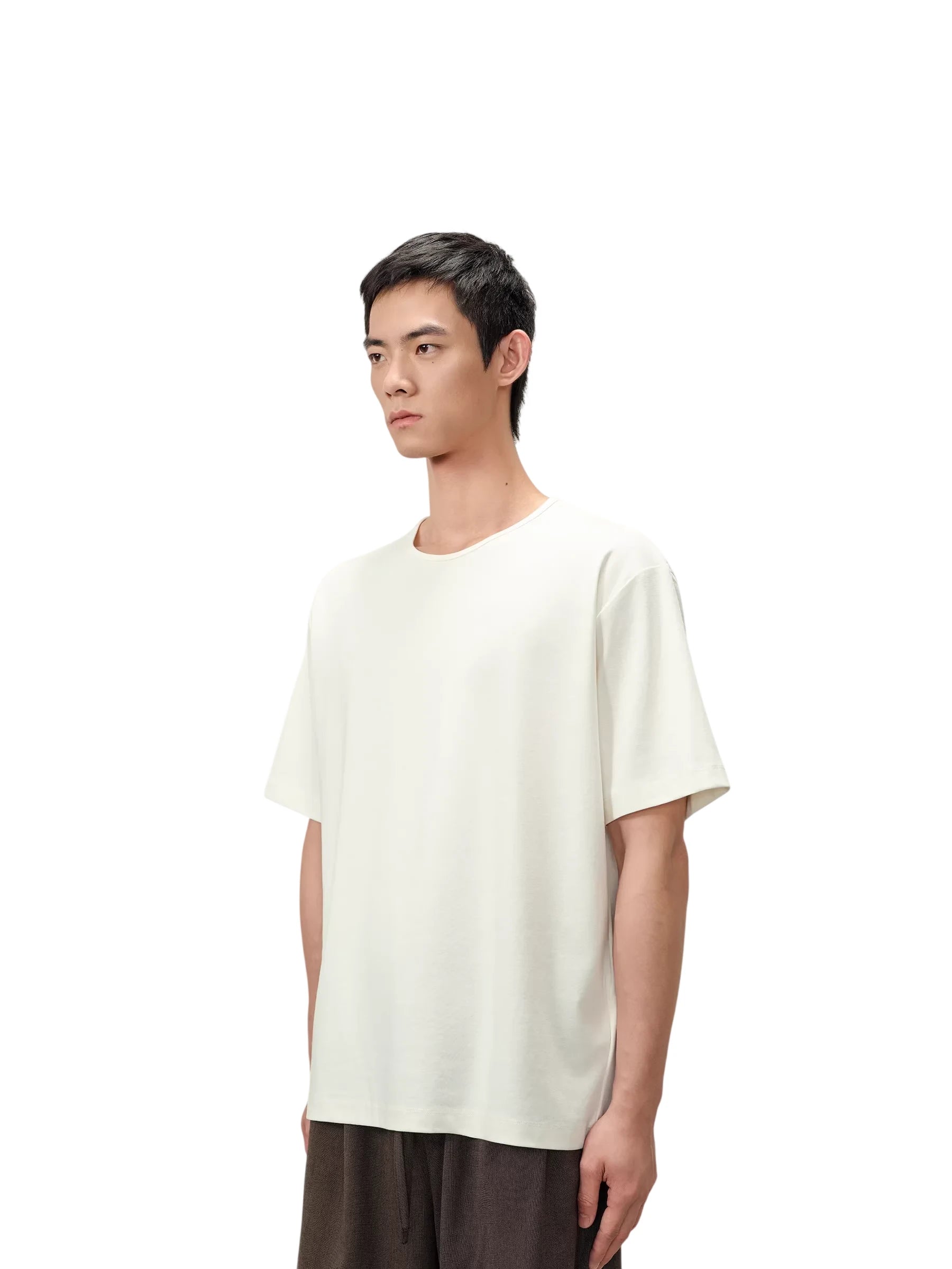 Elevate your casual wardrobe with this men's short sleeve crew neck T-shirt, crafted from a soft and breathable modal wool blend. Designed with subtle textured stripes and a slight drop shoulder for a relaxed fit, it's ideal for layering or wearing on its own. The off-white hue and basic styling make it a versatile piece for everyday wear.