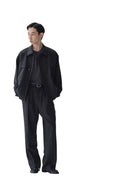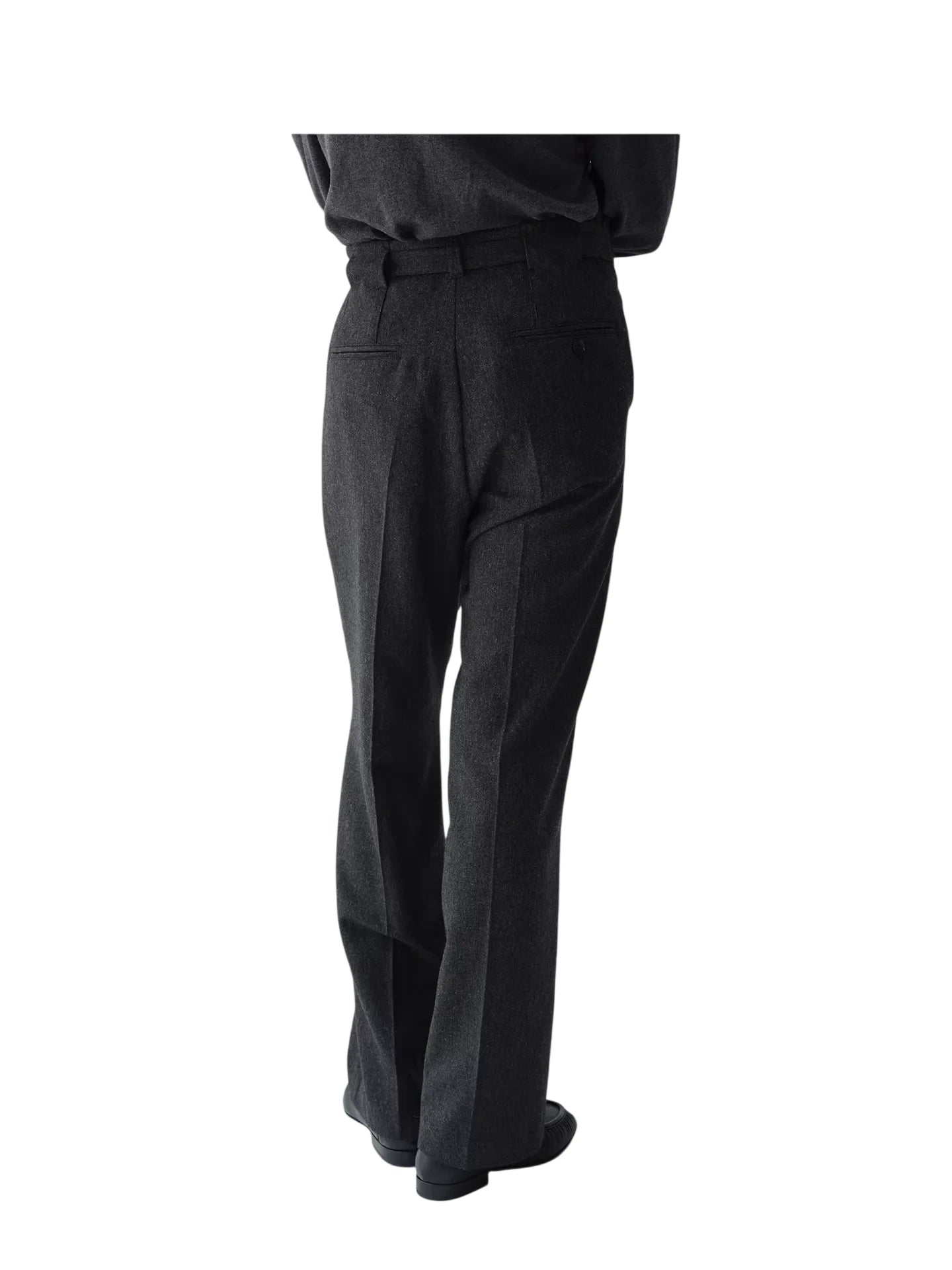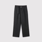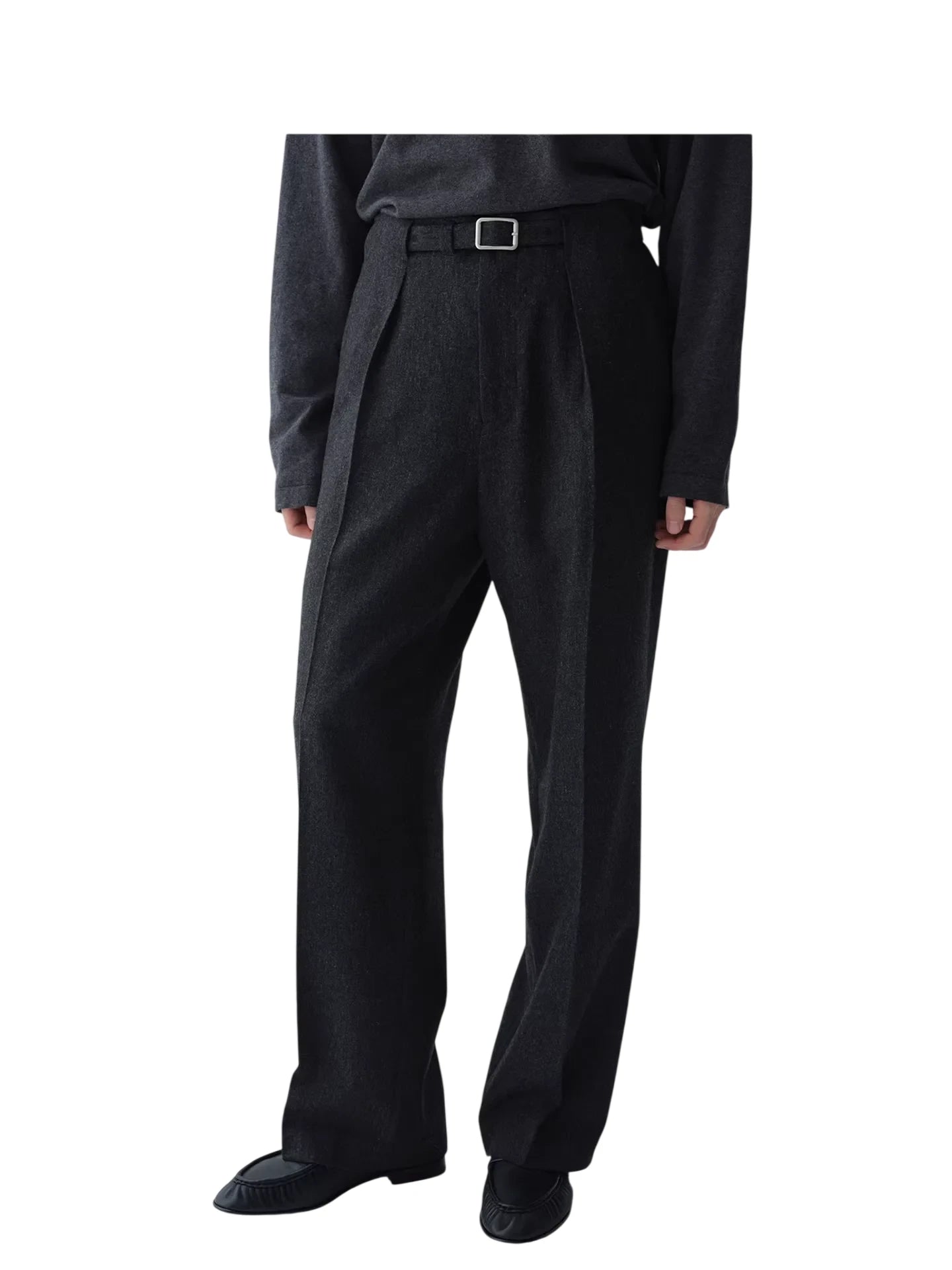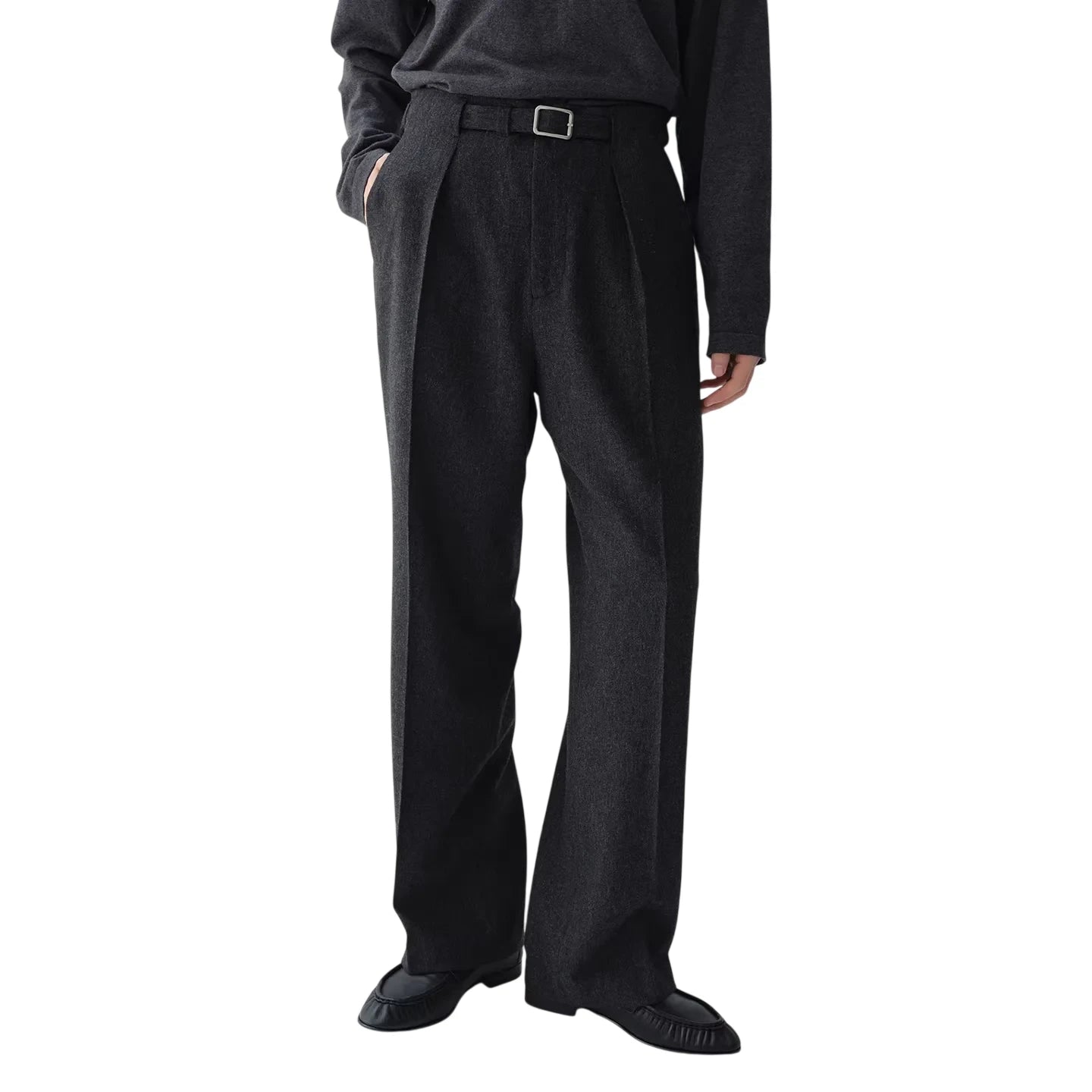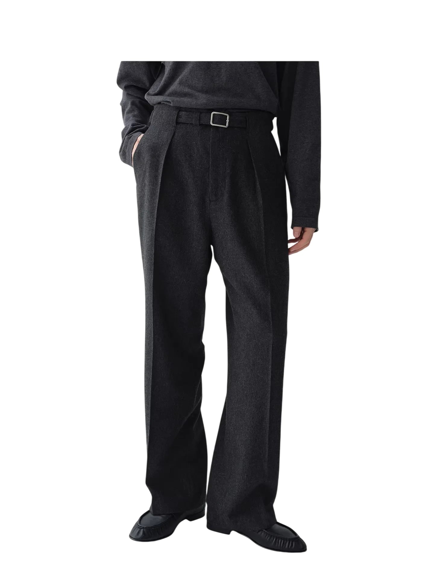These elegant dark heather gray trousers are crafted from 100% Australian wool, offering warmth and refined comfort. Designed for women, they feature a high-waisted silhouette with double front pleats for a tailored, structured look. A matching fabric belt with a square metal buckle enhances the waistline, while the wide-leg cut ensures ease of movement. Side pockets add functionality, making these trousers ideal for both professional and casual settings.