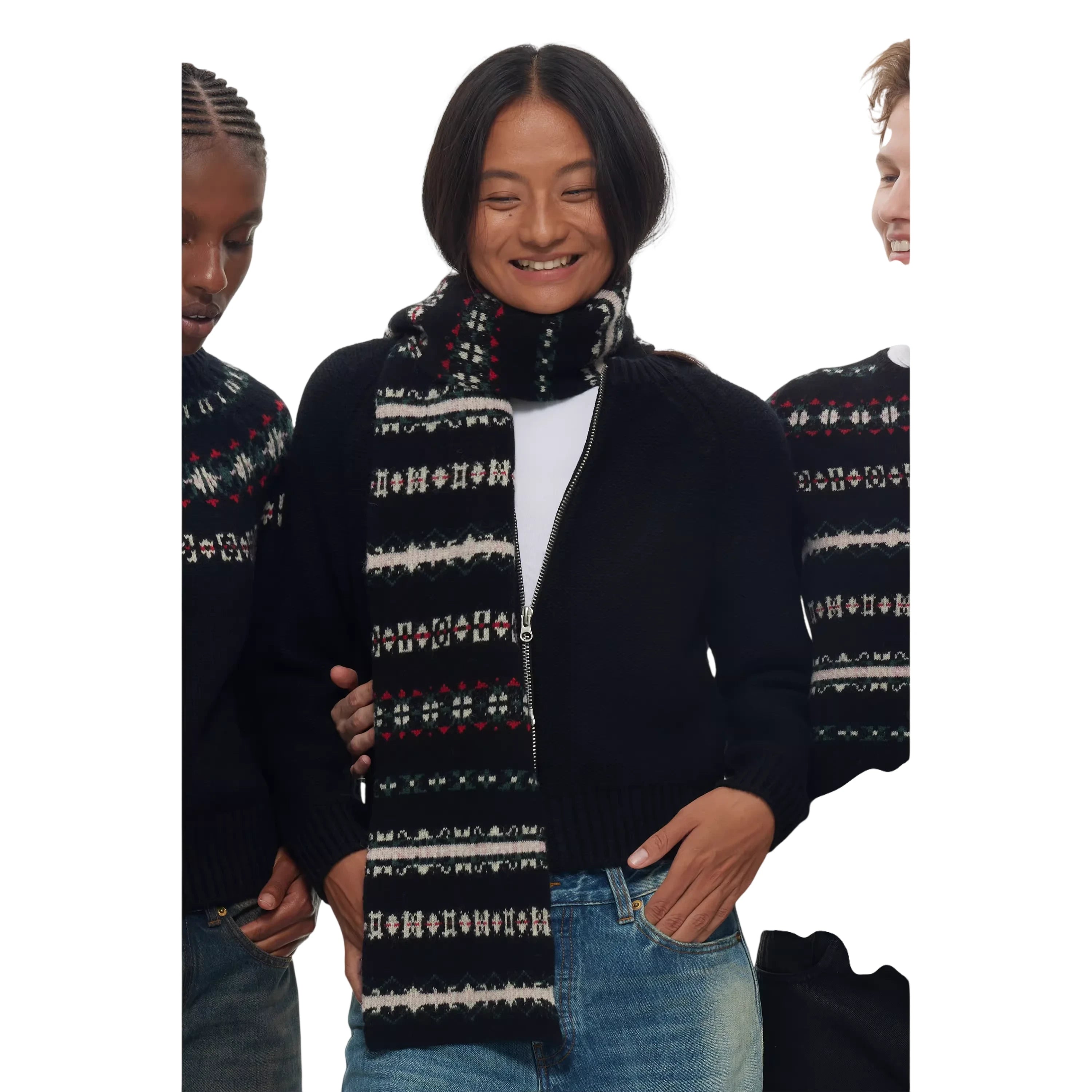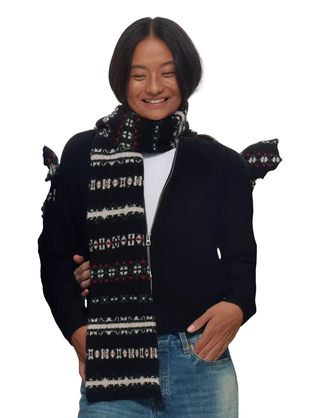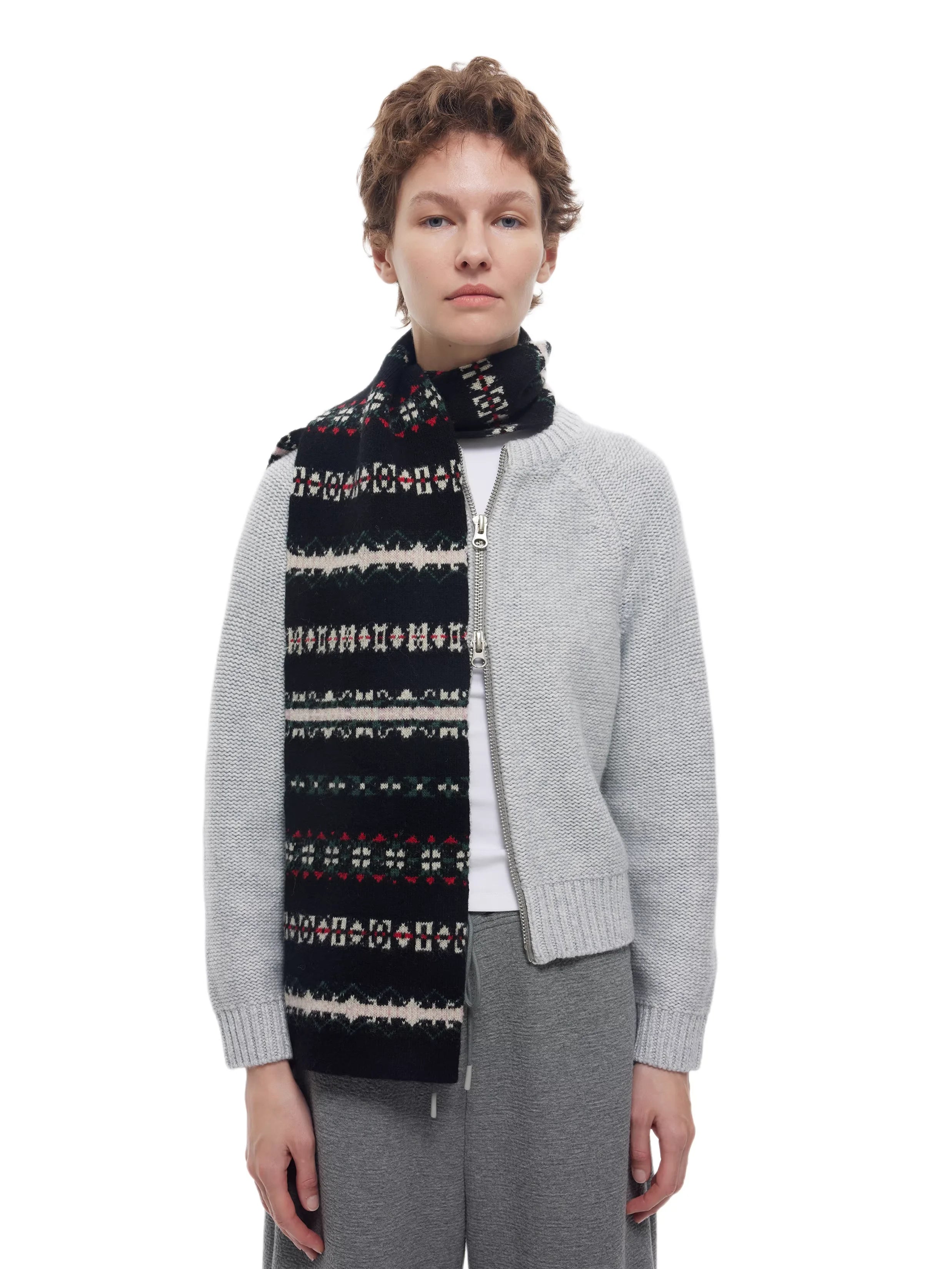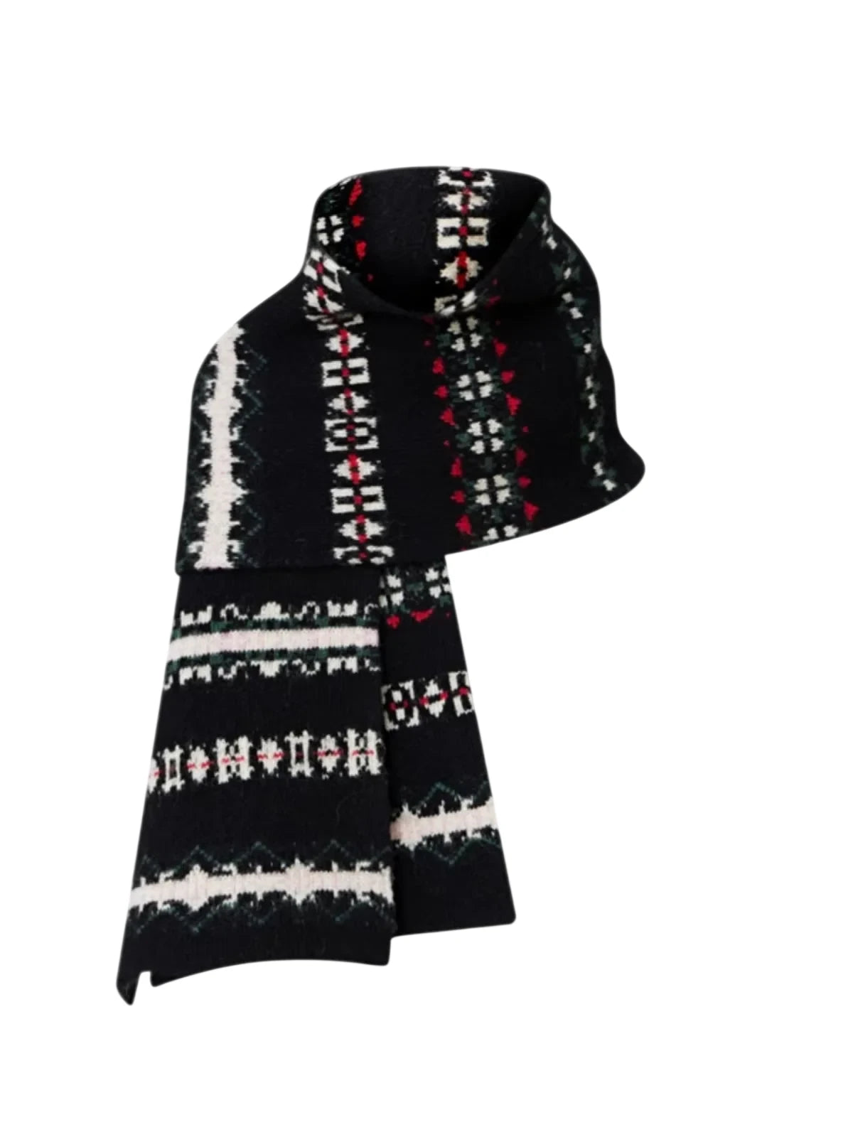 Wrap up in Nordic charm with this women's Icelandic pattern wool scarf. Featuring a traditional Fair Isle jacquard design in black, white, red, and green, this cozy accessory brings timeless winter style to your wardrobe. Crafted for warmth and visual appeal, the scarf is perfect for pairing with knitwear and denim for a classic seasonal look.