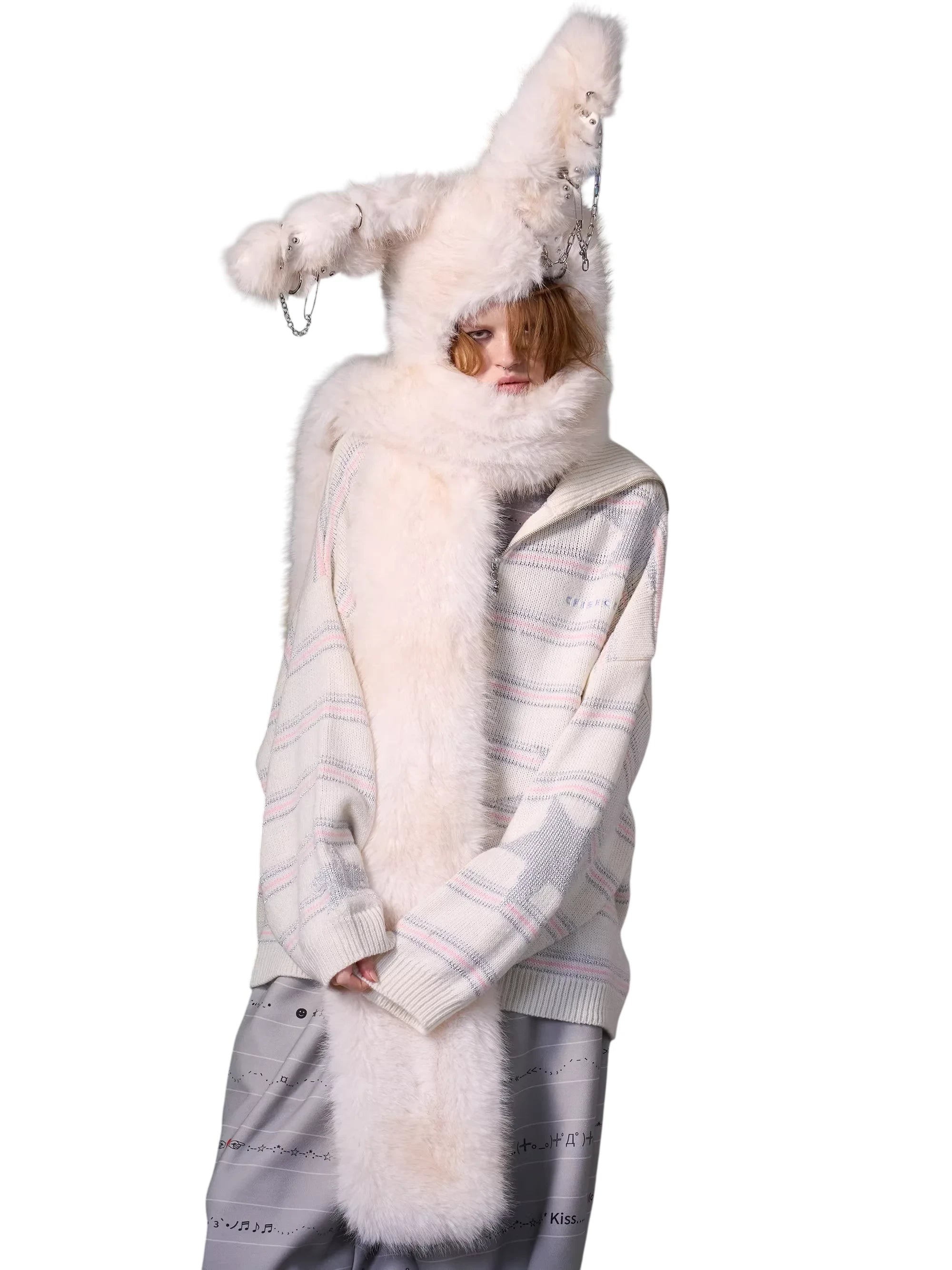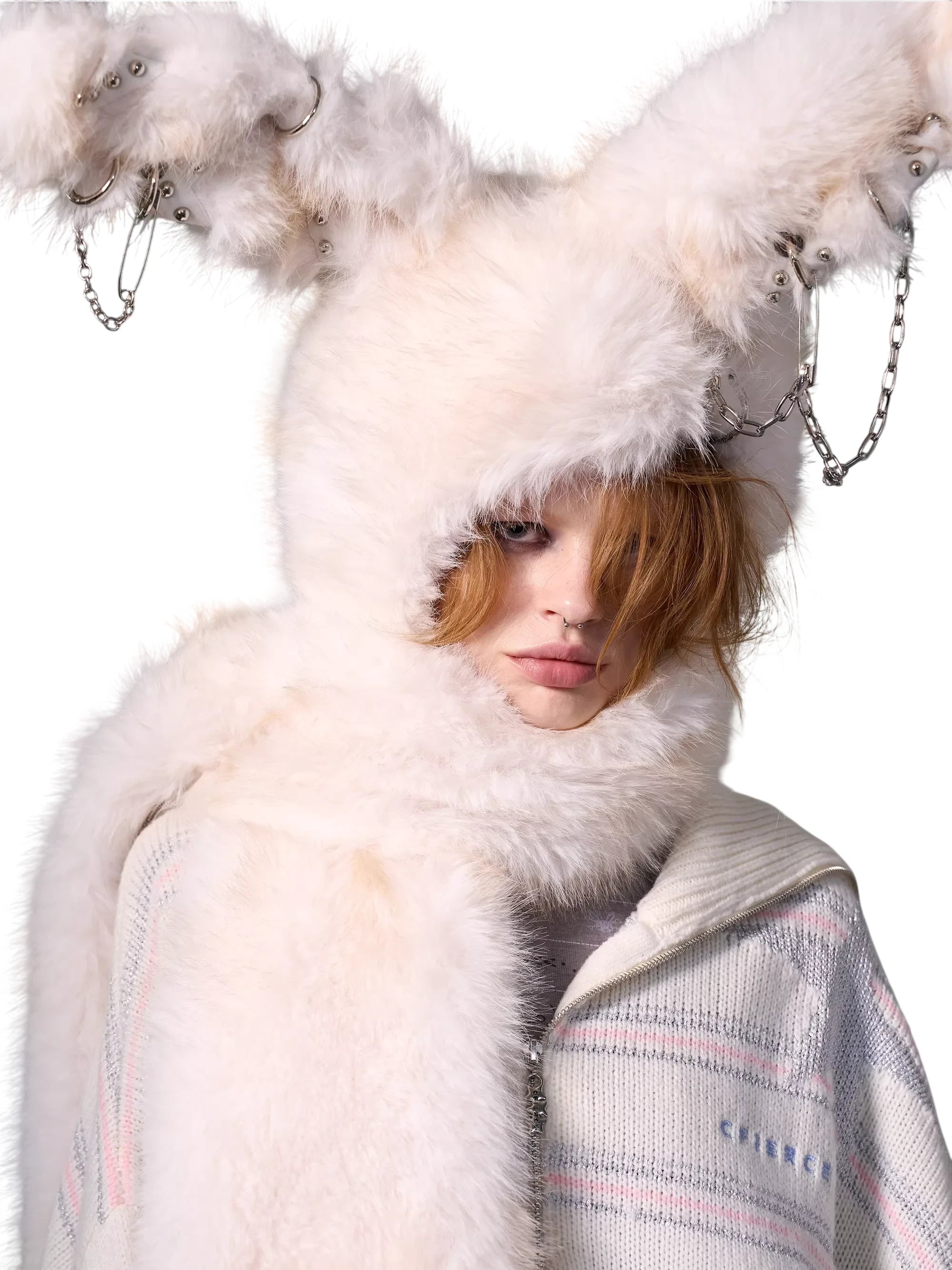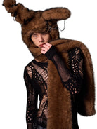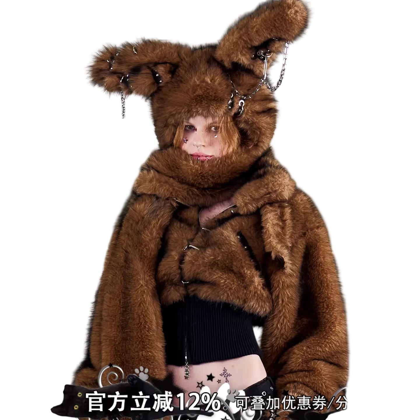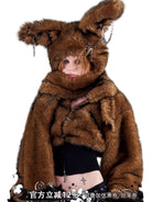 Make a bold fashion statement with this women's faux fur jacket featuring a playful bunny-inspired design. The plush cropped jacket includes an oversized hood with tall bunny ears, complete with edgy metal chain appliqués. Designed for warmth and style, this thick coat brings a unique twist to winter wear, perfect for those who enjoy alternative or street fashion.