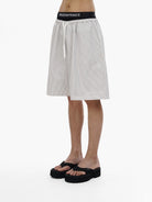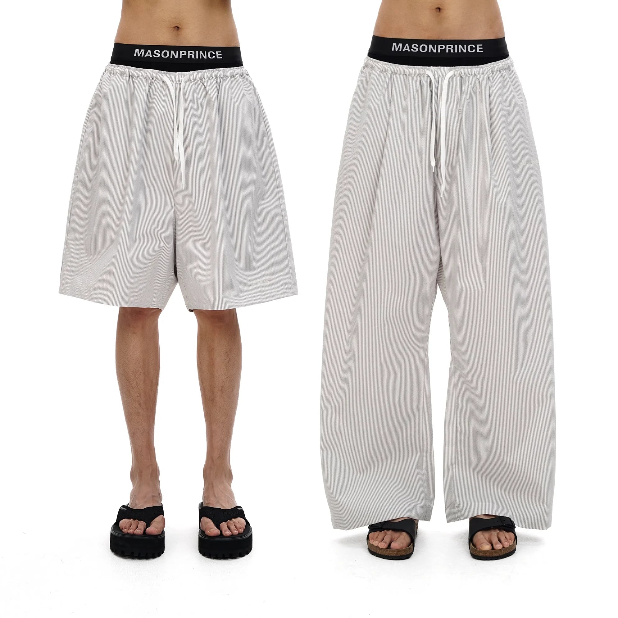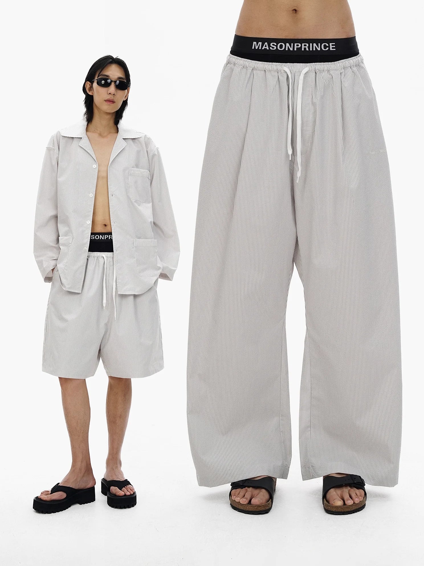 Experience all-day comfort and relaxed style with this new arrival in men's homewear. Crafted from lightweight, breathable fabric with subtle pinstripe detailing, this bottom wear set includes two variations: knee-length shorts and full-length wide-leg pants. Both styles feature an elastic waistband with a contrasting branded band and an adjustable drawstring for a secure and personalized fit. Ideal for lounging or casual outings, these pieces combine functionality with effortless style.