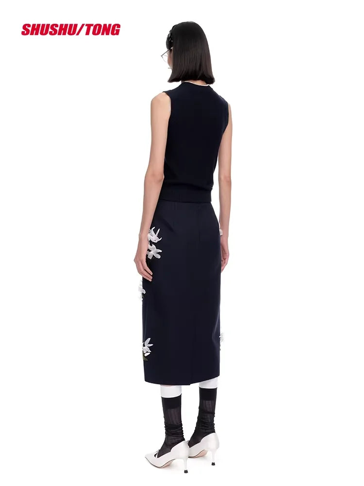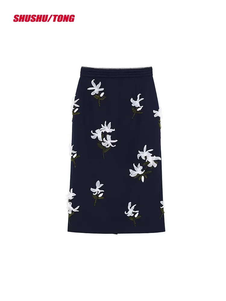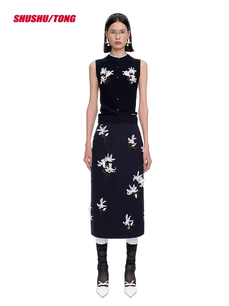 shushutong Elegant Black Midi Skirt with Floral Appliqué