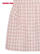 This women's sleeveless mini dress features a soft pink and white gingham check pattern for a sweet, feminine look. The fitted bodice includes a structured design with a double bow detail at the bust and a subtle sweetheart neckline. Thin spaghetti straps provide delicate support, while the slightly flared skirt adds playful elegance. Perfect for adding charm to any warm-weather occasion.