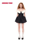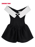 This stylish off-shoulder mini dress for women showcases a playful and sophisticated silhouette. The voluminous gathered skirt adds movement and charm, while the striking oversized white collar with a delicate black bow at the center offers a chic contrast. Designed in classic black, this dress is perfect for modern, fashion-forward looks. Complete with mid-calf white socks and heels, it delivers a polished and statement-ready ensemble.
