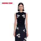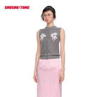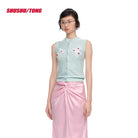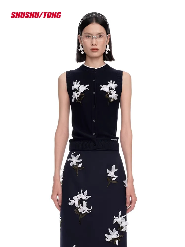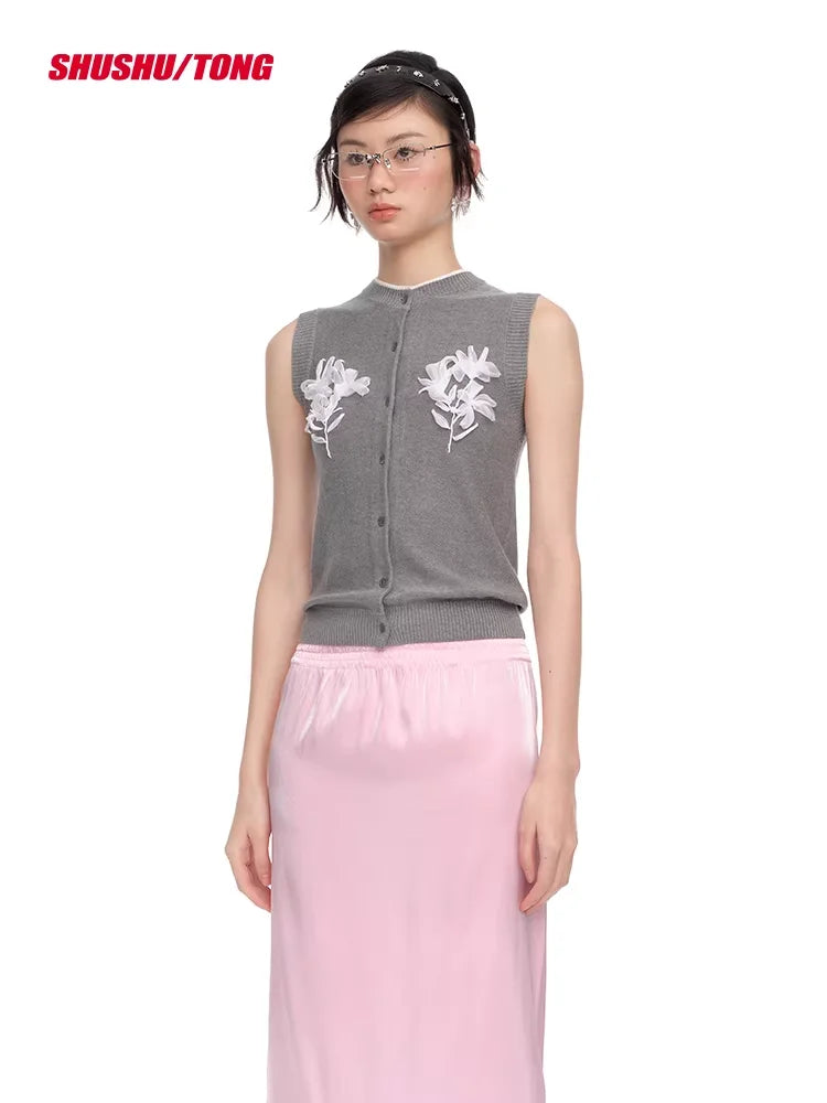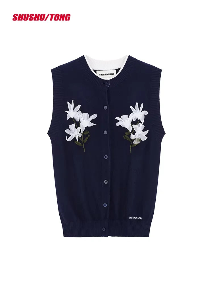 shushutong Sleeveless Knitted Cardigan with Floral Ribbon Embroidery