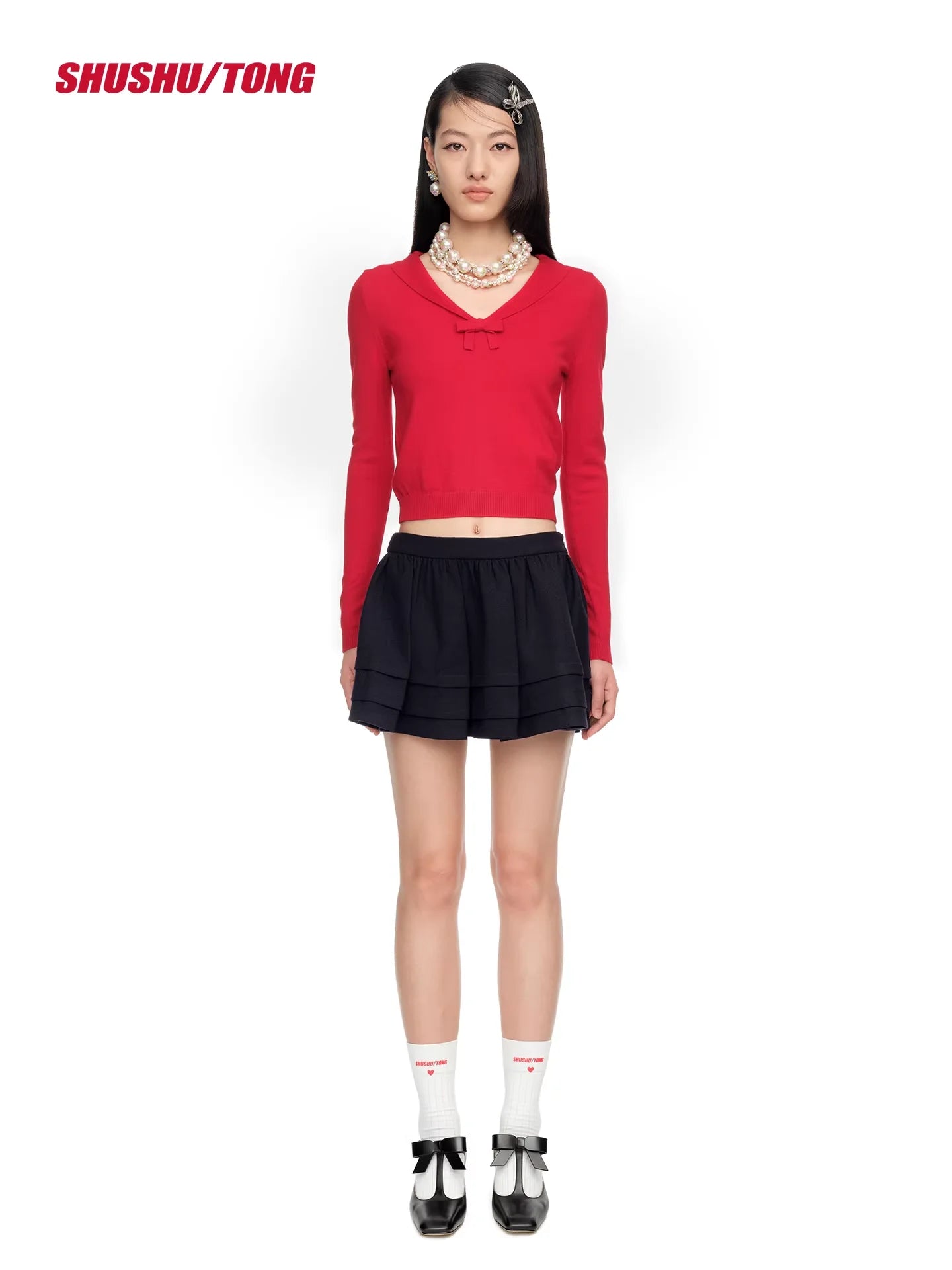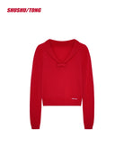 This chic women's knit top is a perfect addition to your spring and summer wardrobe. Featuring a vibrant red hue, the design includes long sleeves, a cropped silhouette, and a stylish V-neckline accented with a delicate bow at the center. The small lapel adds a touch of elegance to the otherwise casual and trendy piece. Ideal for both daily commutes and casual outings, it effortlessly blends fashion and functionality for a polished, modern look.
